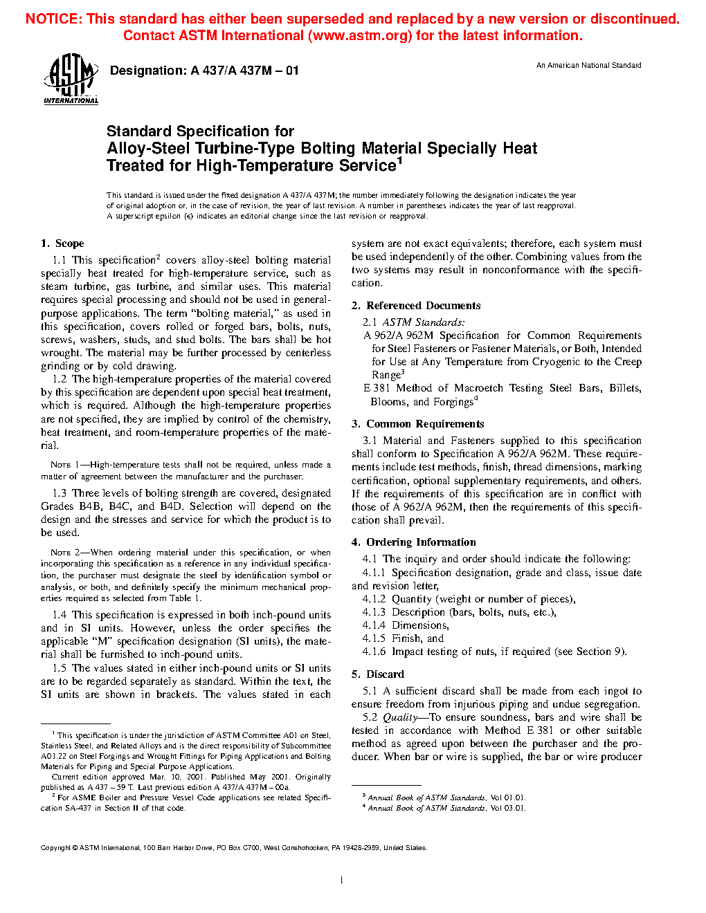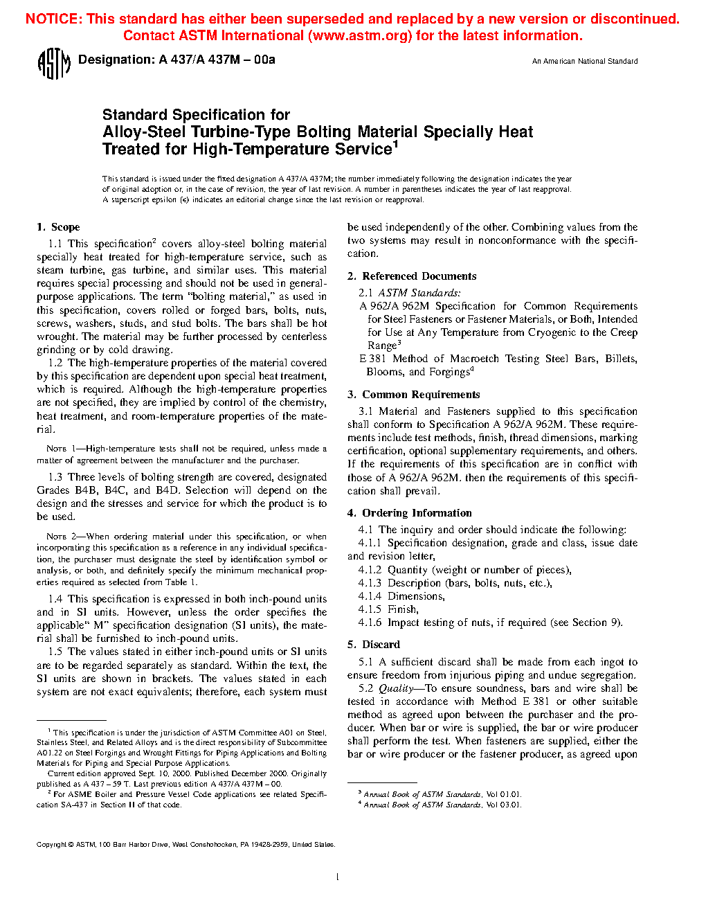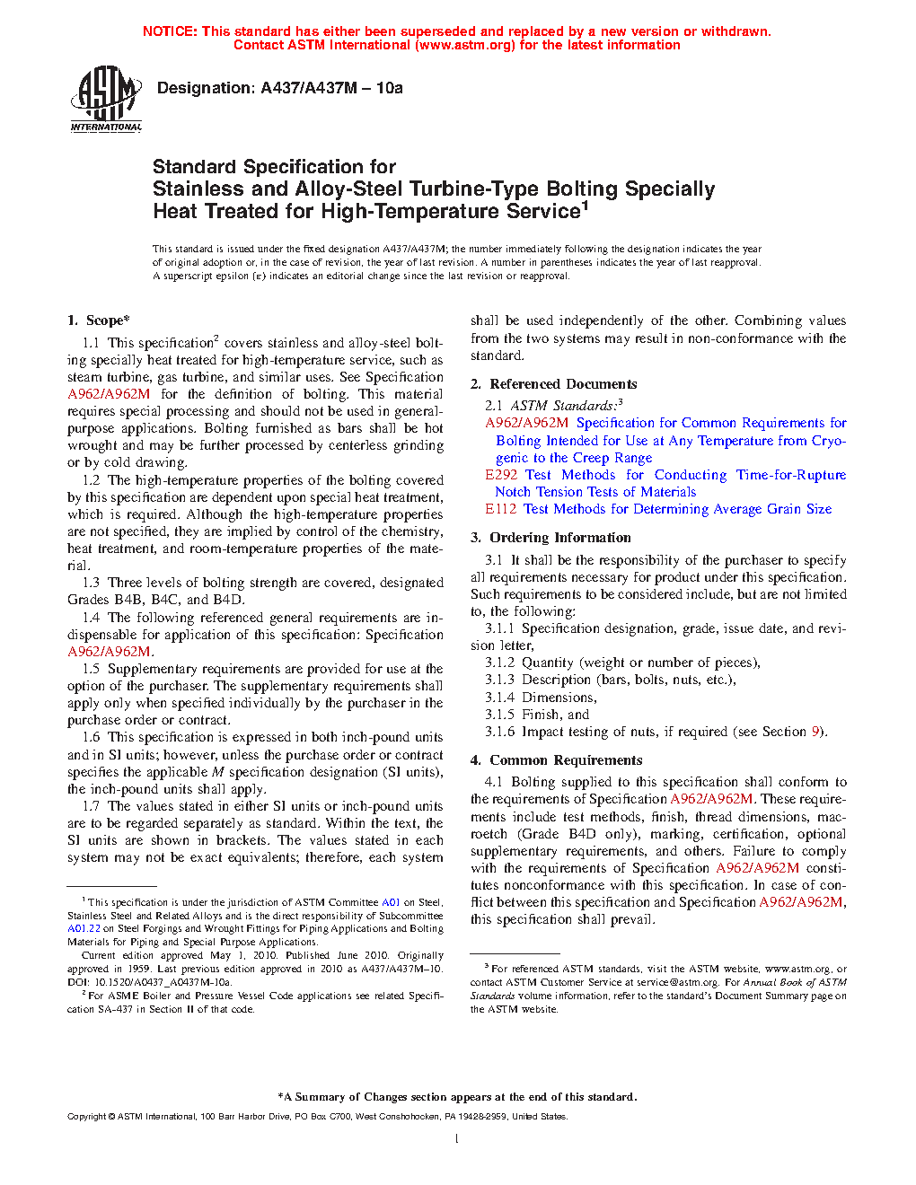 1.1Â This specification covers stainless and alloy-steel bolting material and bolting components specially heat treated for high-temperature service, such as steam turbine, gas turbine, and similar uses. See Specification A962/A962M for the definition of bolting. This material requires special processing and should not be used in general-purpose applications. Bolting furnished as bars shall be hot wrought and may be further processed by centerless grinding or by cold drawing.