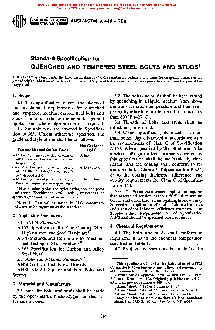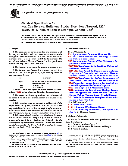 1.1 This specification covers the chemical and mechanical requirements for two types of quenched and tempered steel bolts and studs for general applications where high strength is required.