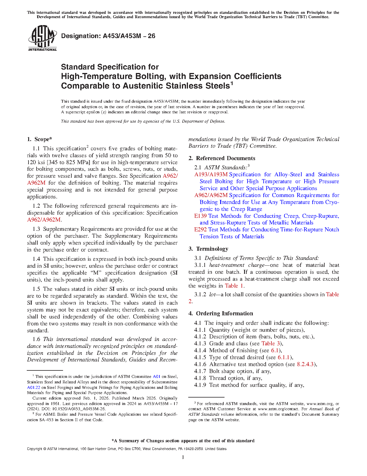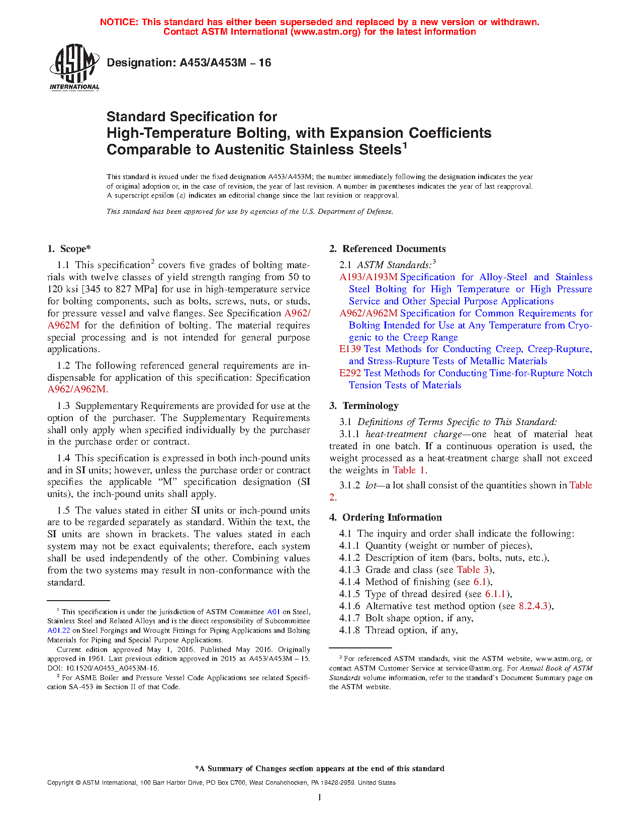 1.1 This specification2 covers five grades of bolting materials with twelve classes of yield strength ranging from 50 to 120 ksi [345 to 827 MPa] for use in high-temperature service for bolting components, such as bolts, screws, nuts, or studs, for pressure vessel and valve flanges. See Specification A962/A962M for the definition of bolting. The material requires special processing and is not intended for general purpose applications.