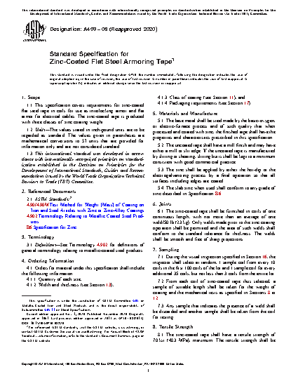 1.1 This specification covers requirements for zinc-coated flat steel tape in coils for use as interlocking armor and flat armor for electrical cables. The zinc-coated tape is produced with three classes of zinc coating weight.
