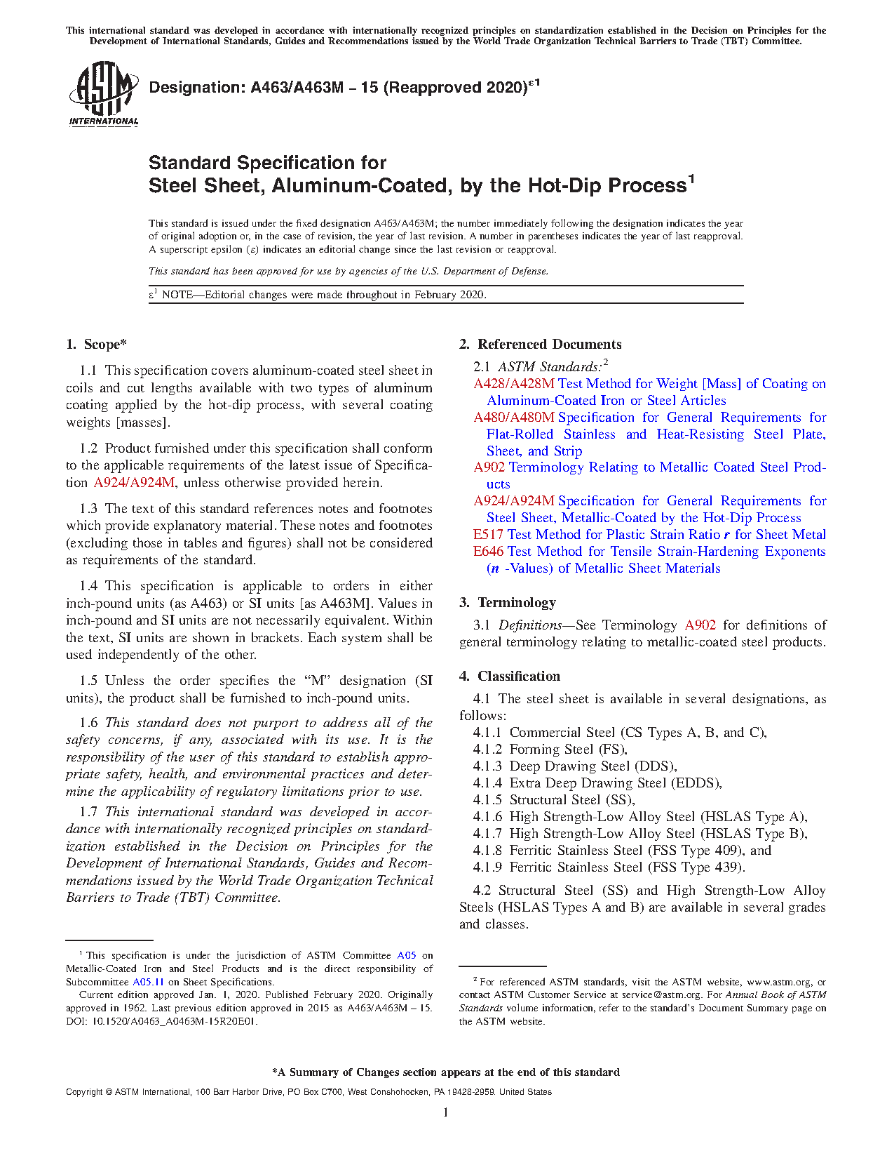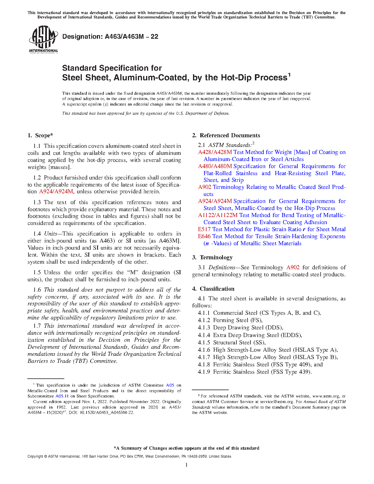 1.1 This specification covers aluminum-coated steel sheet in coils and cut lengths available with two types of aluminum coating applied by the hot-dip process, with several coating weights [masses].