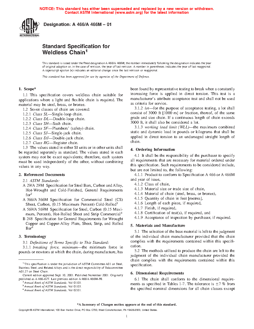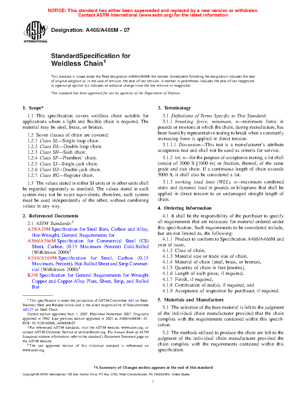 1.1 This specification covers weldless chain suitable for applications where a light and flexible chain is required. The material may be steel, brass, or bronze.