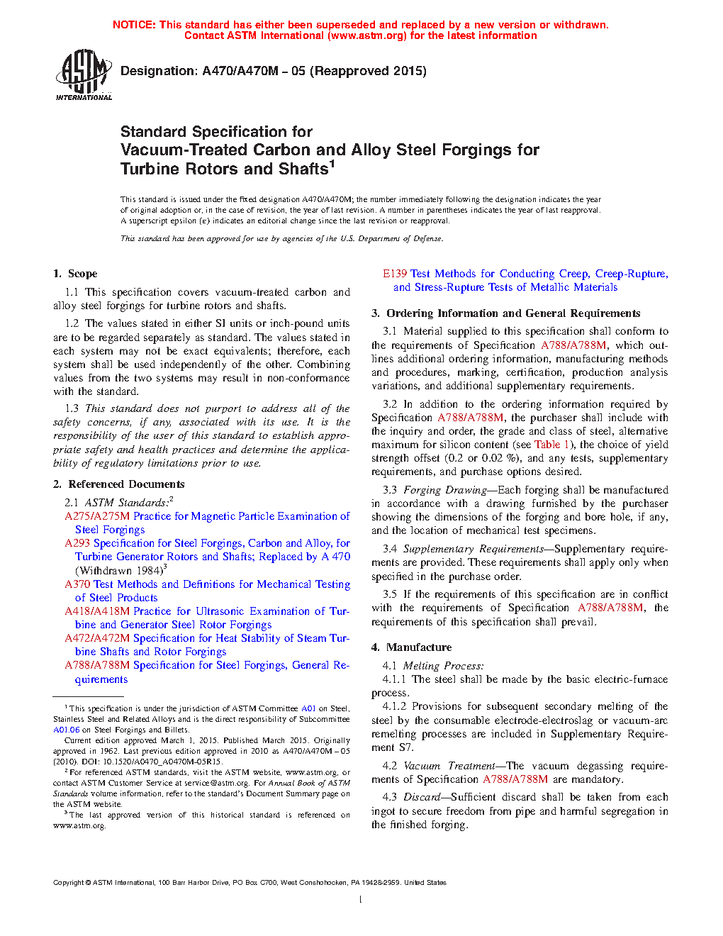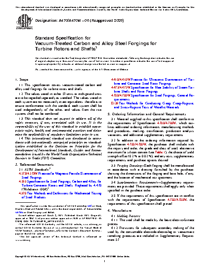 1.1 This specification covers vacuum-treated carbon and alloy steel forgings for turbine rotors and shafts.