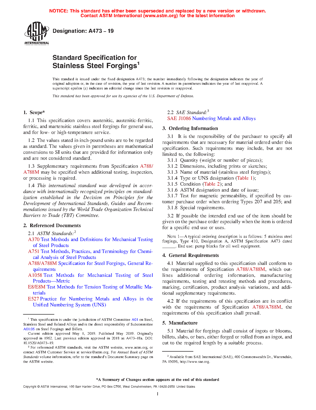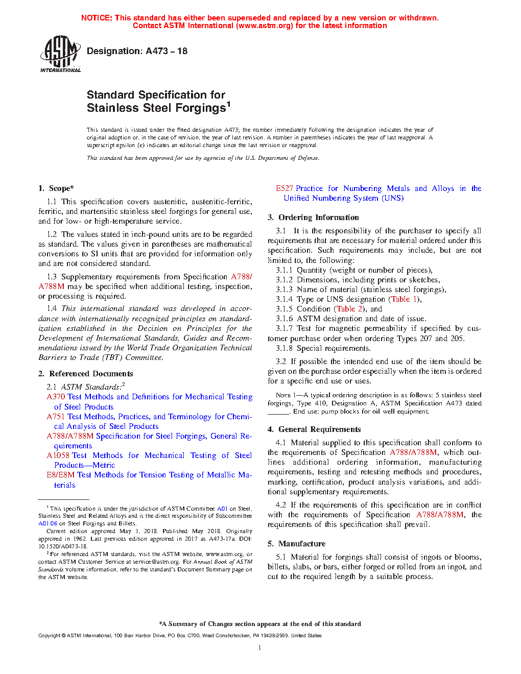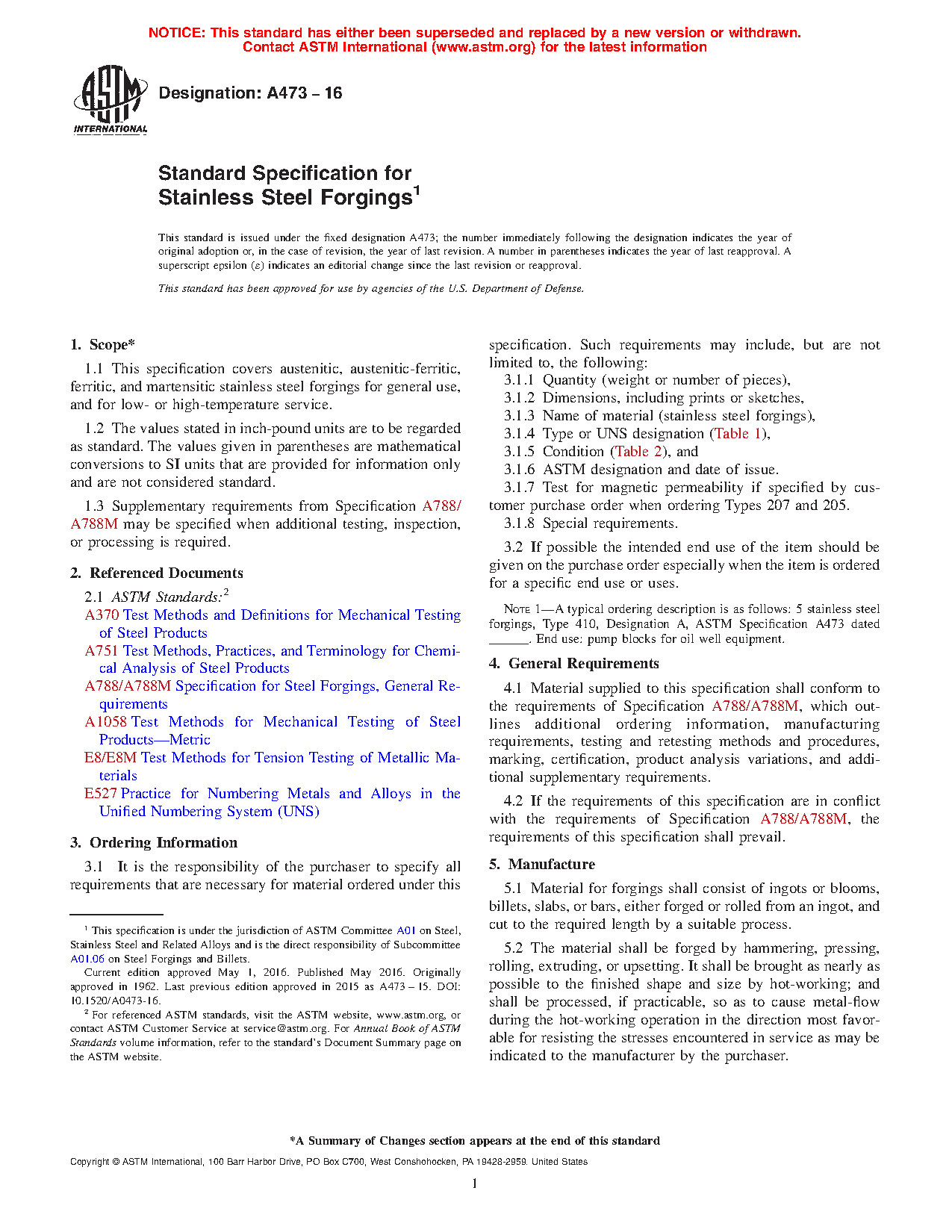 1.1 This specification covers austenitic, austenitic-ferritic, ferritic, and martensitic stainless steel forgings for general use, and for low- or high-temperature service.