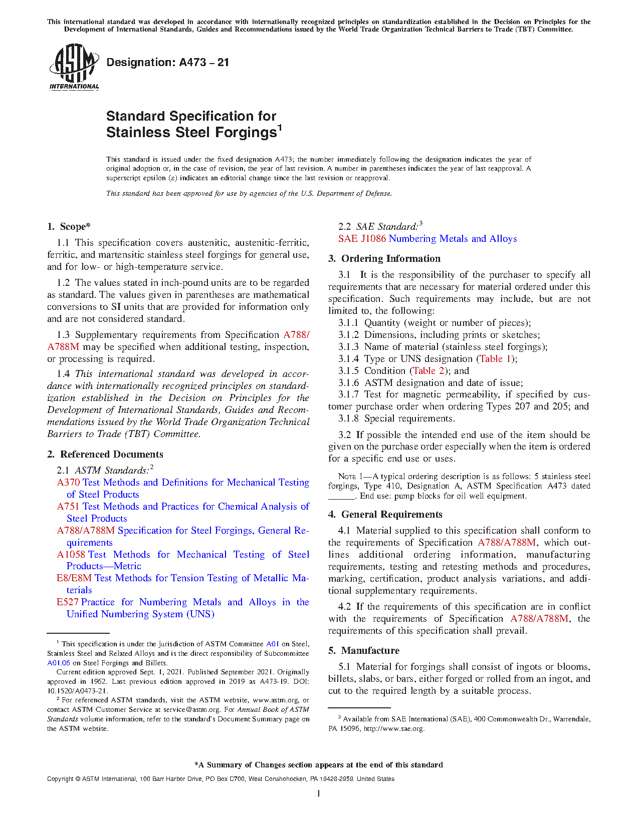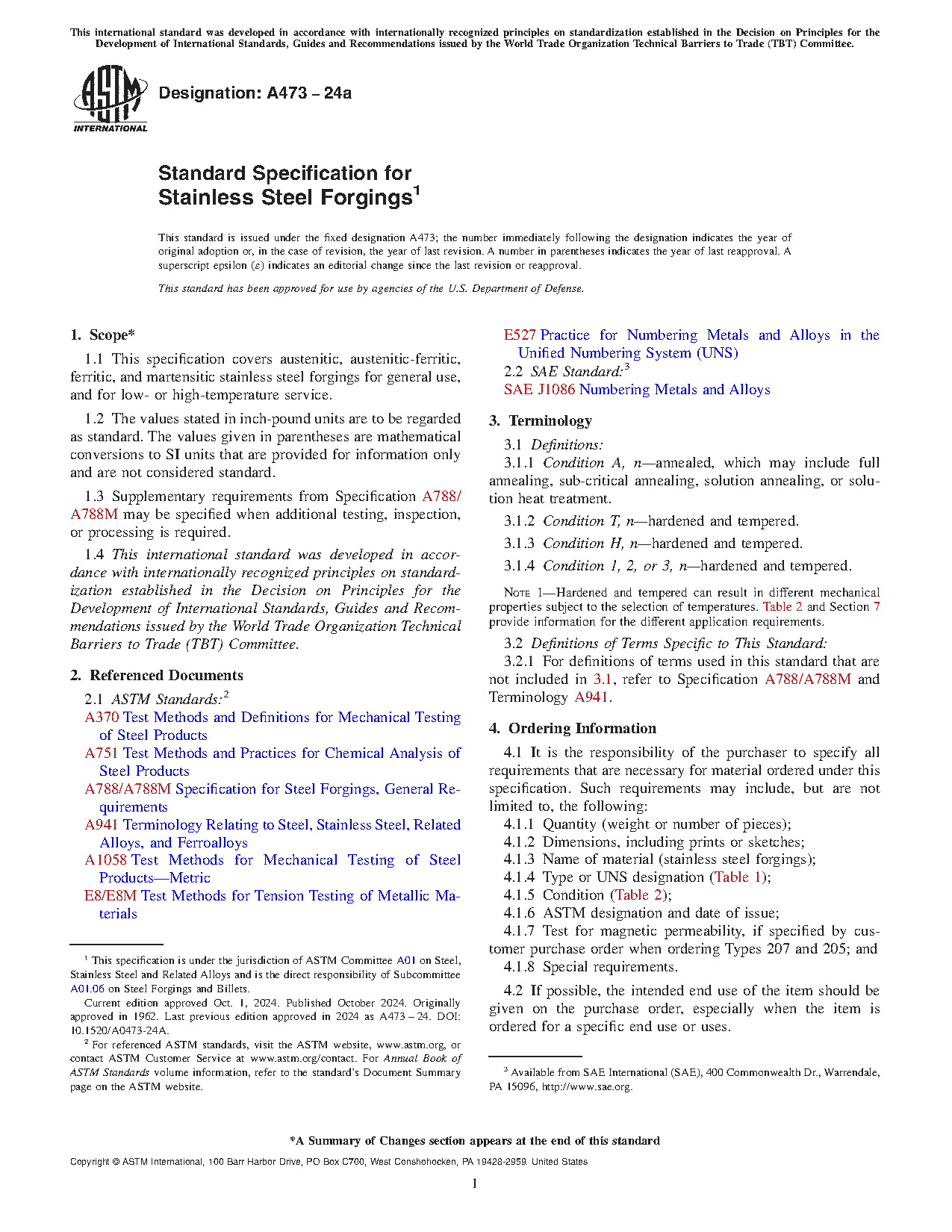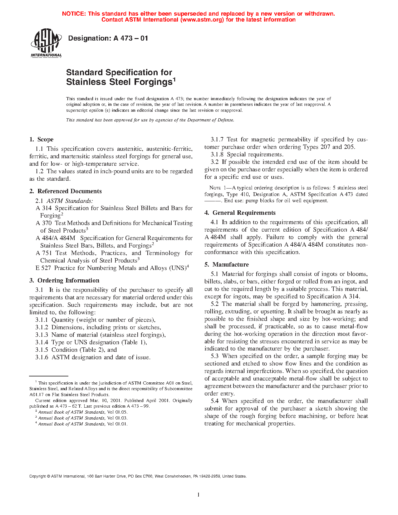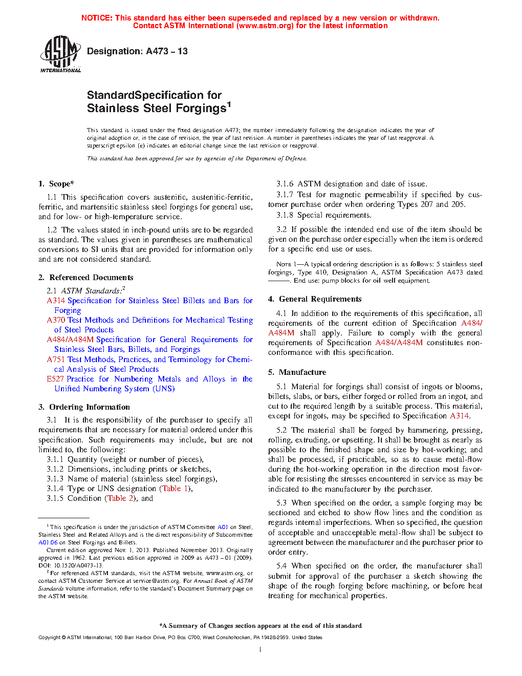 1.1 This specification covers austenitic, austenitic-ferritic, ferritic, and martensitic stainless steel forgings for general use, and for low- or high-temperature service.