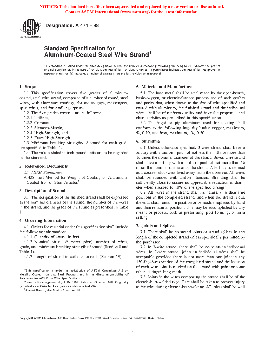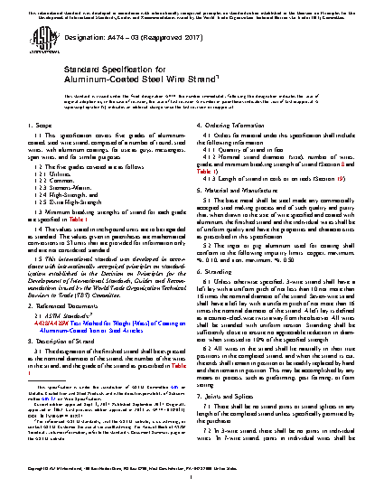 This specification covers five grades of aluminum-coated, steel wire strand composed of a number of round, steel wires, with aluminum coatings, for use as guys, messengers, span wires, and for similar purposed. The five grades are as follows: (1) utilities; (2) common; (3) Siemens-Martin; (4) high-strength; and (5)extra high-strength. The base metal shall be steel made by any commercially steel making process, The ingot or pig aluminum used for coating shall conform to the required impurity limits of copper and iron. All wires shall be stranded with uniform tension. Physical tests shall be performed wherein the steel wire strands shall conform to the required values of breaking strength. The steel specimens shall also conform to the required values of elongation, diameter and weight of coating.