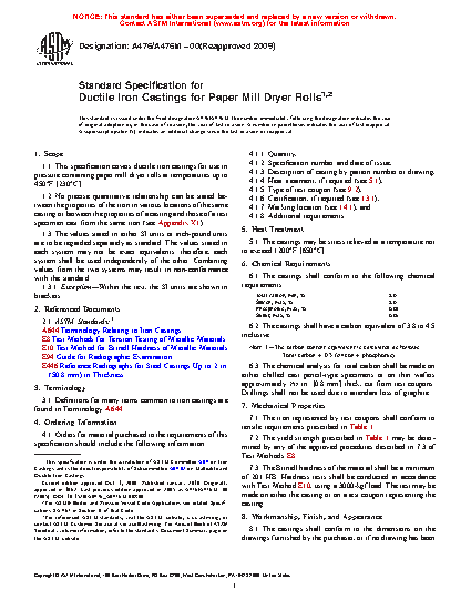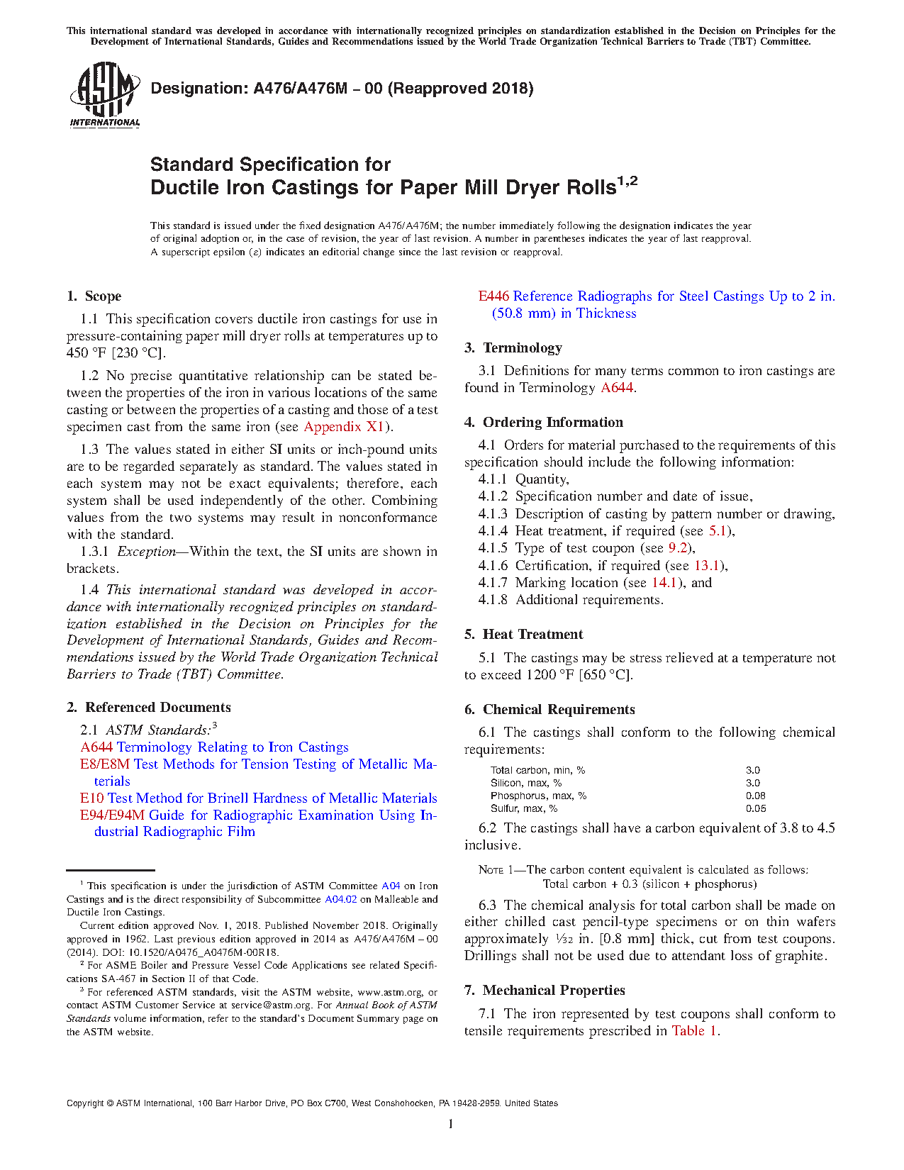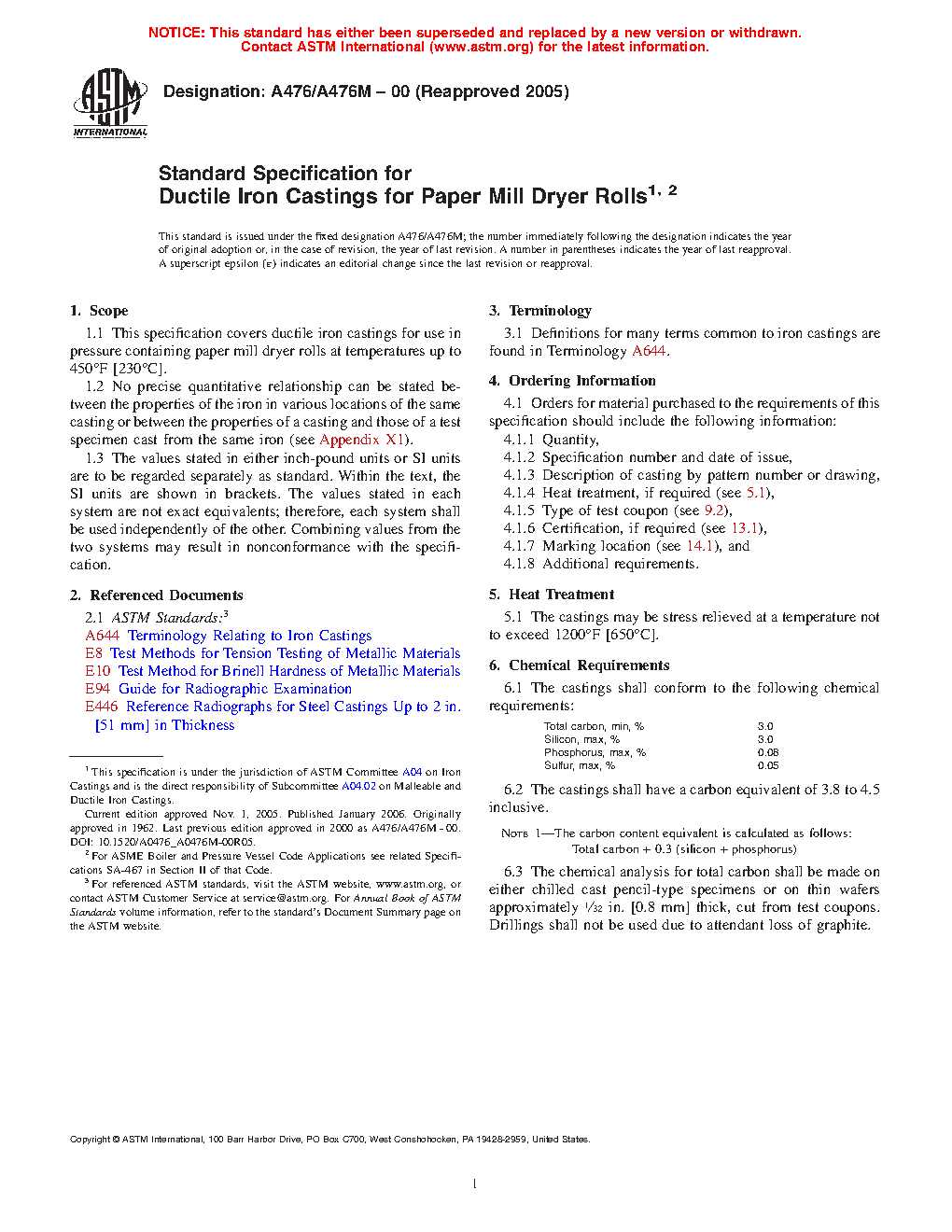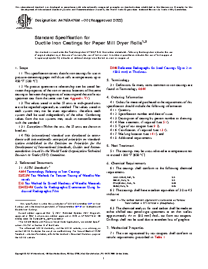 1.1 This specification covers ductile iron castings for use in pressure-containing paper mill dryer rolls at temperatures up to 450 °F [230 °C].