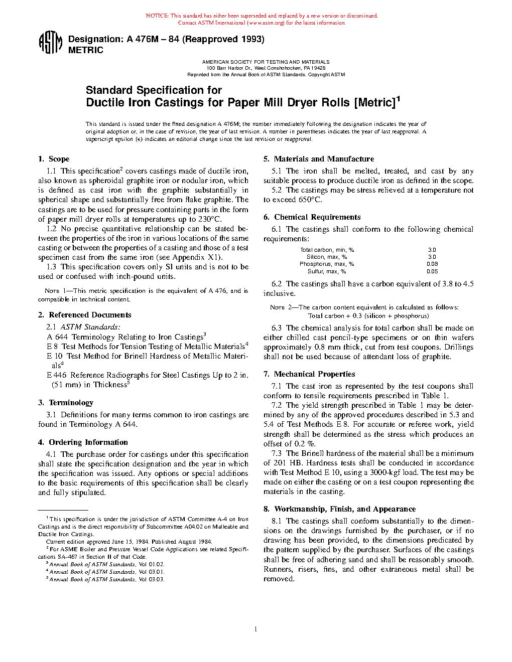 Note 1-This metric specification is the equivalent of A476, and is compatible in technical content.Technical characteristics
