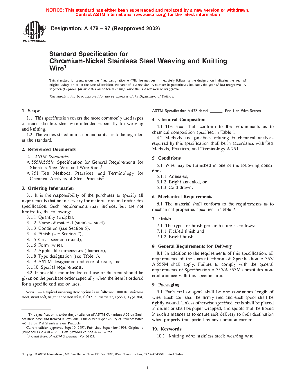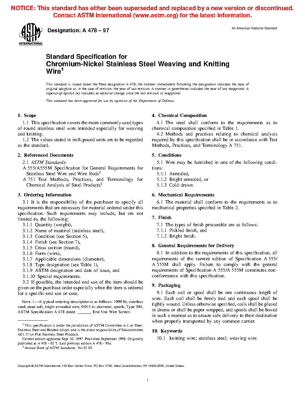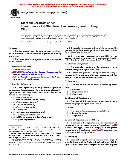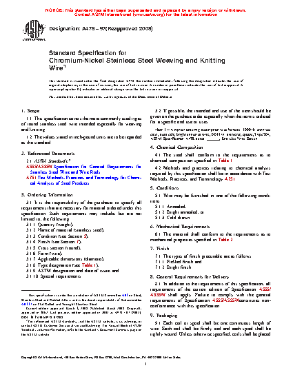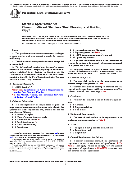 1.1 This specification covers the more commonly used types of round stainless steel wire intended especially for weaving and knitting.