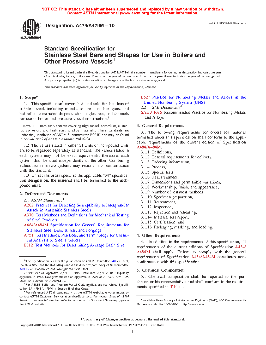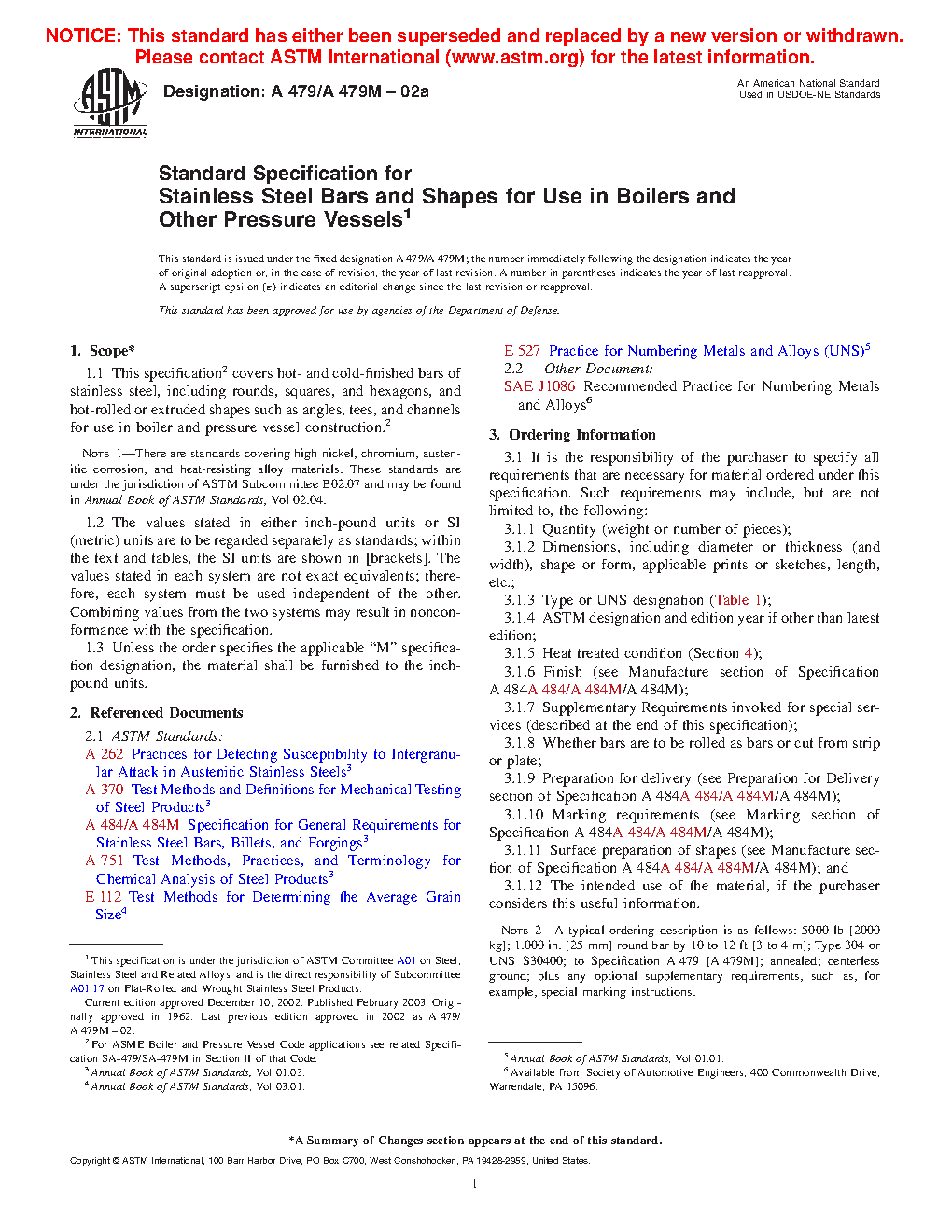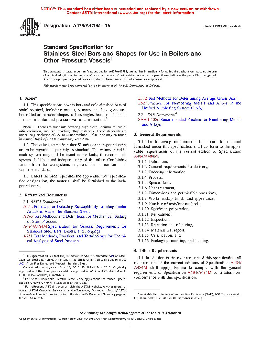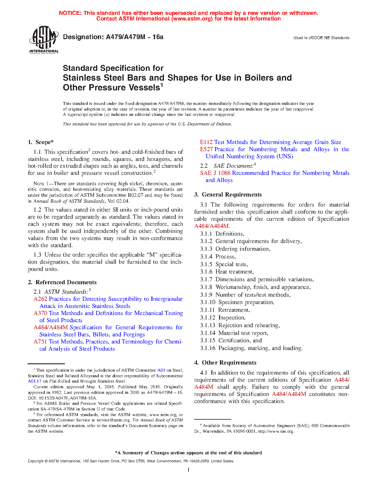 1.1 This specification2 covers hot- and cold-finished bars of stainless steel, including rounds, squares, and hexagons, and hot-rolled or extruded shapes such as angles, tees, and channels for use in boiler and pressure vessel construction.2