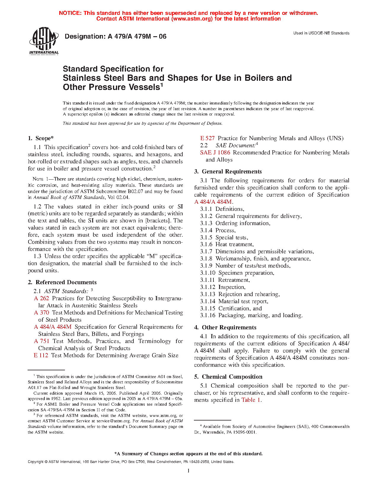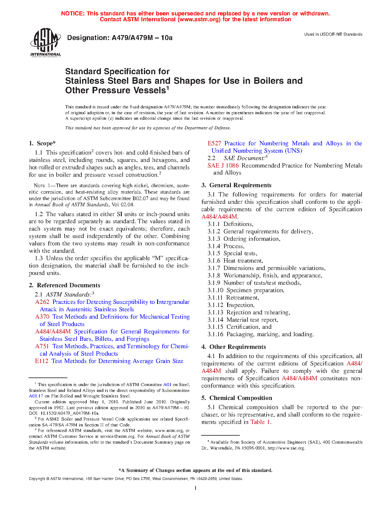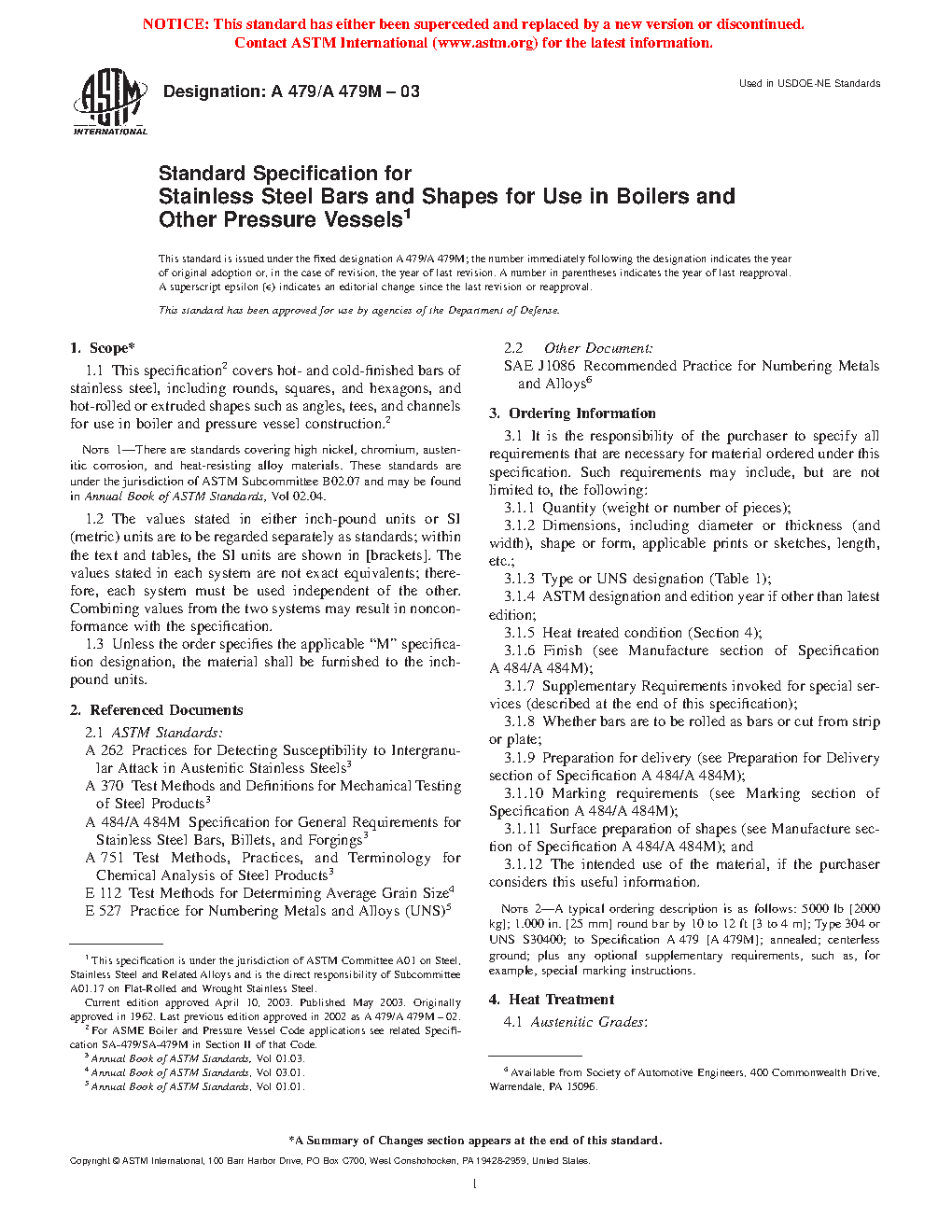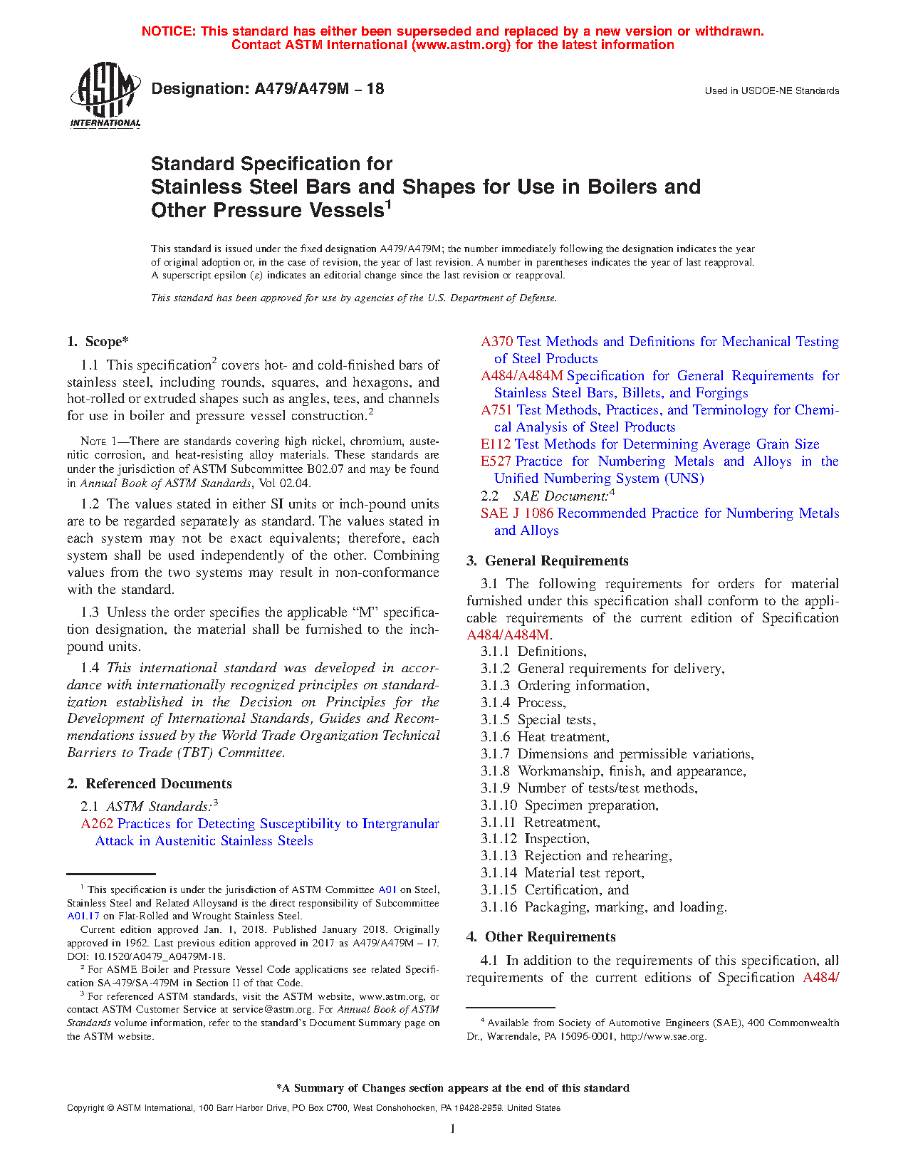 This specification covers hot- and cold-finished bars of stainless steel, including rounds, squares, and hexagons, and hot-rolled or extruded shapes such as angles, tees, and channels for use in boiler and pressure vessel construction. Four grades of the stainless steel are available which includes austenitic, austenitic-ferritic, ferritic, and martensitic grades. Mechanical properties such as tensile strength, yield strength, elongation, and hardness shall be determined for the specimens subjected to normalized, tempered, annealed, and quenched conditions. The austenitic stainless steels shall be subjected to heat treatment and shall undergo corrosion test.