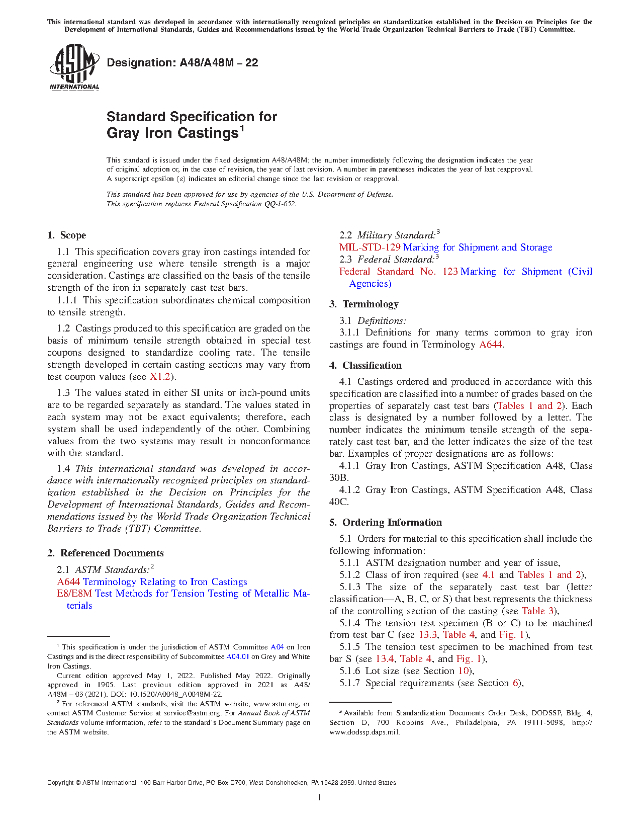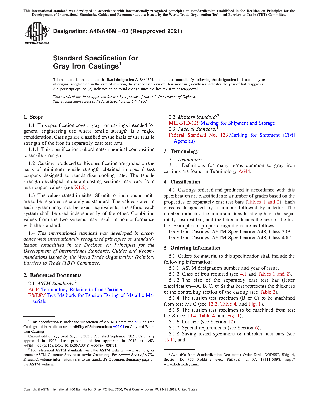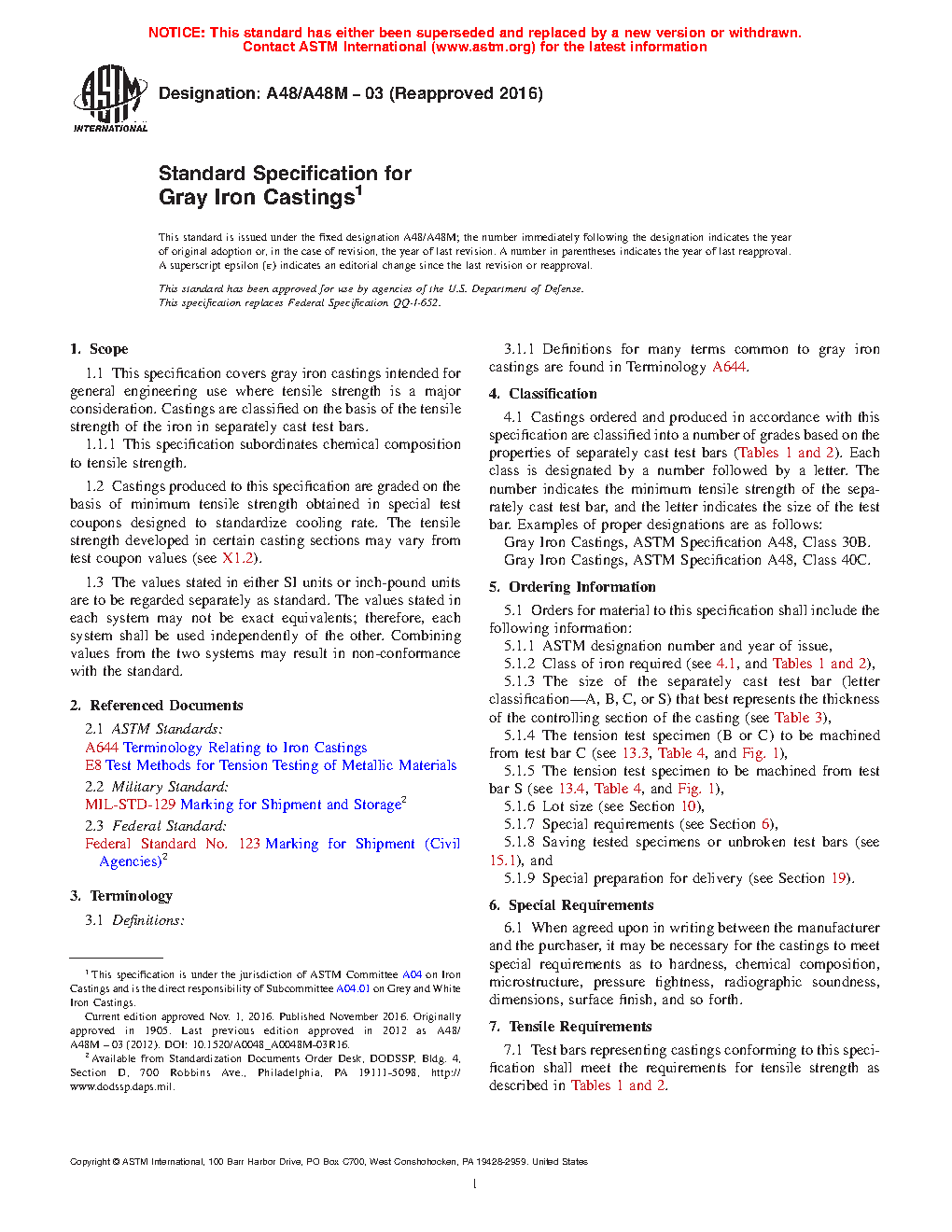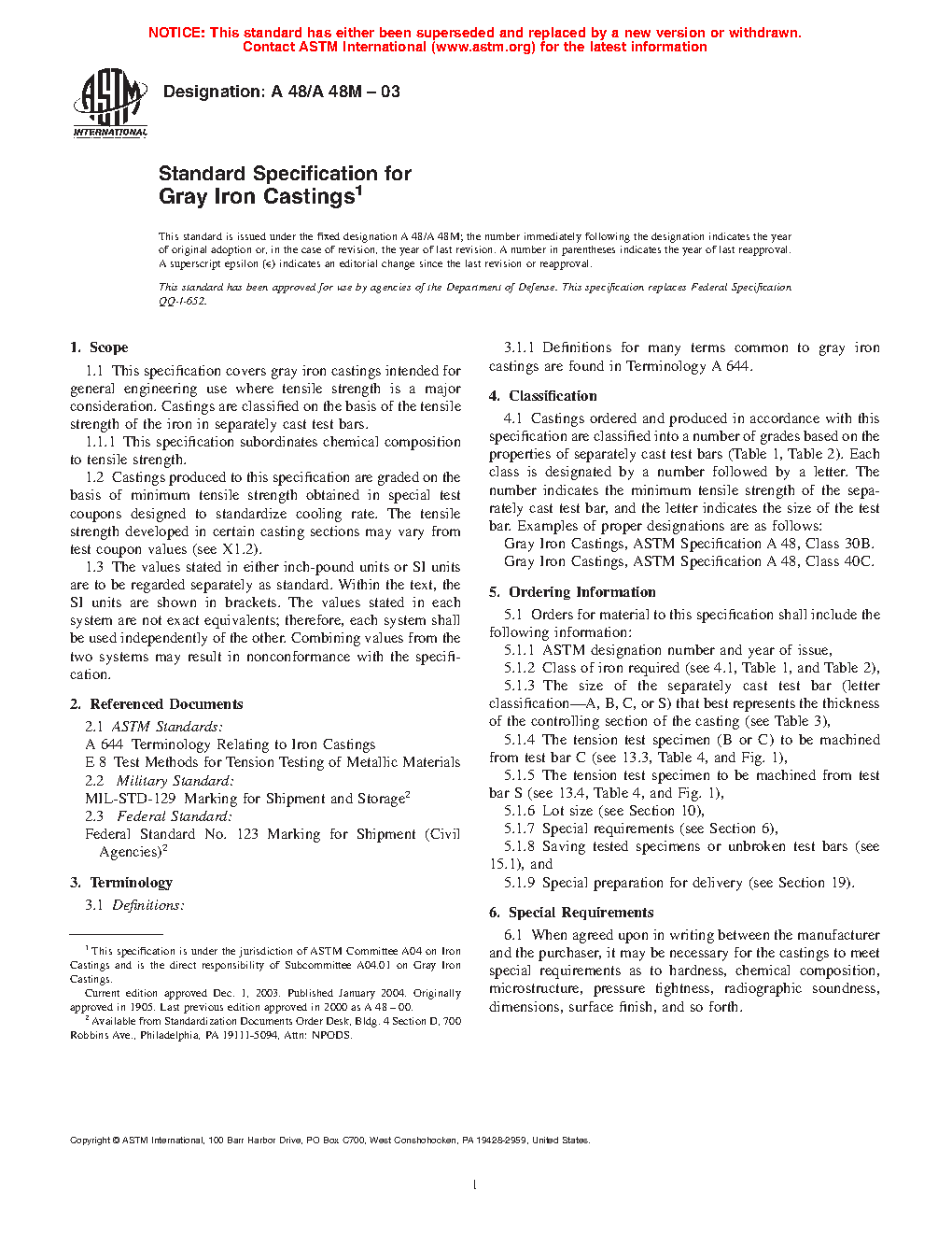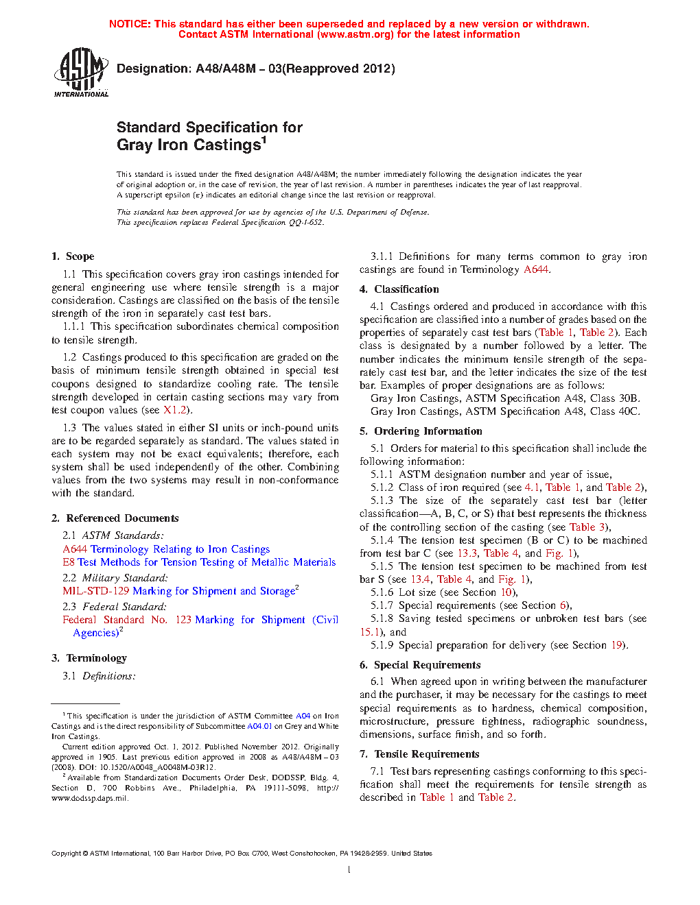 1.1 This specification covers gray iron castings intended for general engineering use where tensile strength is a major consideration. Castings are classified on the basis of the tensile strength of the iron in separately cast test bars.