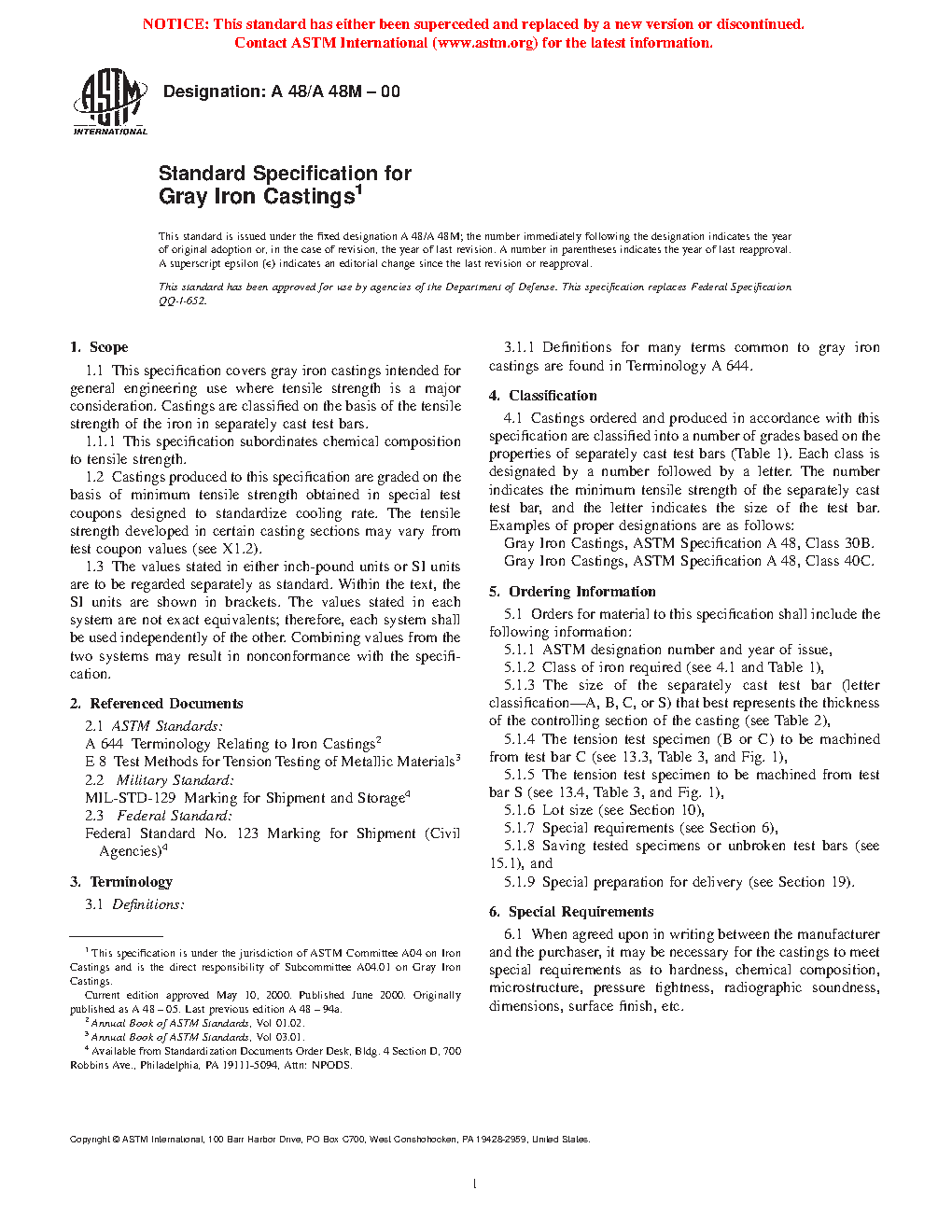 This specification covers gray iron castings intended for general engineering use where tensile strength is a major consideration. Castings are classified on the basis of the tensile strength of the iron in separately cast test bars. The surface of the casting shall be free of adhering sand, scale, cracks, and hot tears, as determined by visual examination. The test bars are designated into S, A, B, and C categories, according to the thickness of its controlling wall section. The casting shall be subjected to a tension test to determine its tensile strength.