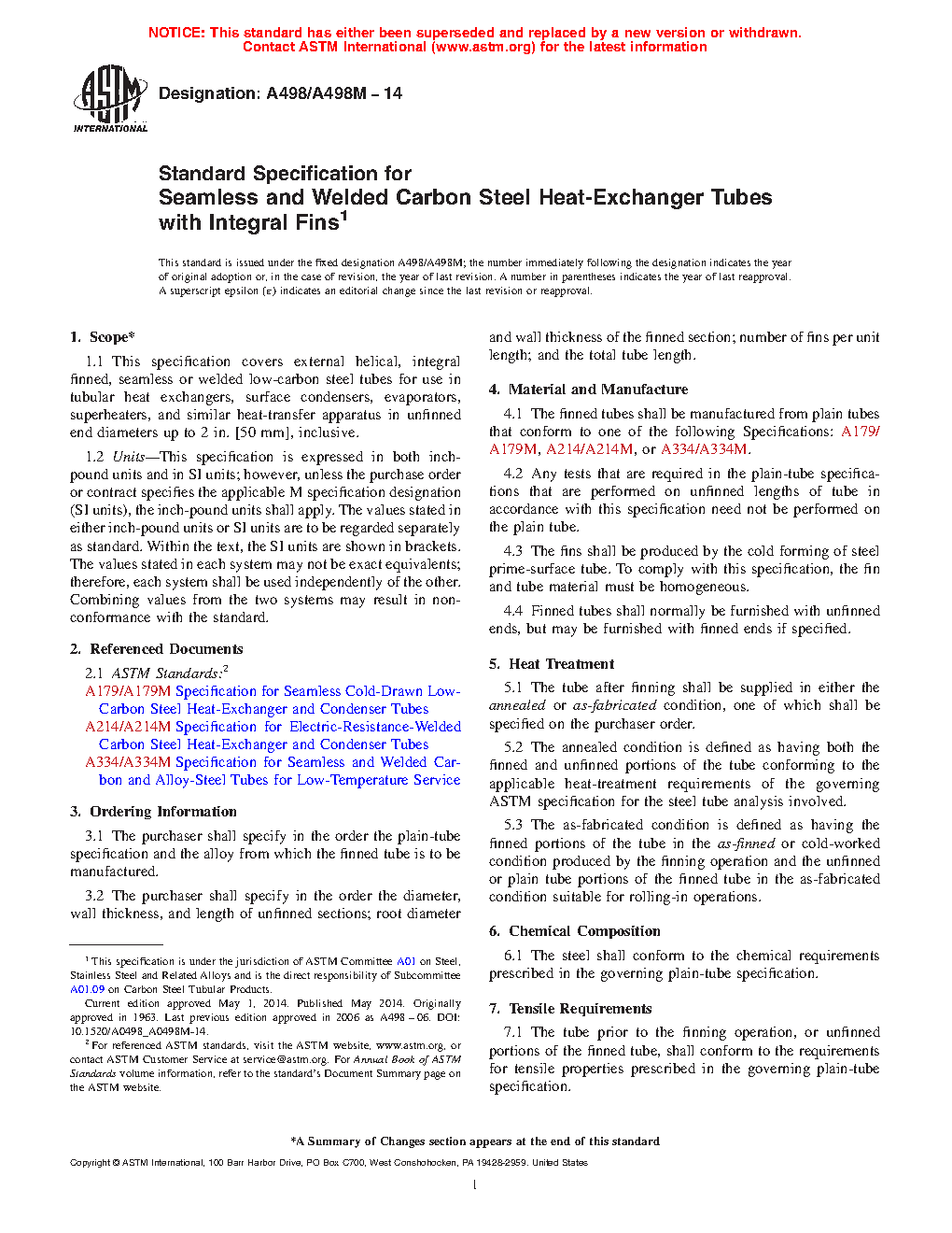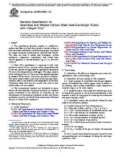 1.1 This specification describes seamless or welded low-carbon steel tubes on which the external or internal surface, or both, have been modified by a cold forming process to produce an integral increased surface area for improved heat transfer. The tubes are used in tubular heat exchangers, surface condensers, evaporators, superheaters, and similar heat-transfer apparatus in outside diameters up to 2 in. [50 mm], inclusive.