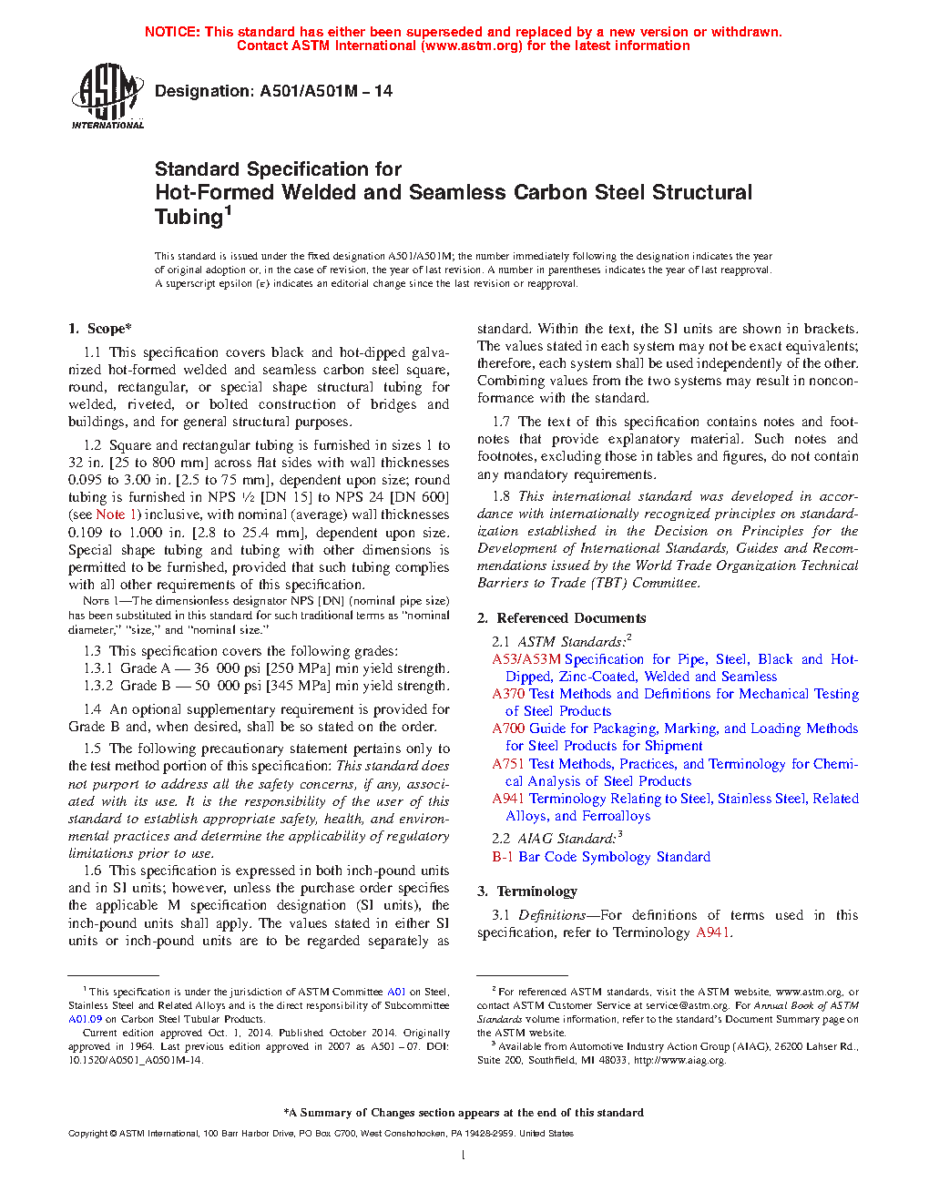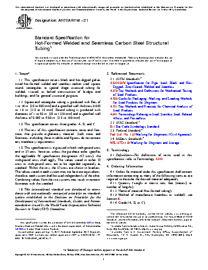 1.1 This specification covers black and hot-dipped galvanized hot-formed welded and seamless carbon steel square, round, rectangular, or special shape structural tubing for welded, riveted, or bolted construction of bridges and buildings, and for general structural purposes.