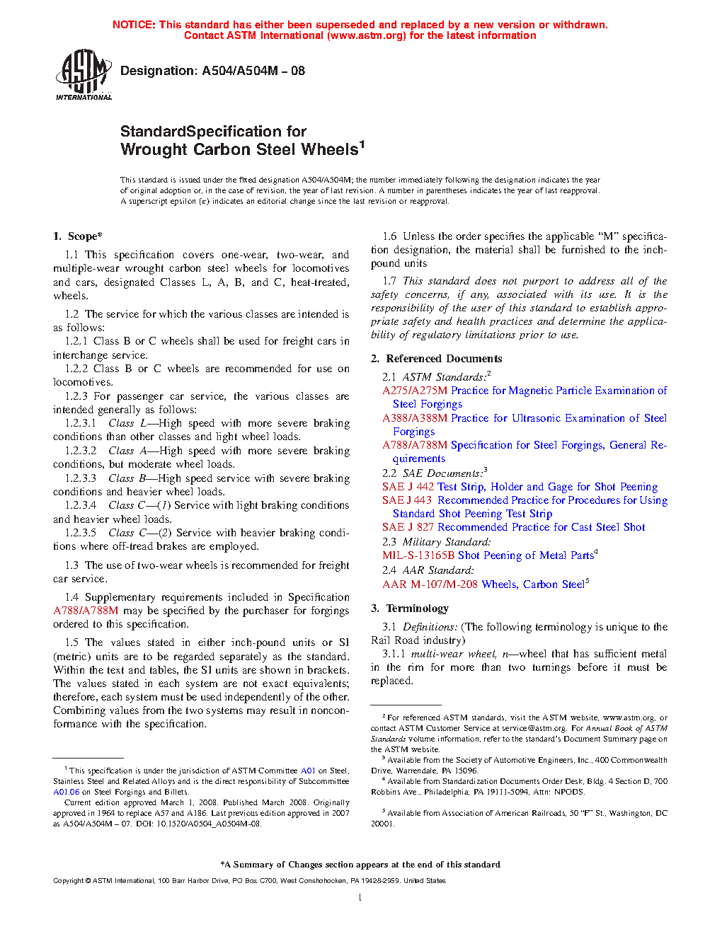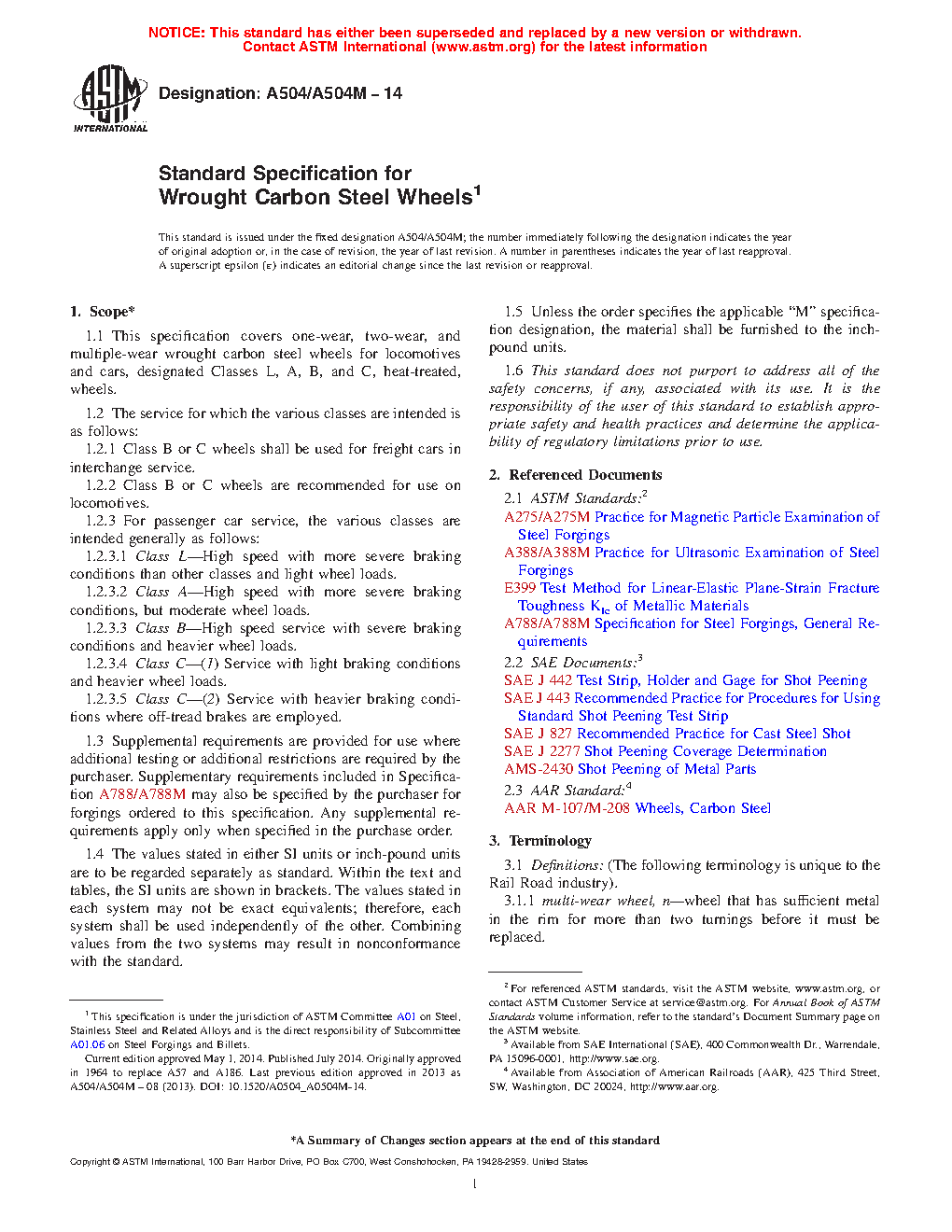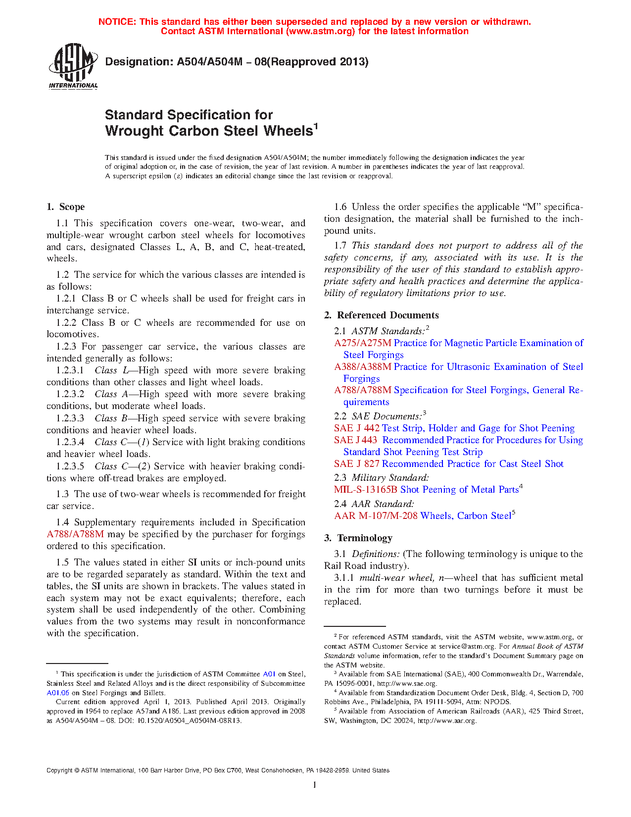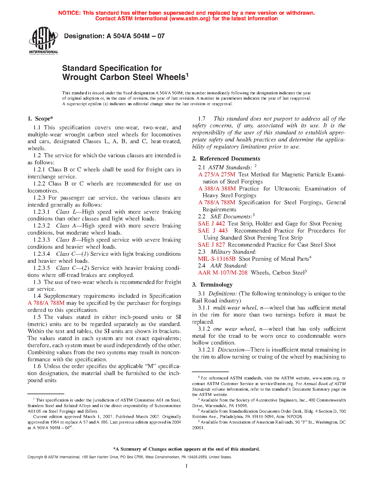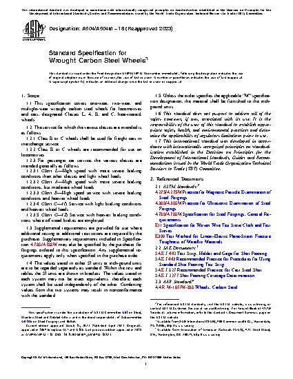 This specification deals with one-wear, two-wear, and multiple-wear wrought carbon steel wheels for locomotives and cars. The classes of steel wheels according to passenger car service covered here are: Class L, which are for high speed services with more severe braking conditions than other classes and light wheel loads; Class A, which are for high speed services with more severe braking conditions, but moderate wheel loads; Class B, which are for high speed services with severe braking conditions and heavier wheel loads; Class C (1), which are for services with light braking conditions and heavier wheel loads; and Class C (2), which are for services with heavier braking conditions where off-tread brakes are employed. Class B and C wheels shall be used for freight cars in interchange service, and are recommended for use on locomotives. Wheels shall be treated by rim-quenching and shot peening, and shall be finished by rough boring and machining. Heat analysis and rim hardness measurement procedures shall be performed to evaluate the conformance of wheel specimens with chemical composition and Brinell hardness requirements, respectively. Materials shall also go through nondestructive ultrasonic and magnetic particle examinations. Finally, customary product marking procedures shall be followed.