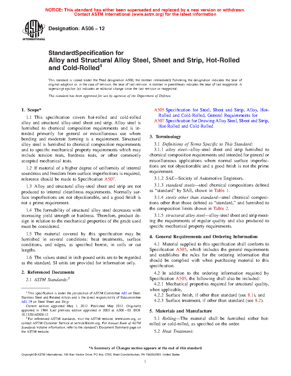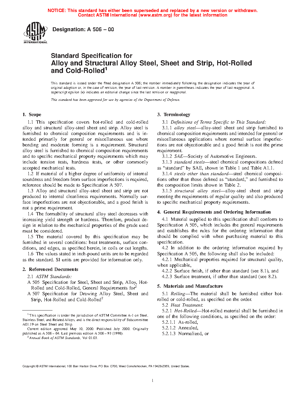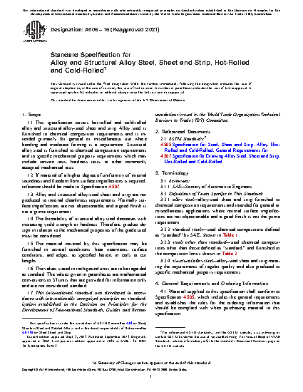1.1 This specification covers hot-rolled and cold-rolled alloy and structural alloy-steel sheet and strip. Alloy steel is furnished to chemical composition requirements and is intended primarily for general or miscellaneous use where bending and moderate forming is a requirement. Structural alloy steel is furnished to chemical composition requirements and to specific mechanical property requirements which may include tension tests, hardness tests, or other commonly accepted mechanical tests.