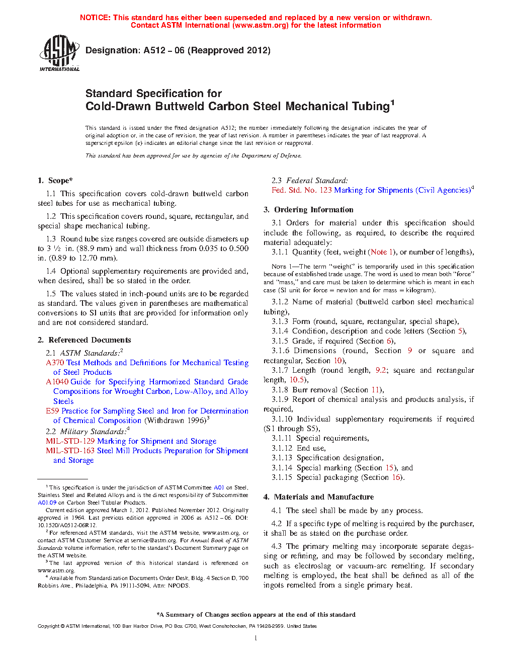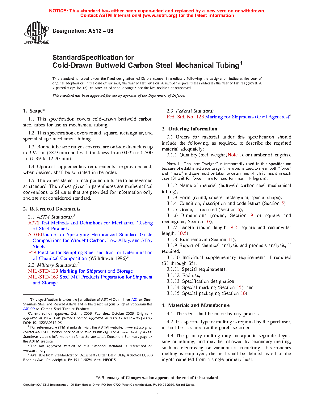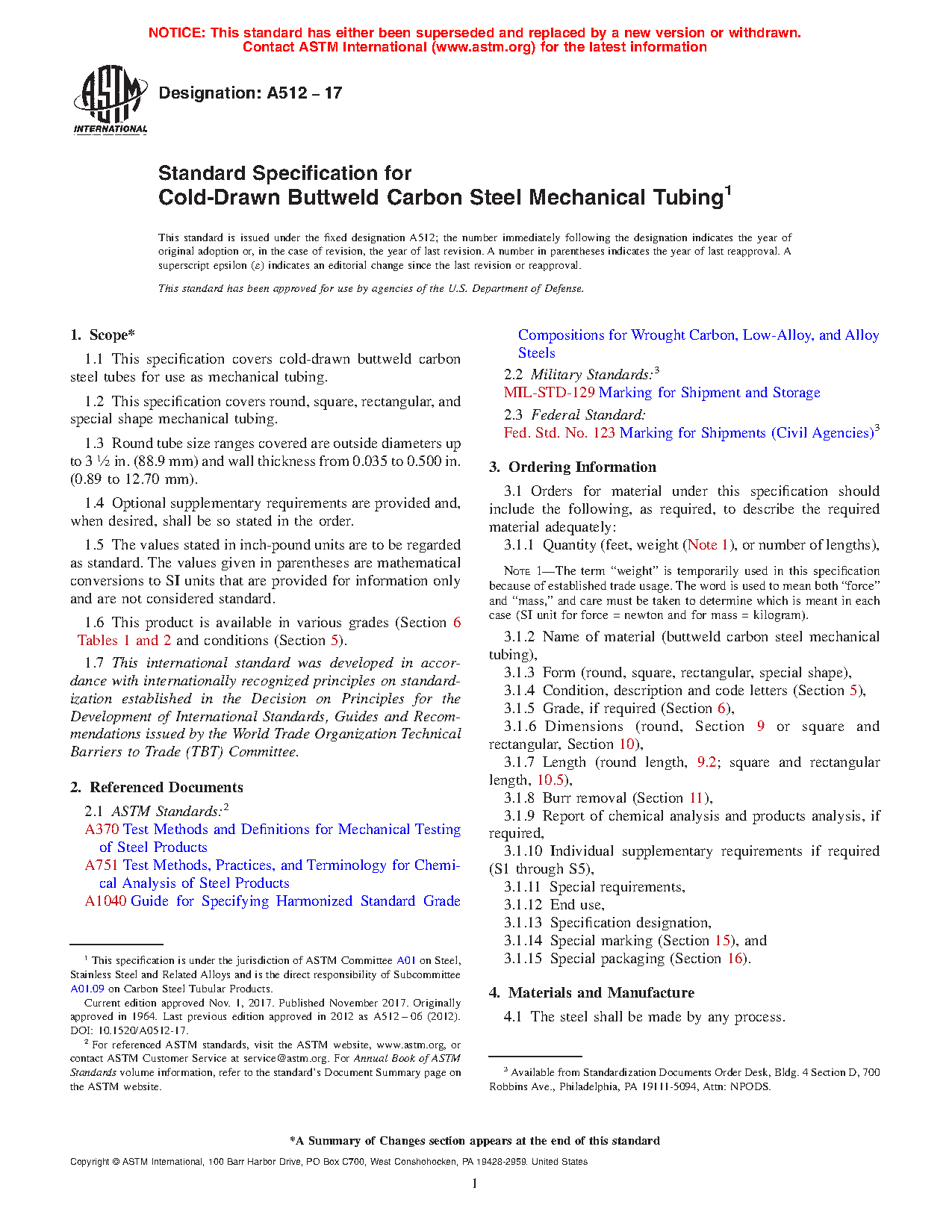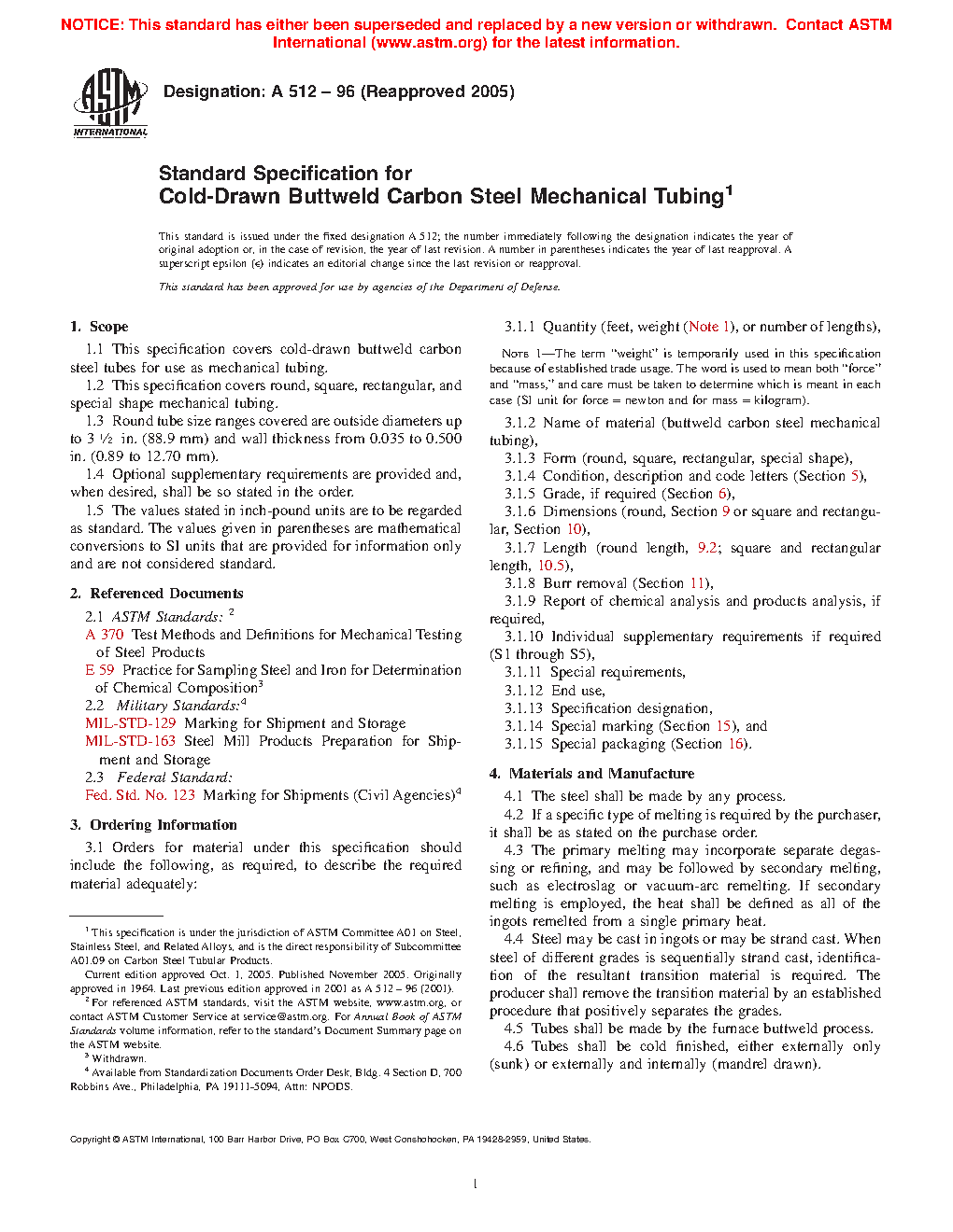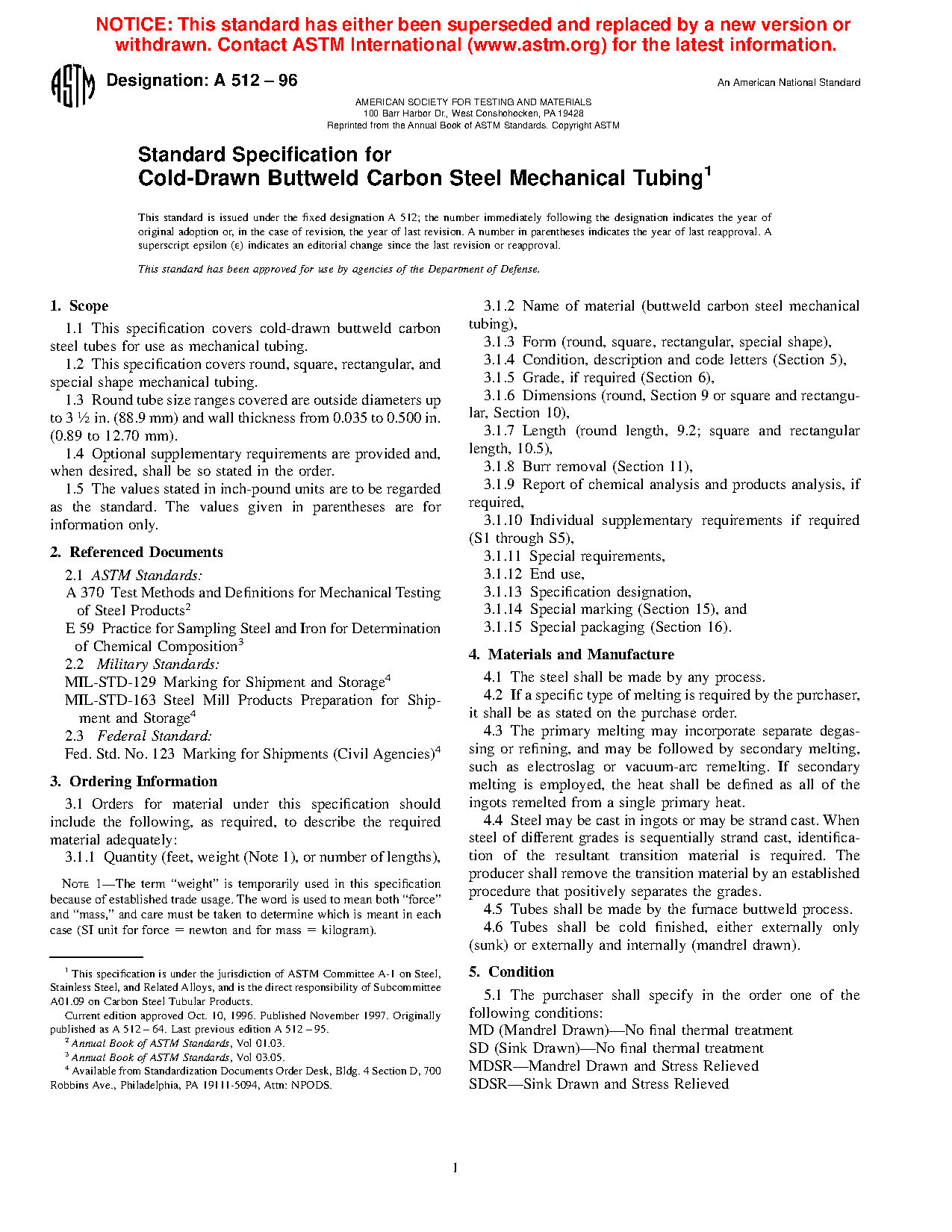 This specification covers cold-drawn buttweld carbon steel tubes for use as round, square, rectangular or special shape mechanical tubing. The carbon steel can be made unless a specific type of melting process is required by the purchaser. Heat and product analysis shall be made to determine the specified percentages of chemical elements to which steel tubes shall conform to. The tubing shall be free of injurious defects and shall have a workmanlike finish. Unless otherwise specified, both outside and inside surfaces of the tubing shall be coated with a film of rust-retarding oil before shipping.