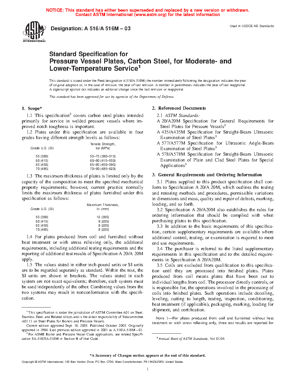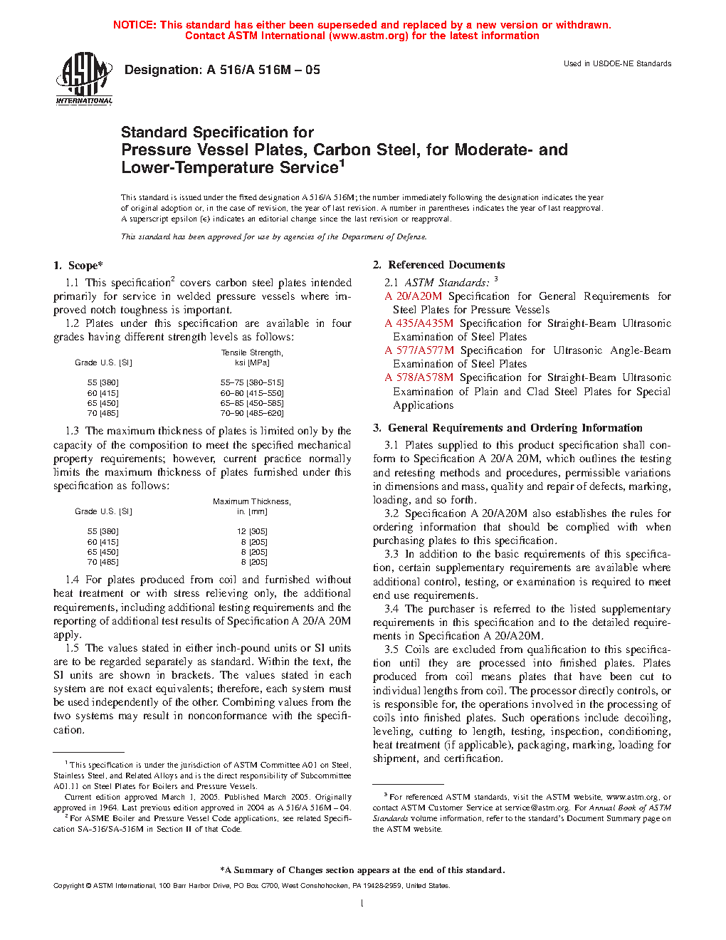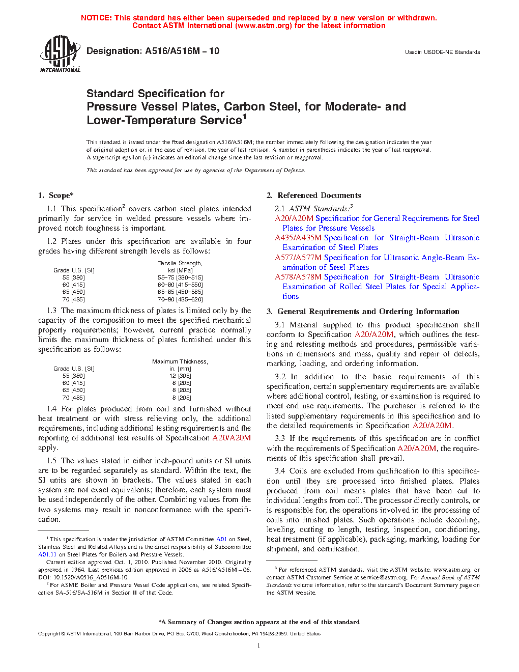This specification covers carbon steel plates intended primarily for service in welded pressure vessels where improved notch toughness is important. According to different strength levels, the plates are available in four grades: Grades 55, 60, 65, and 70. The maximum thickness of plates is limited only by the capacity of the composition to meet the specified mechanical property requirements. The steel shall be killed and shall conform to fine austenitic grain size requirements. The mechanical properties such as tensile strength, yield strength, and elongation shall be determined by a tension test for the plates.