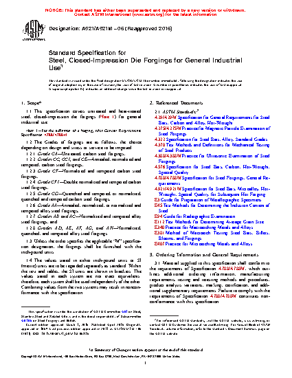 1.1 This specification covers untreated and heat-treated steel, closed-impression die forgings (Note 1) for general industrial use.