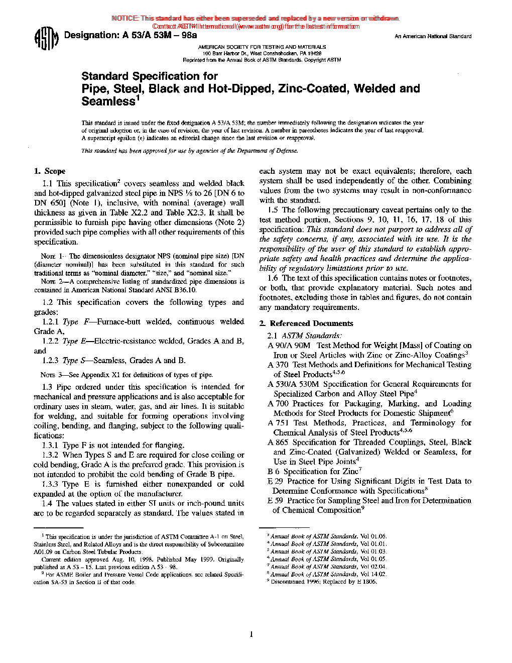 1.1 This specification2 covers seamless and welded black and hot-dipped galvanized steel pipe in NPS 1/8 to NPS 26 [DN 6 to DN 650] (Note 1), inclusive, with nominal wall thickness (Note 2) as given in Table X2.2 and Table X2.3. It shall be permissible to furnish pipe having other dimensions provided that such pipe complies with all other requirements of this specification. Supplementary requirements of an optional nature are provided and shall apply only when specified by the purchaser.