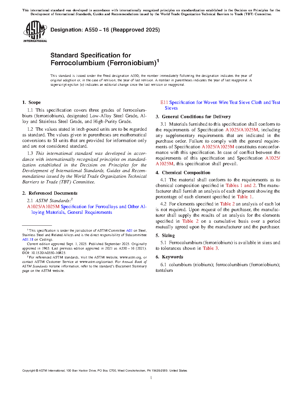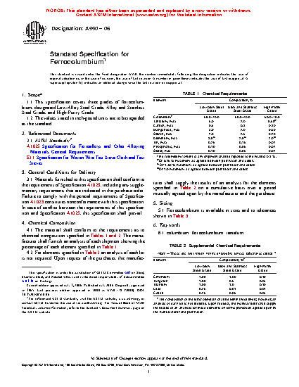 This specification covers three grades of ferrocolumbium, designated low-alloy steel grade, alloy and stainless steel grade, and high-purity grade. The material shall conform to the requirements as to chemical composition. Also, the ferrocolumbium shall be available in the sizes and tolerances specified.