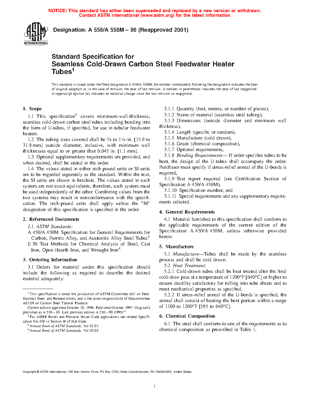 1.1 This specification2 covers minimum-wall-thickness, seamless cold-drawn carbon steel tubes including bending into the form of U-tubes, if specified, for use in tubular feedwater heaters.