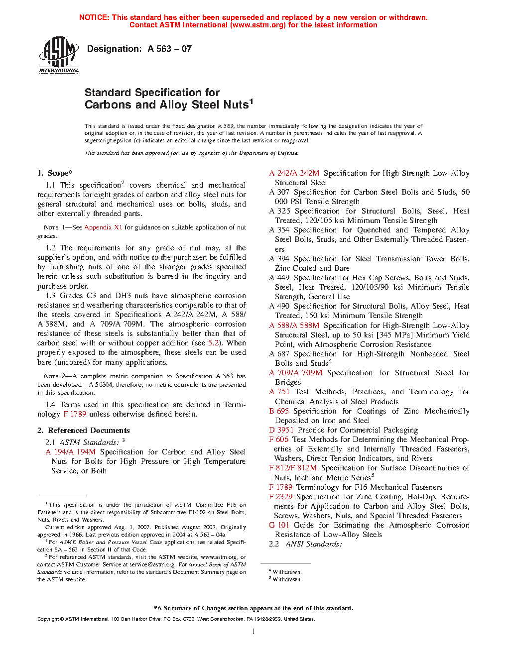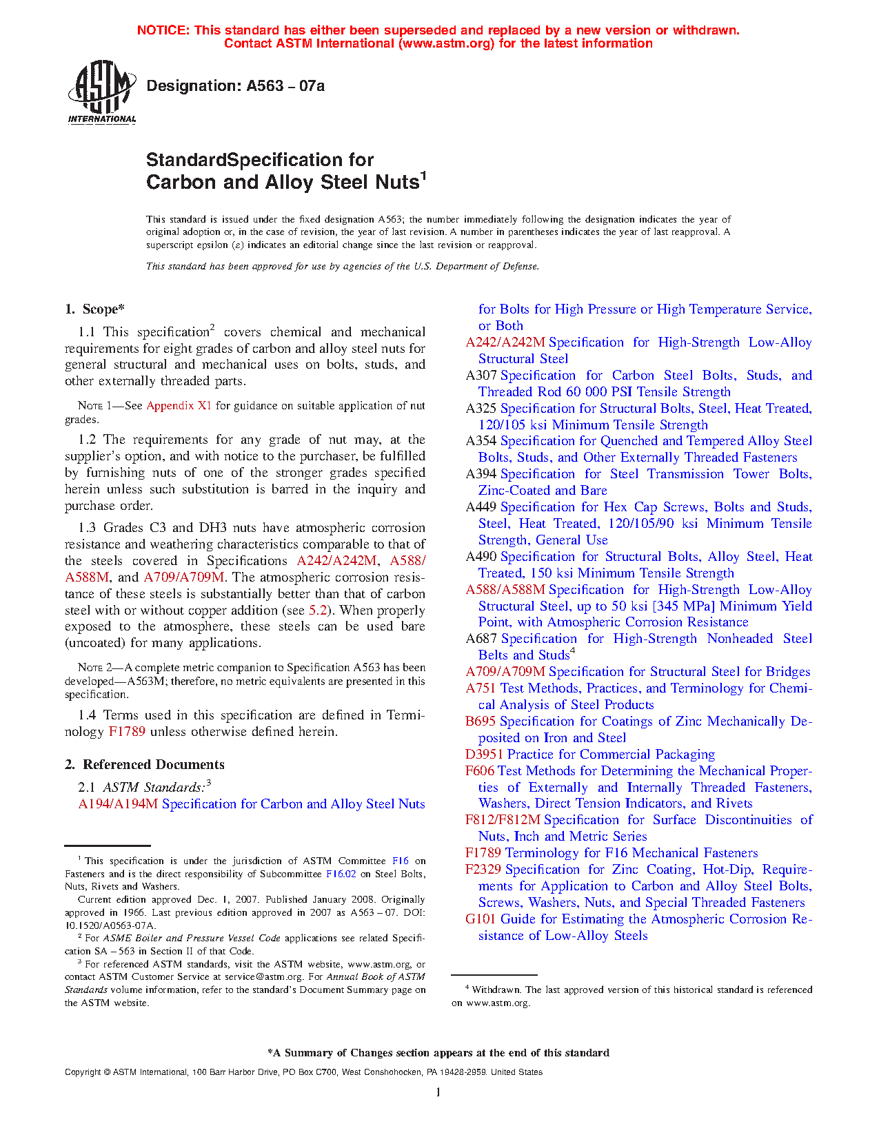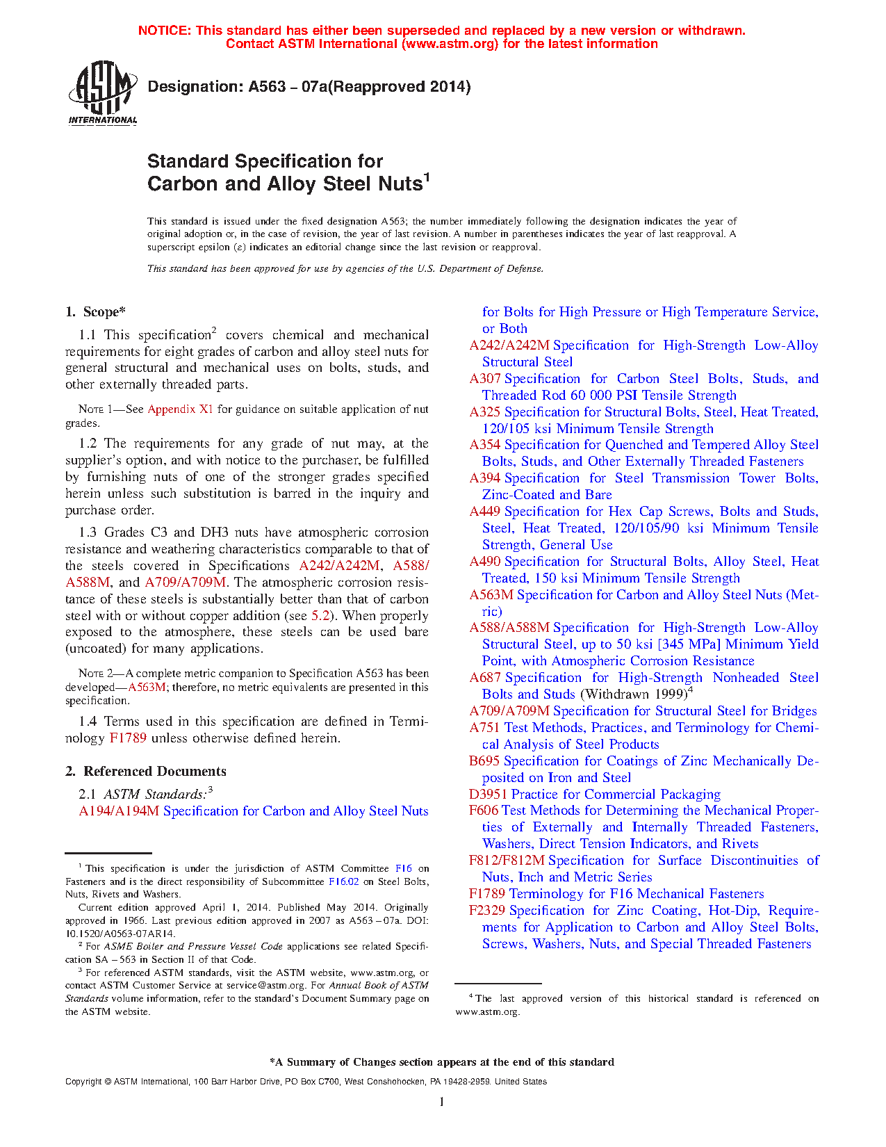 1.1 This specification covers chemical and mechanical requirements for eight grades of carbon and alloy steel nuts for general structural and mechanical uses on bolts, studs, and other externally threaded parts.