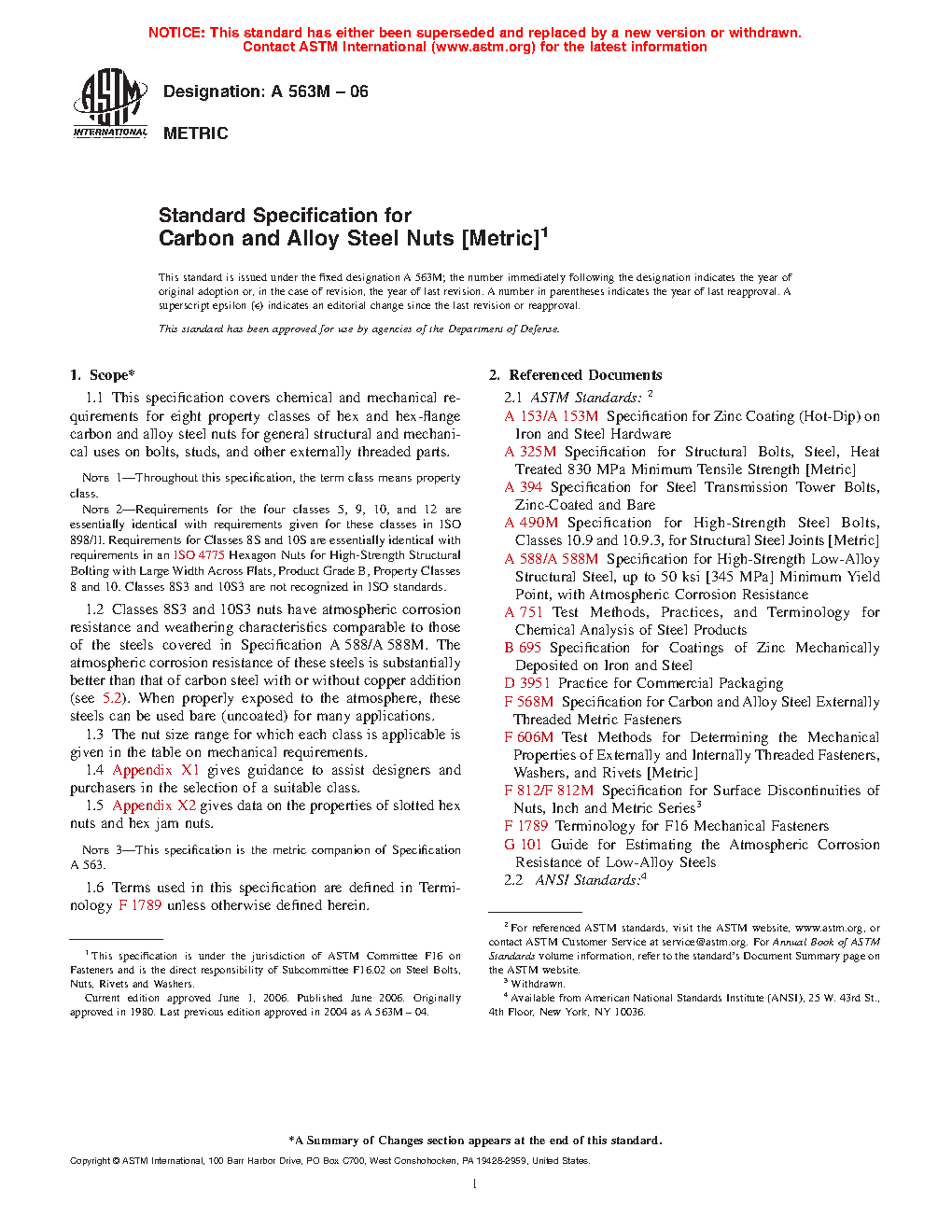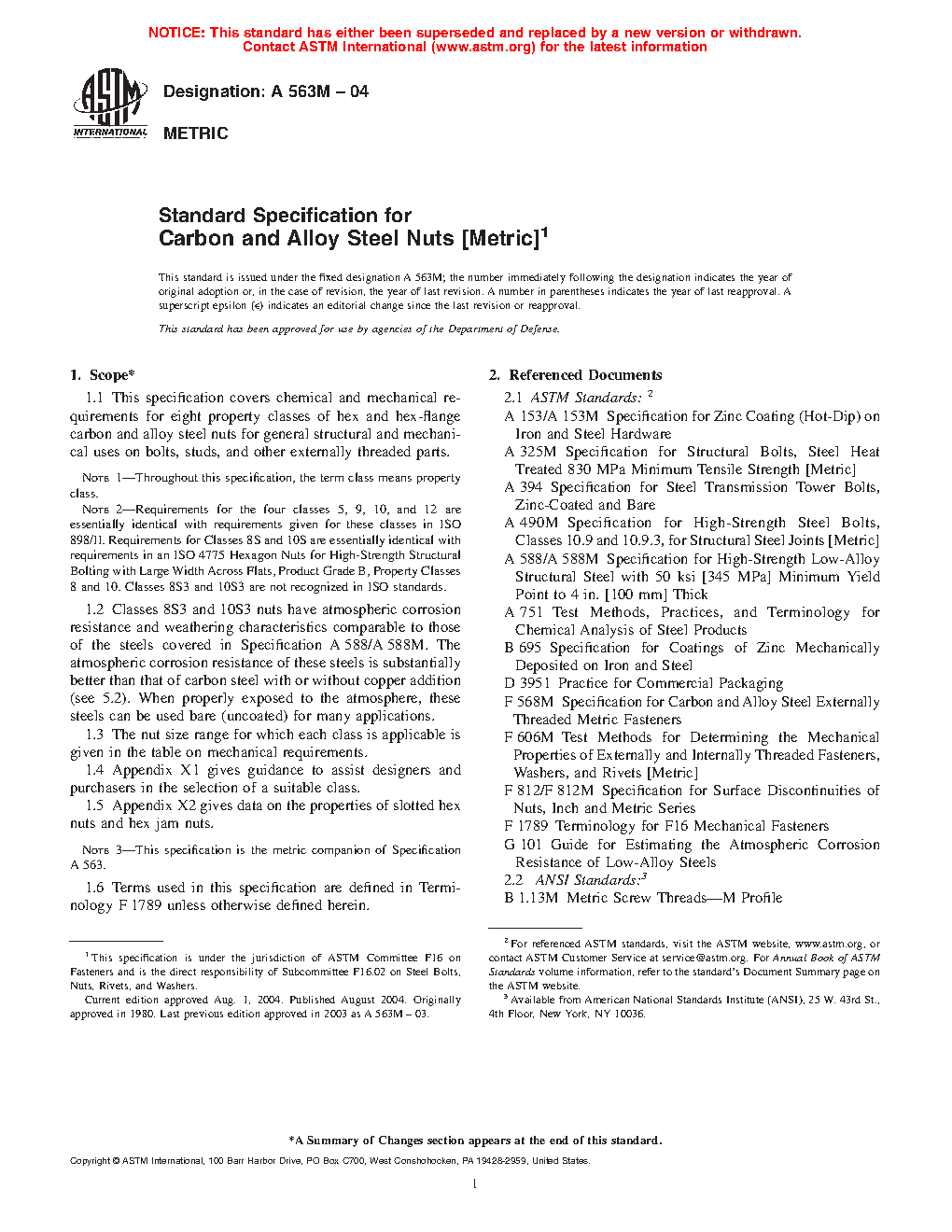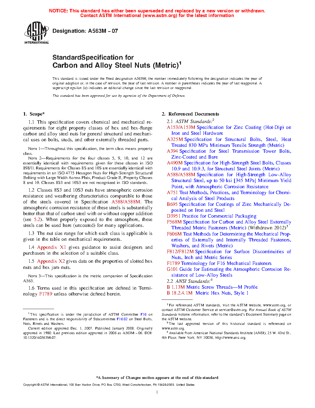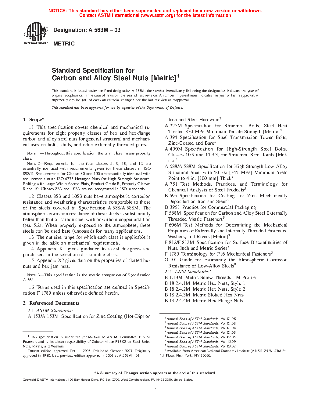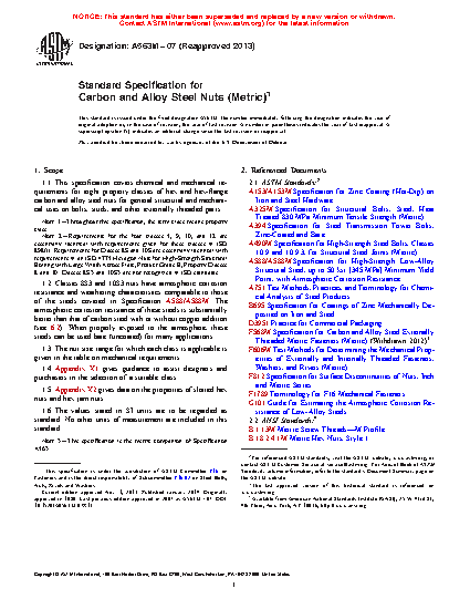 1.1 This specification covers chemical and mechanical requirements for eight property classes of hex and hex-flange carbon and alloy steel nuts for general structural and mechanical uses on bolts, studs, and other externally threaded parts.