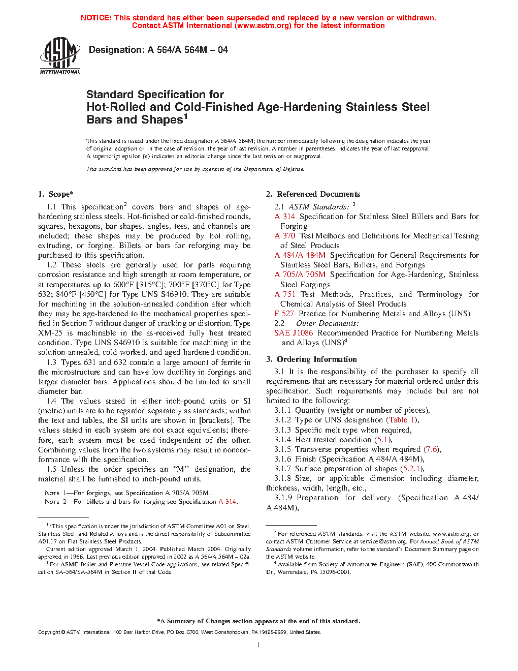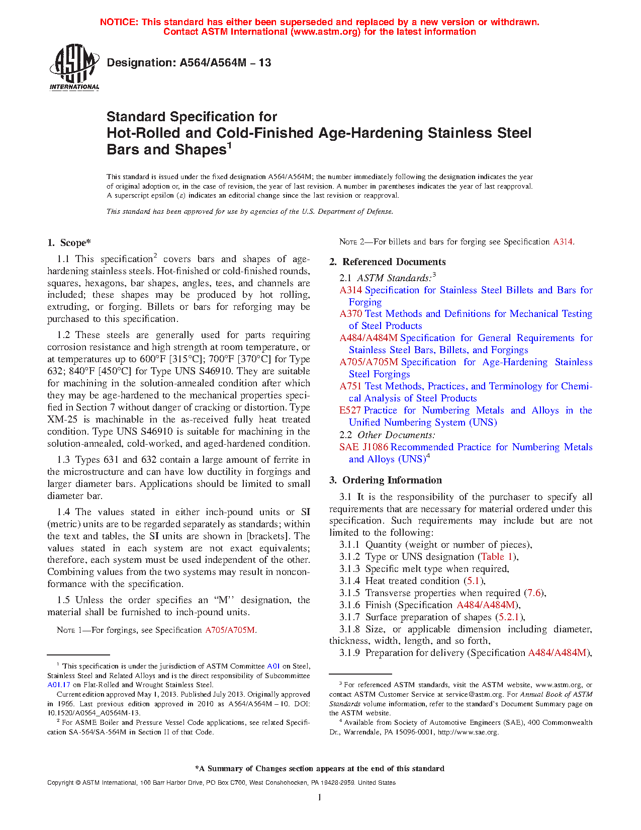 1.1 This specification2 covers bars and shapes of age-hardening stainless steels. Hot-finished or cold-finished rounds, squares, hexagons, bar shapes, angles, tees, and channels are included; these shapes may be produced by hot rolling, extruding, or forging. Billets or bars for reforging may be purchased to this specification.