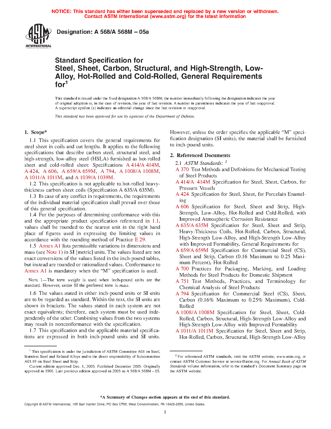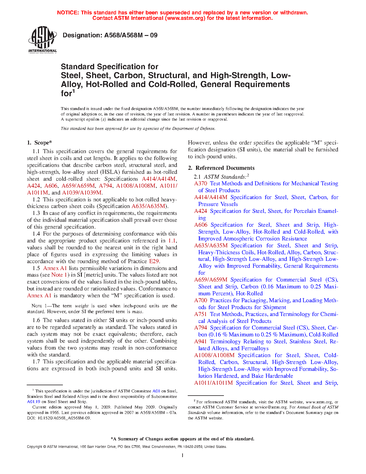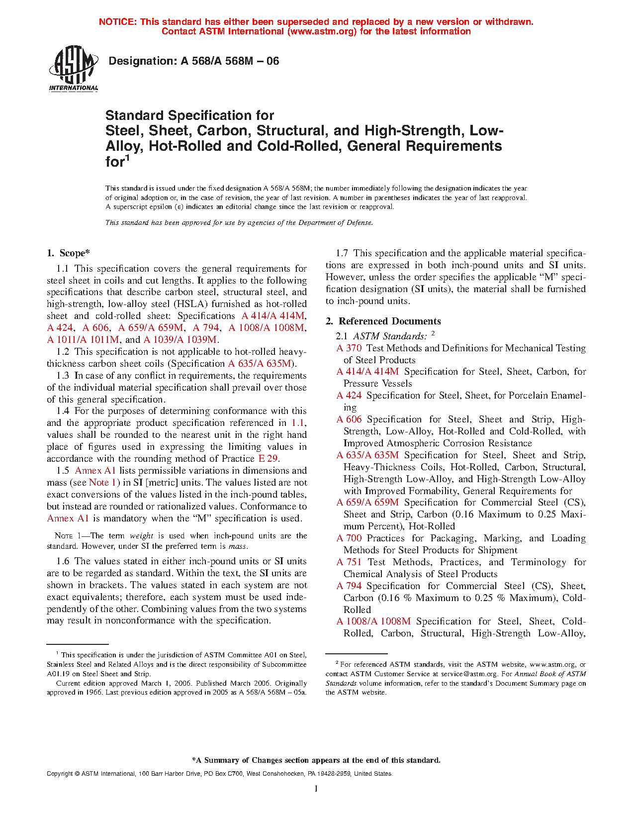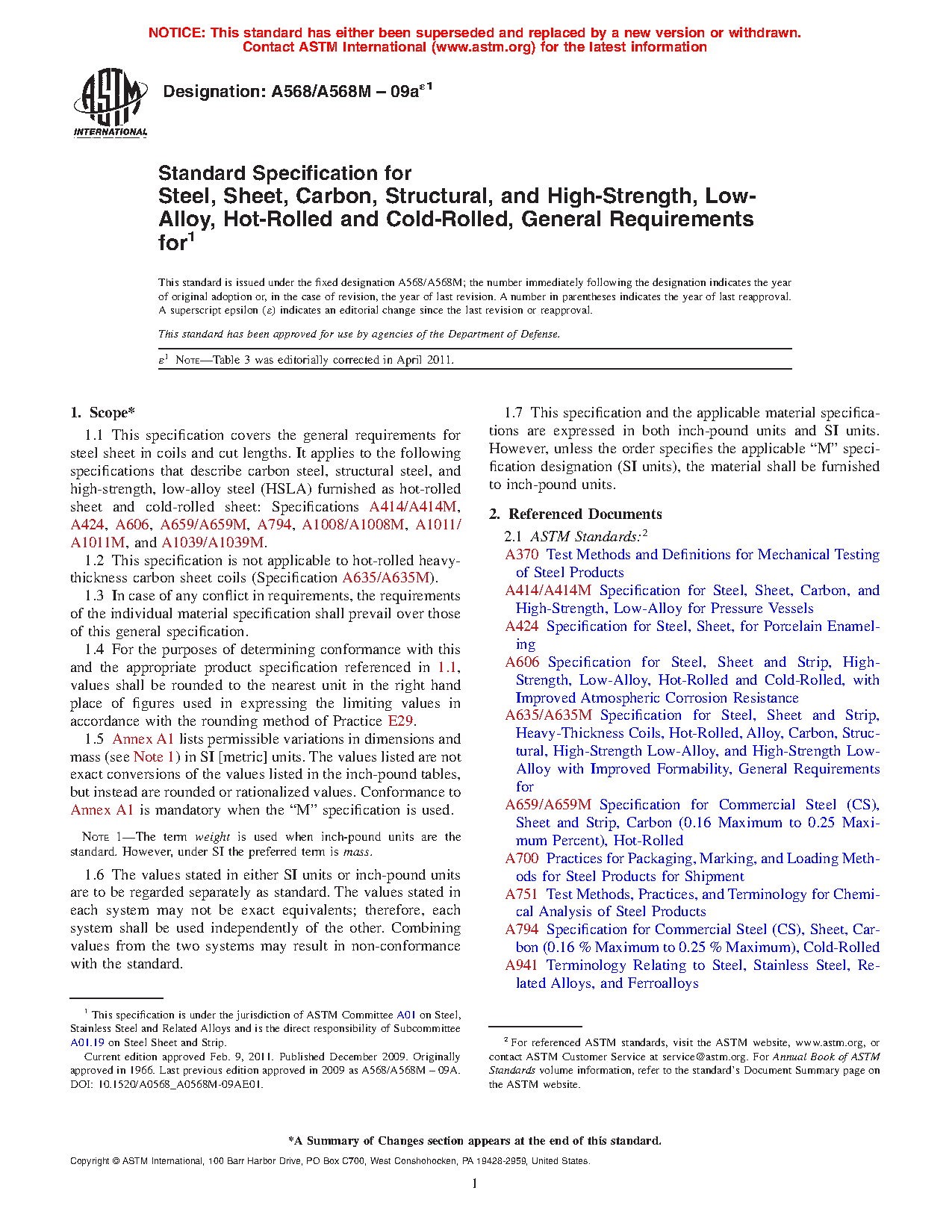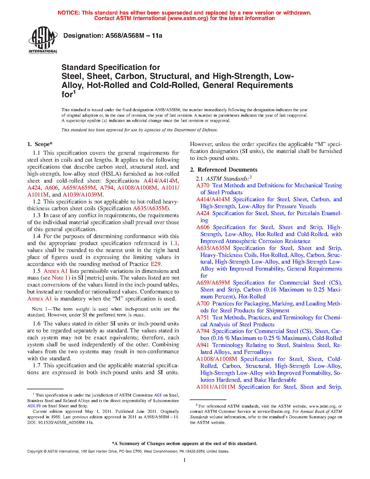 1.1 This specification covers the general requirements for steel sheet in coils and cut lengths. It applies to the following specifications that describe carbon steel, structural steel, and high-strength, low-alloy steel (HSLA) furnished as hot-rolled sheet and cold-rolled sheet: Specifications A414/A414M, A424/A424M, A606/A606M, A659/A659M, A794/A794M, A1008/A1008M, A1011/A1011M, and A1039/A1039M.