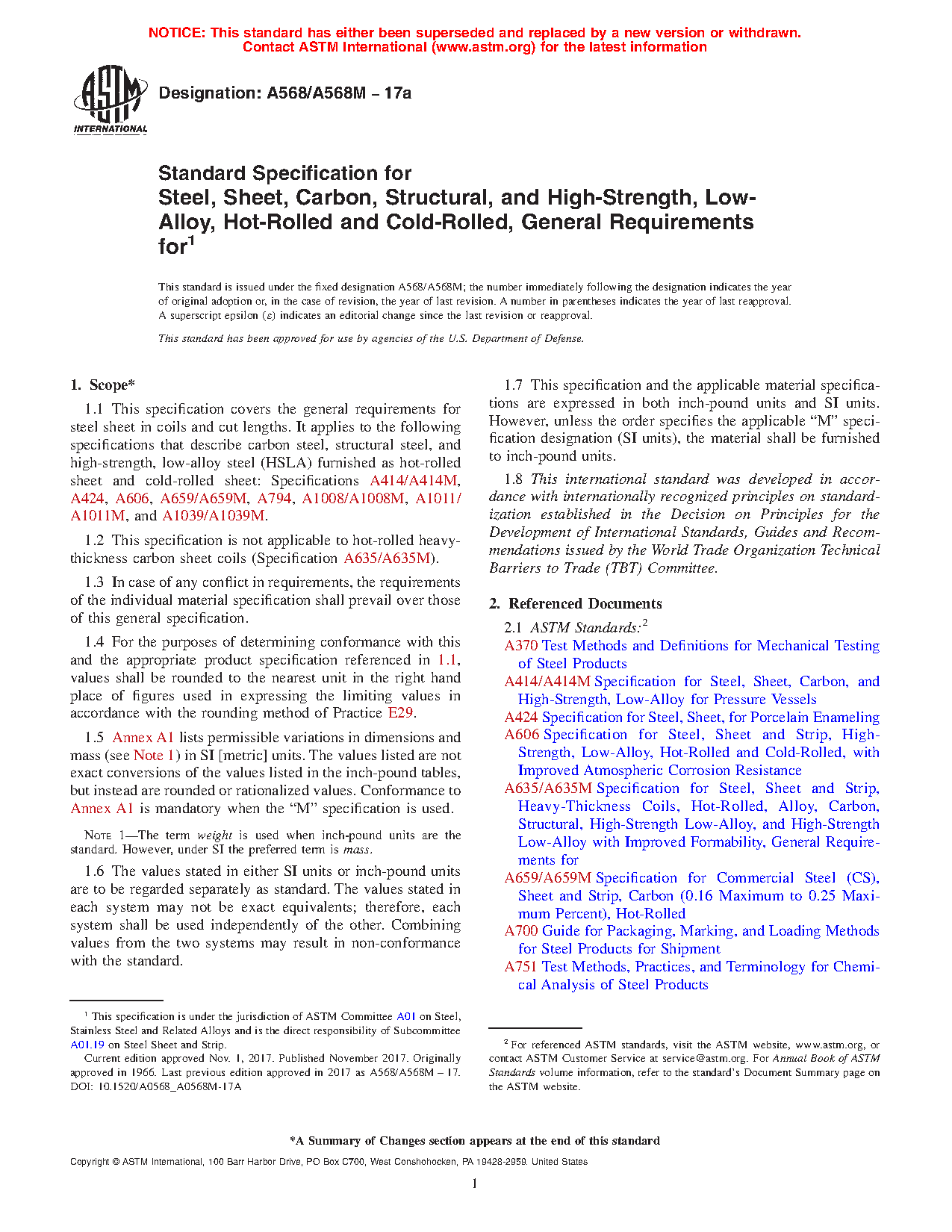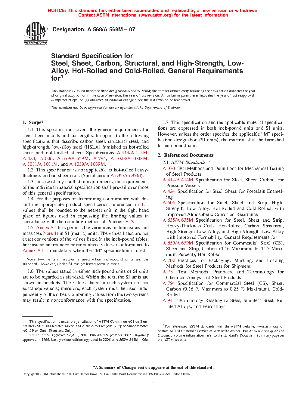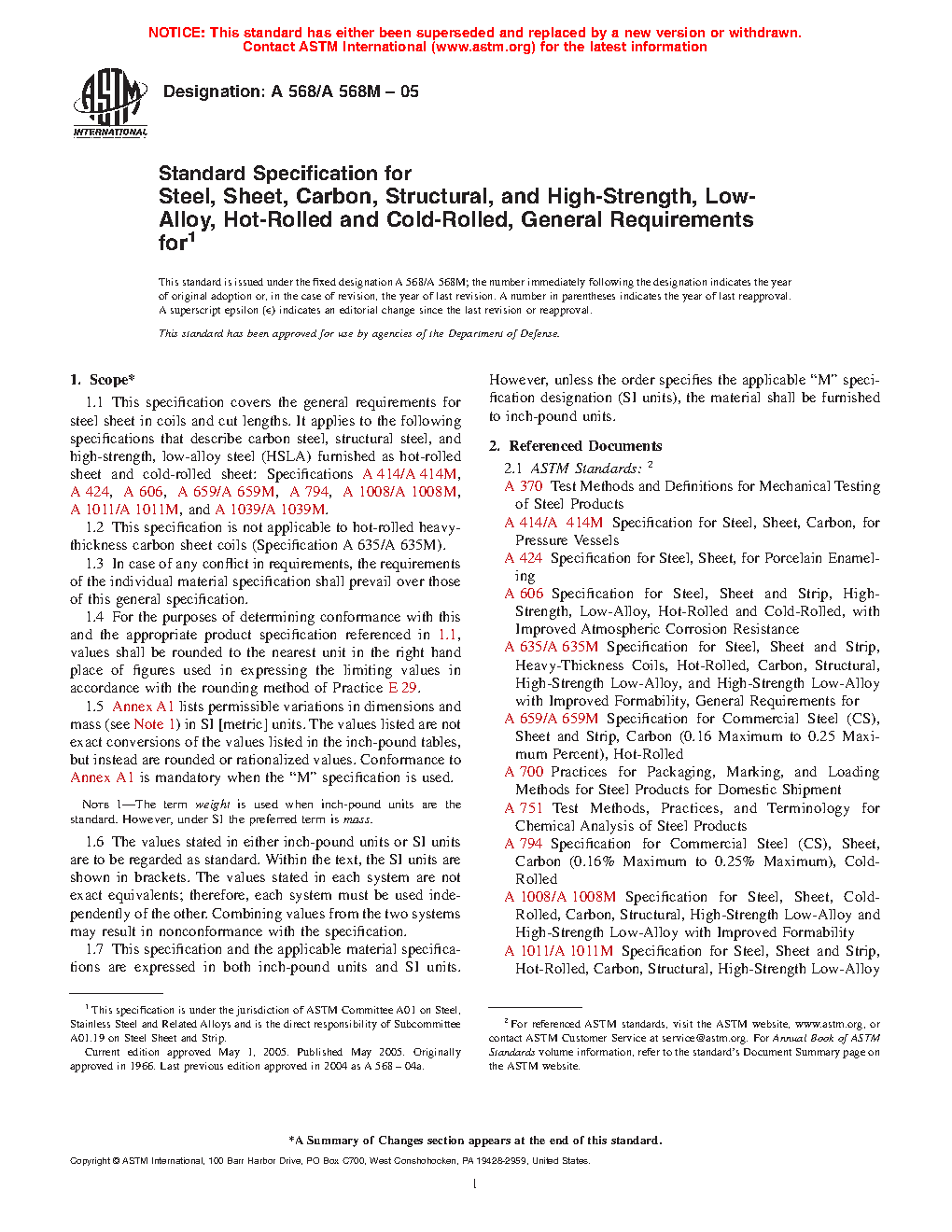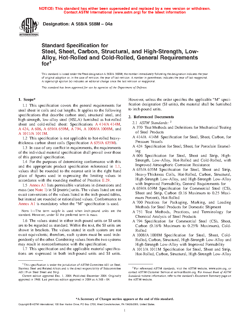 1.1 This specification covers the general requirements for steel sheet in coils and cut lengths. It applies to the following specifications that describe carbon steel, structural steel, and high-strength, low-alloy steel (HSLA) furnished as hot-rolled sheet and cold-rolled sheet: Specifications A414/A414M, A424/A424M, A606/A606M, A659/A659M, A794/A794M, A1008/A1008M, A1011/A1011M, and A1039/A1039M.