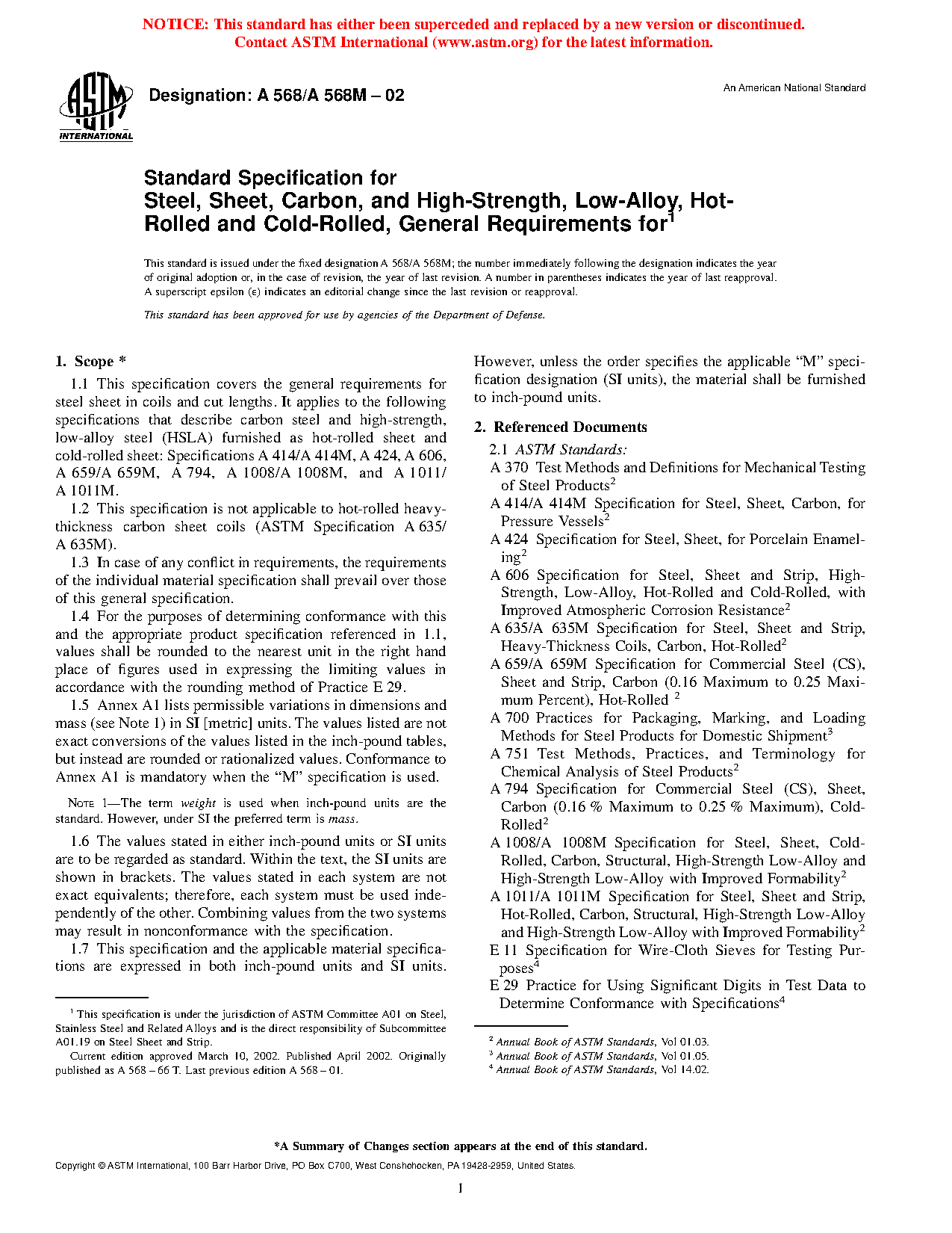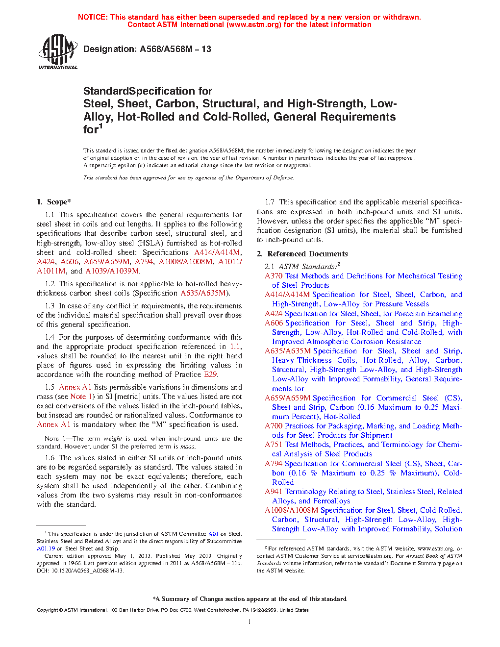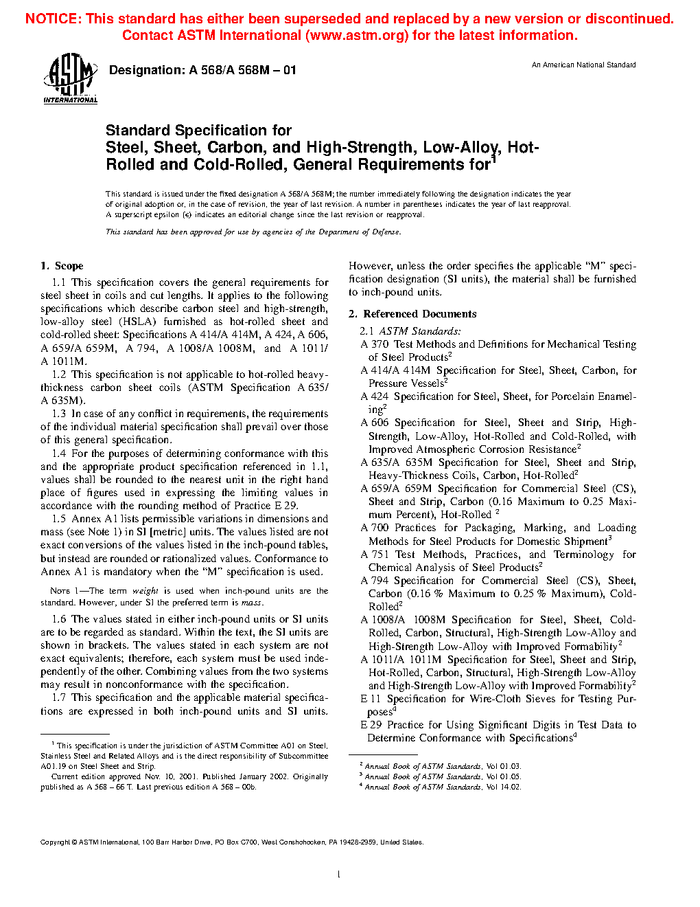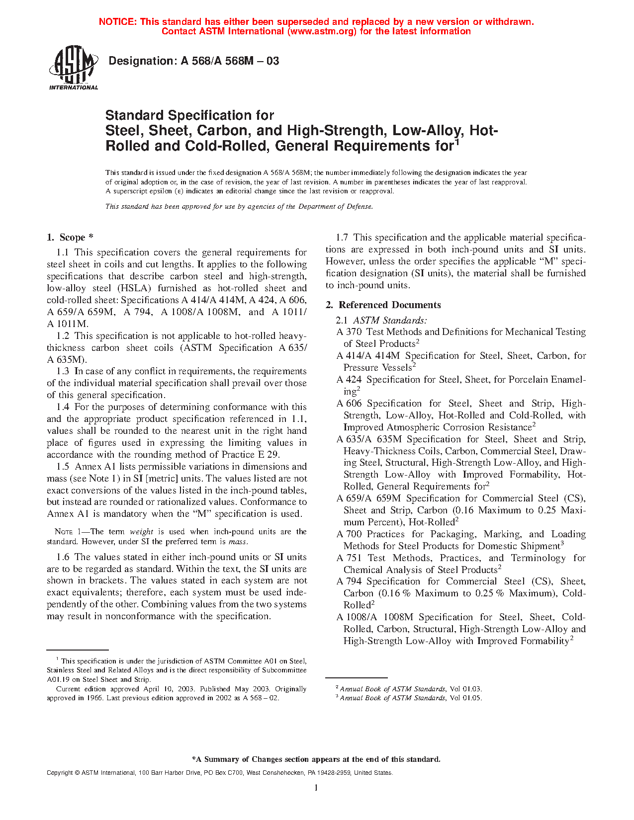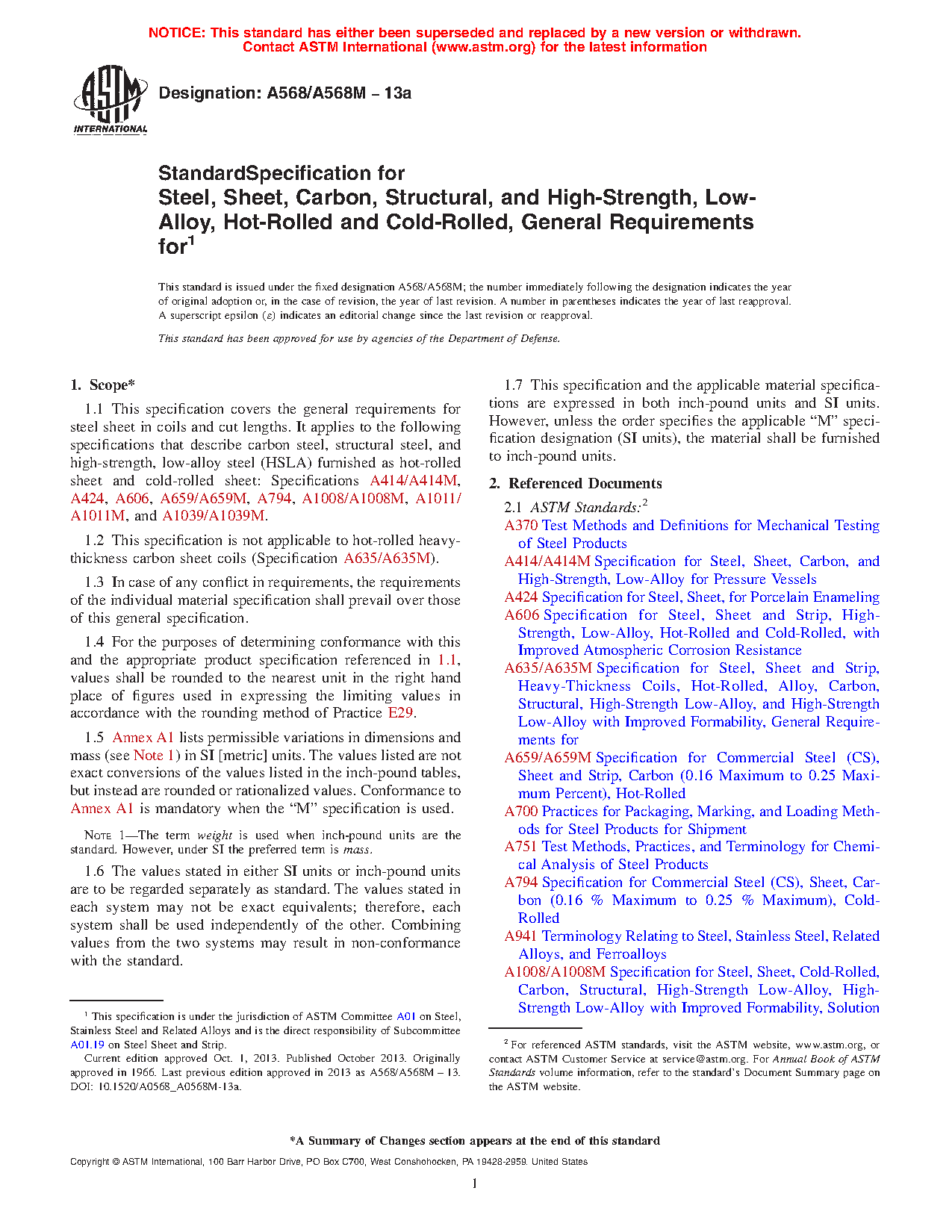 1.1 This specification covers the general requirements for steel sheet in coils and cut lengths. It applies to the following specifications that describe carbon steel, structural steel, and high-strength, low-alloy steel (HSLA) furnished as hot-rolled sheet and cold-rolled sheet: Specifications A414/A414M, A424/A424M, A606/A606M, A659/A659M, A794/A794M, A1008/A1008M, A1011/A1011M, and A1039/A1039M.