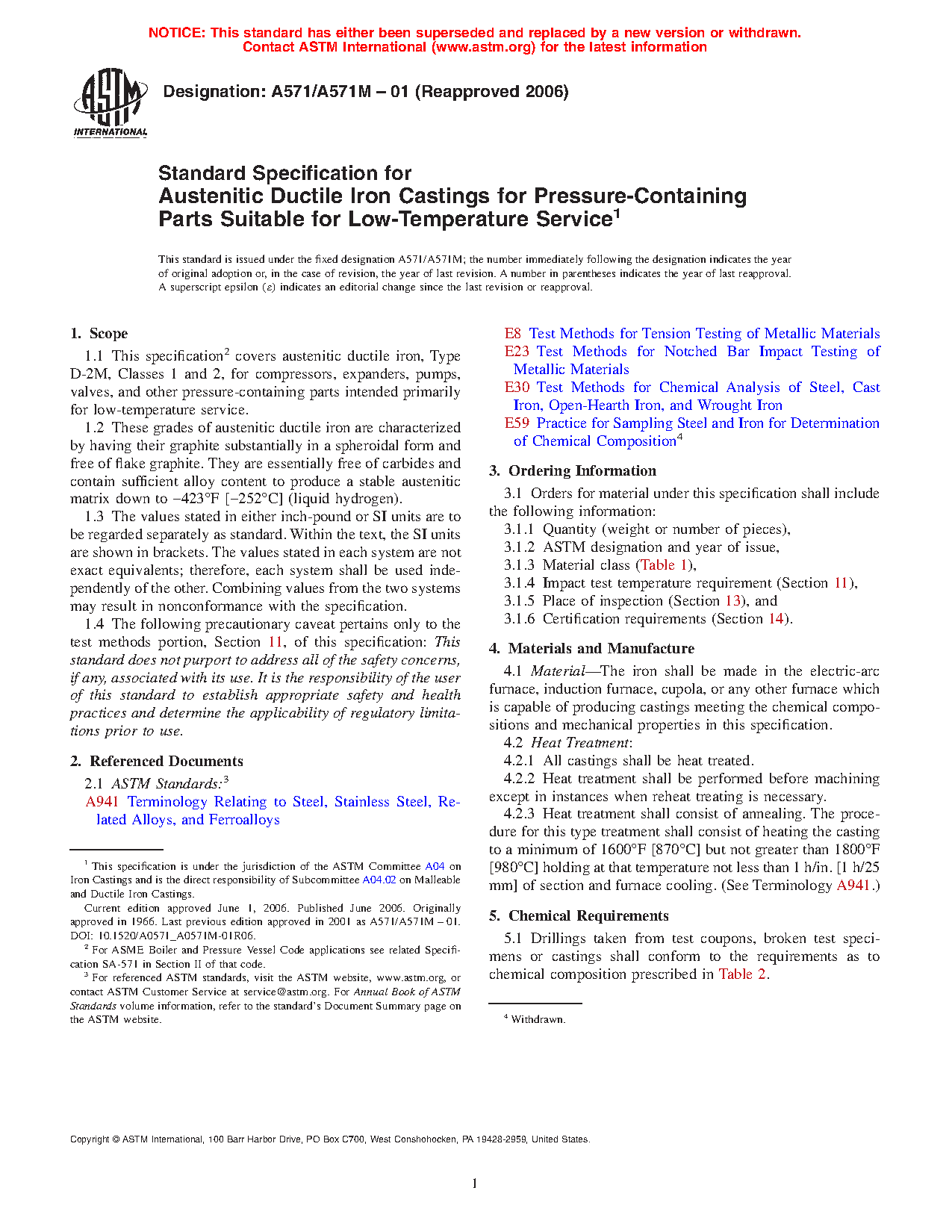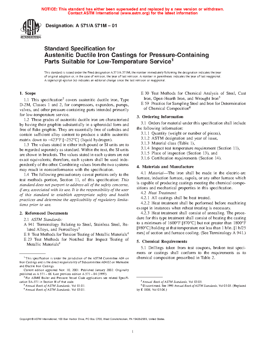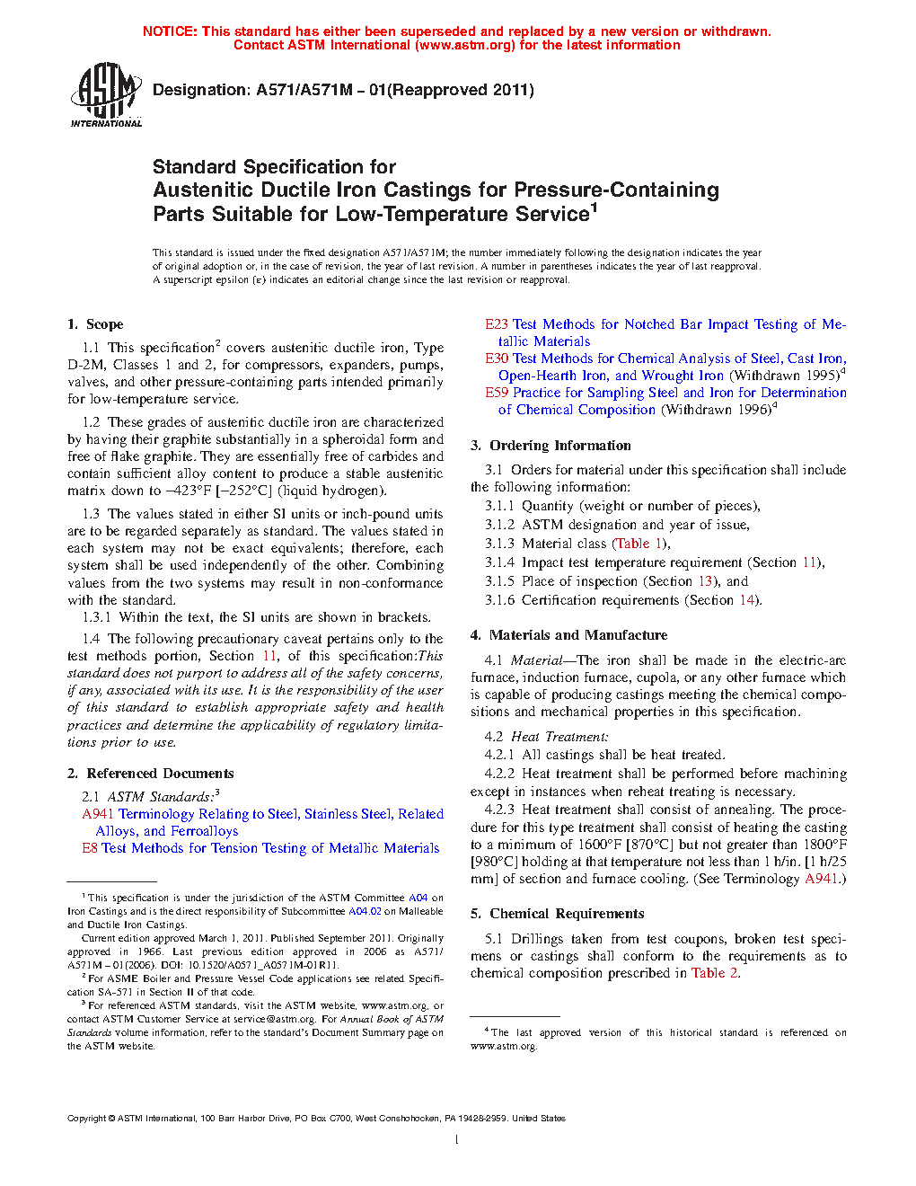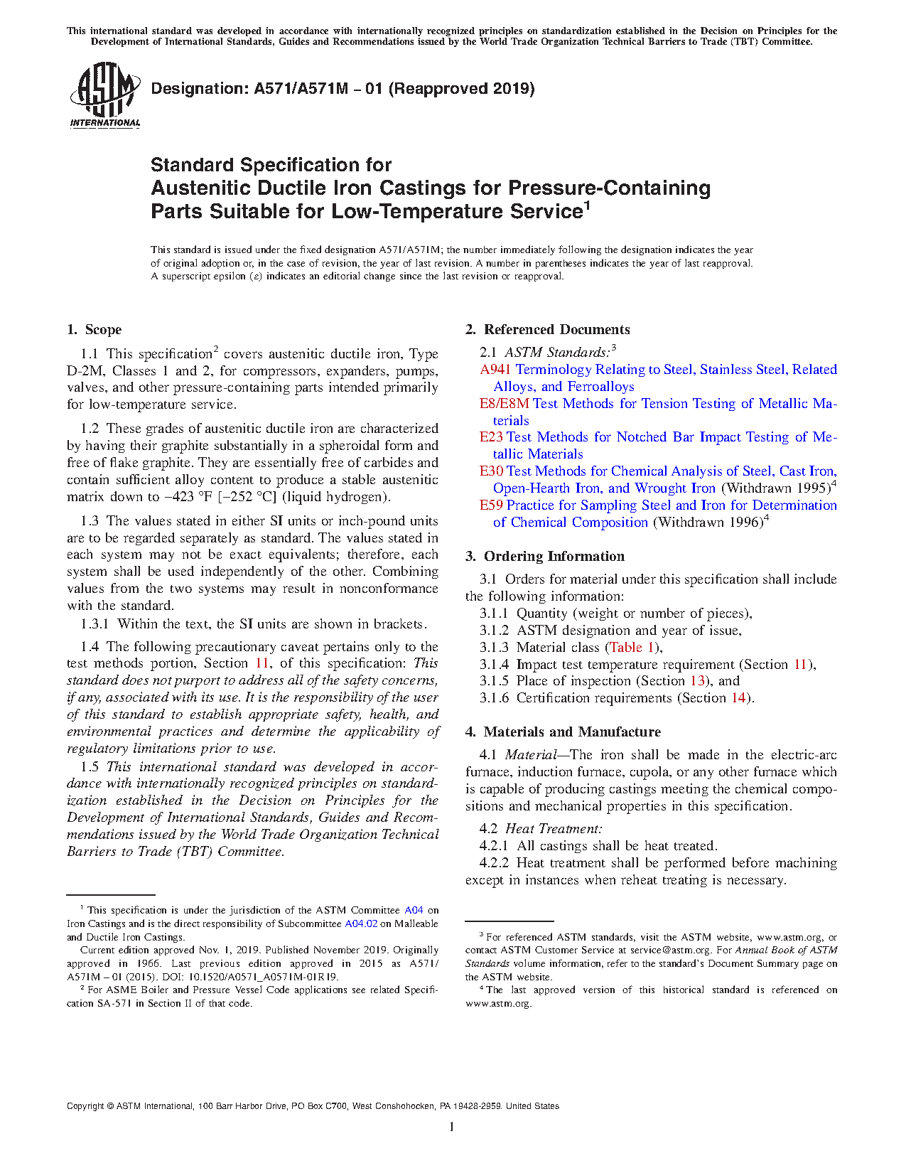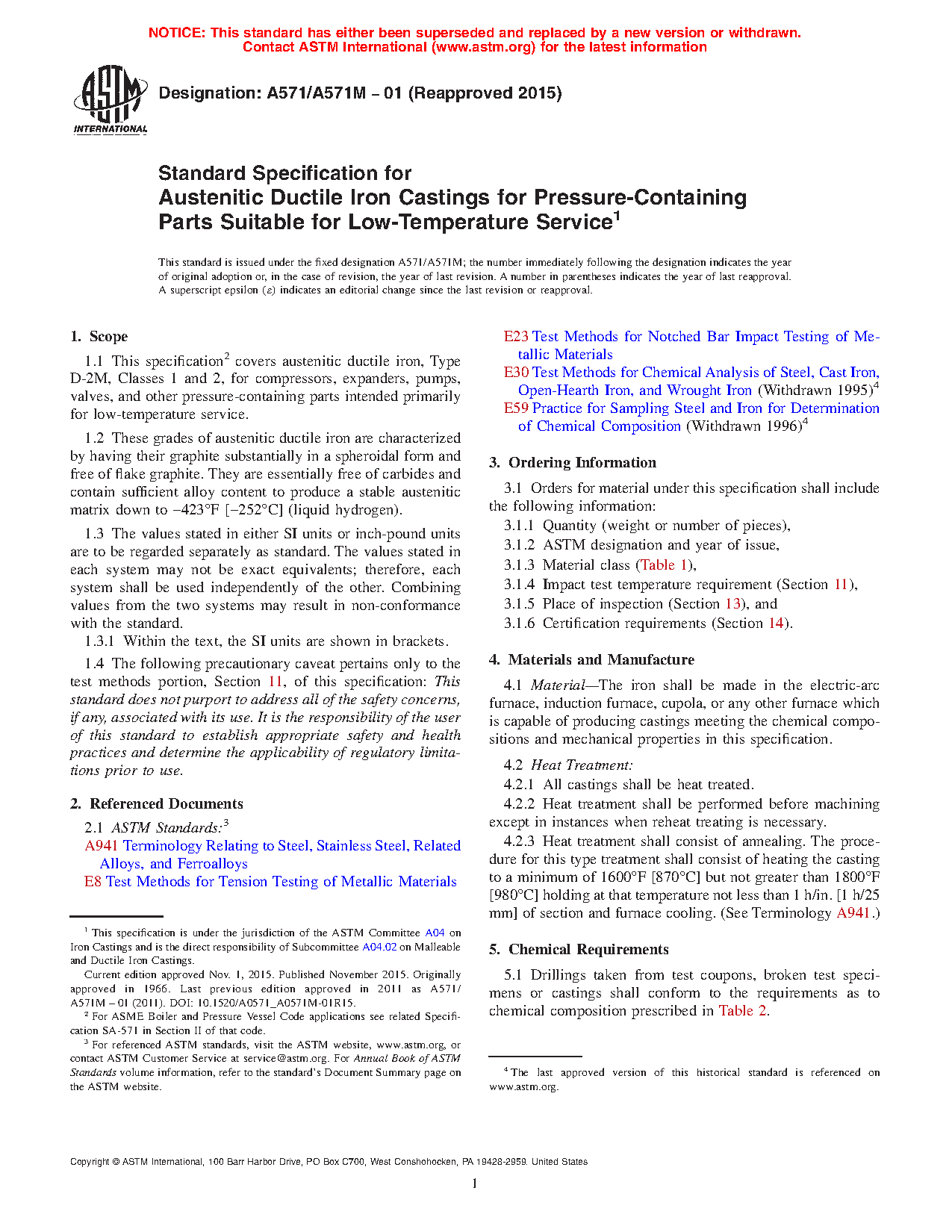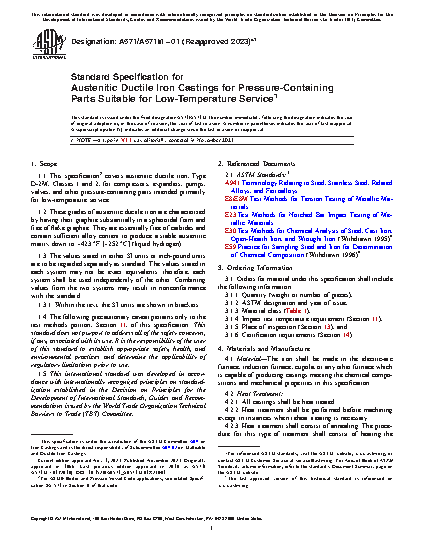 1.1 This specification2 covers austenitic ductile iron, Type D-2M, Classes 1 and 2, for compressors, expanders, pumps, valves, and other pressure-containing parts intended primarily for low-temperature service.