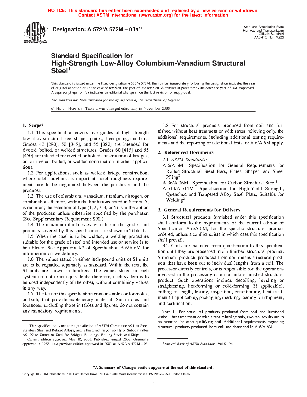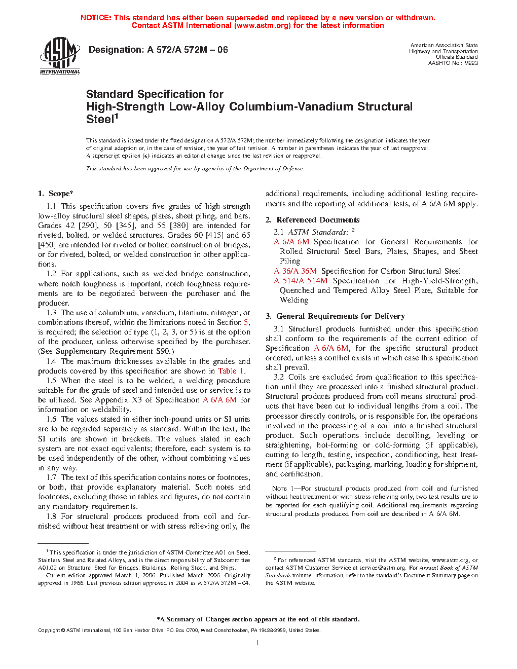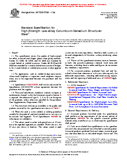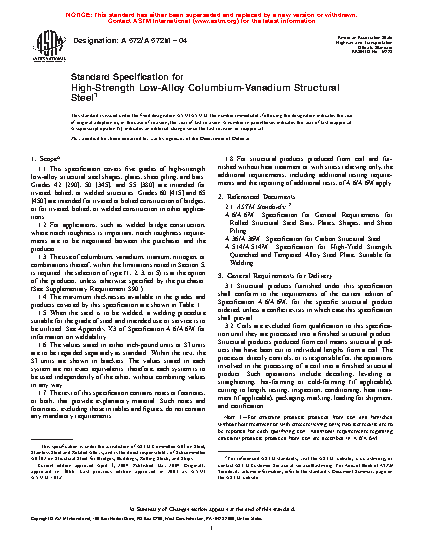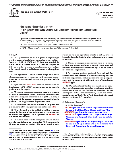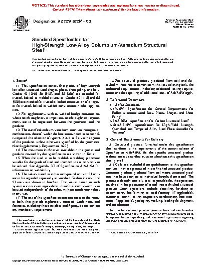 This specifiation covers the standard requirements for Grades 42 [290], 50 [345], 55 [380], 60 [415], and 65 [450] of high-strength low-alloy columbium-vanadium structural steel shapes, plates, sheet piling, and bars for applications in bolted, welded, and riveted structures in bridges and buildings. The alloy shall conform to the required contents of columbium, vanadium, titanium, and nitrogen. Permissible values for the product thickness and size is given. Tensile requirements (including yield point, tensile strength, and minimum elongation) and alloy content are also specified. General delivery and test report requirements are also cited.