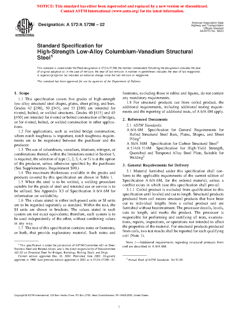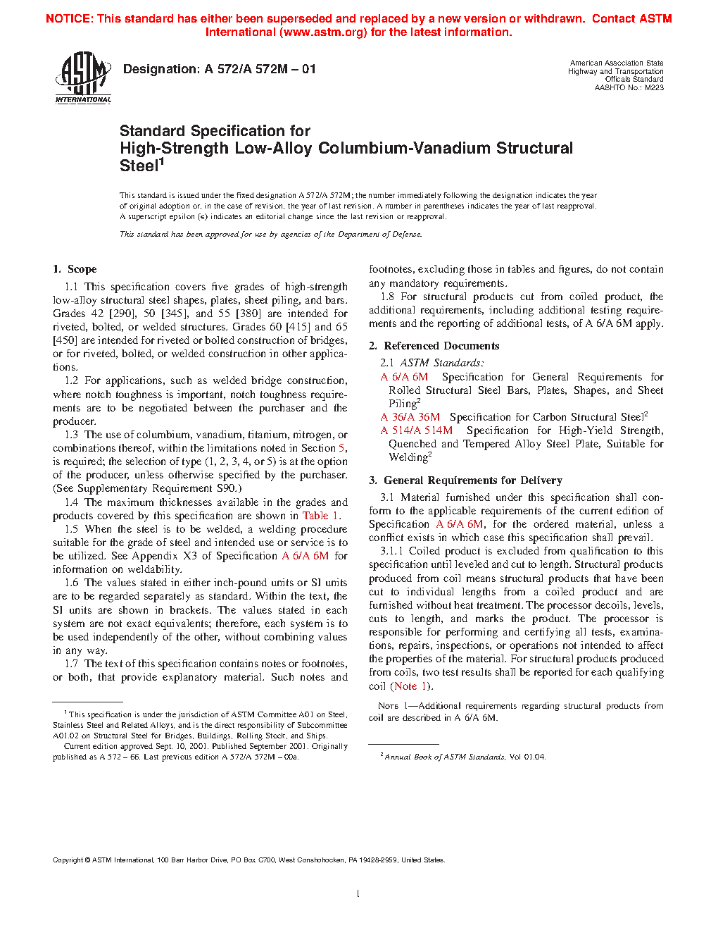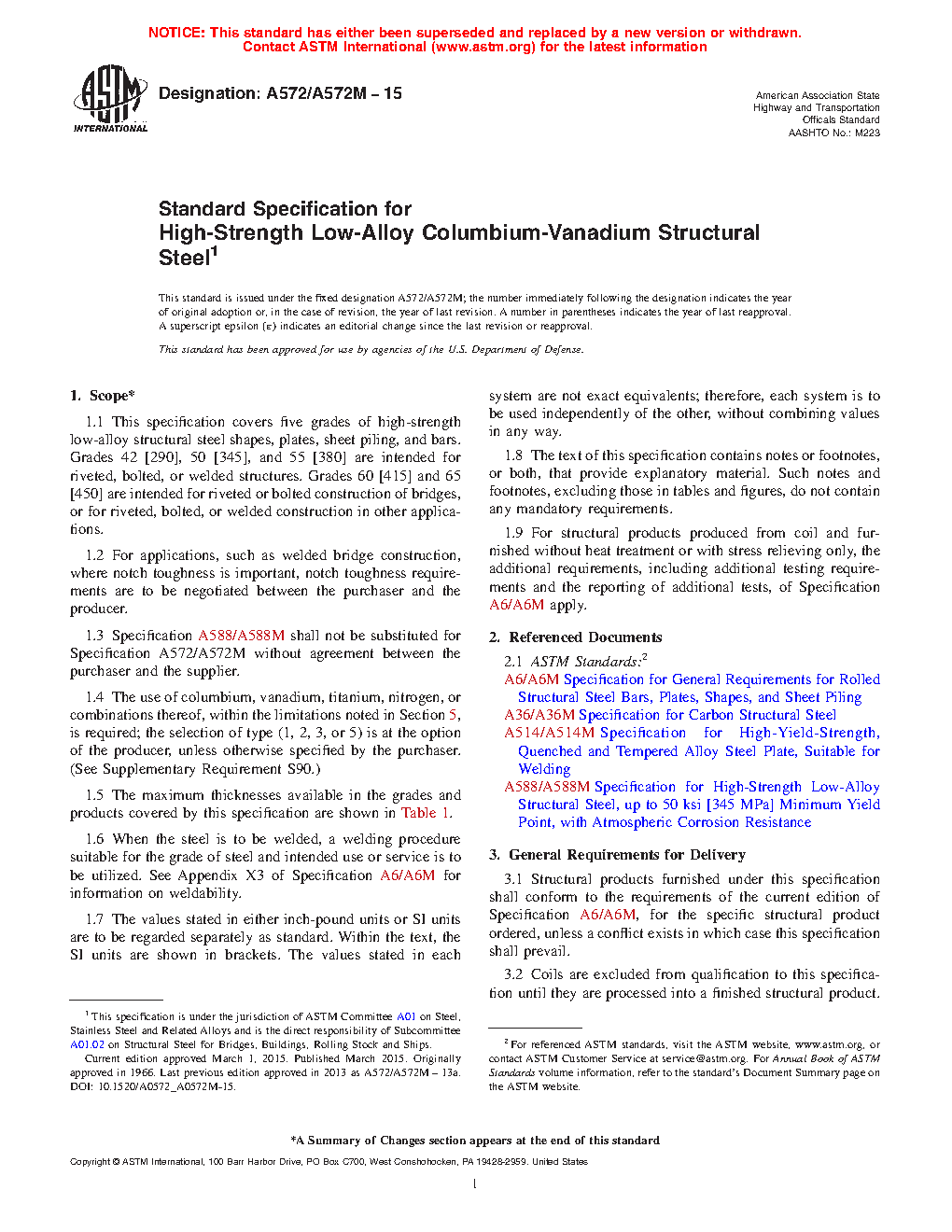 This specifiation covers the standard requirements for Grades 42 [290], 50 [345], 55 [380], 60 [415], and 65 [450] of high-strength low-alloy columbium-vanadium structural steel shapes, plates, sheet piling, and bars for applications in bolted, welded, and riveted structures in bridges and buildings. The alloy shall conform to the required contents of columbium, vanadium, titanium, and nitrogen. Permissible values for the product thickness and size is given. Tensile requirements (including yield point, tensile strength, and minimum elongation) and alloy content are also specified. General delivery and test report requirements are also cited.