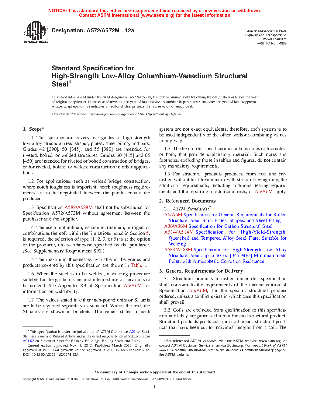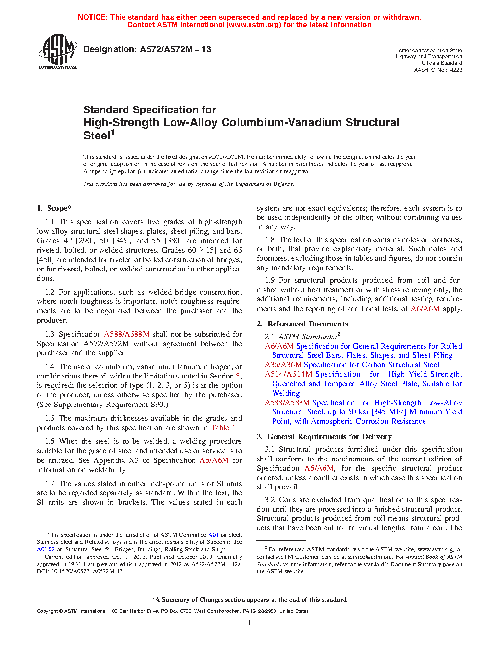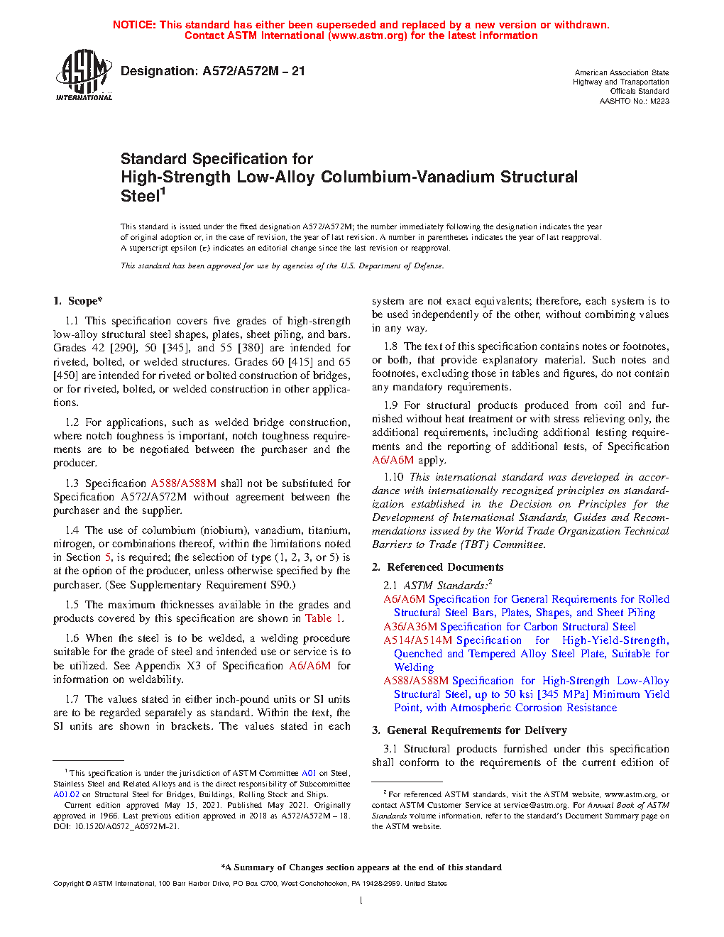 1.1 This specification covers five grades of high-strength low-alloy structural steel shapes, plates, sheet piling, and bars. Grades 42 [290], 50 [345], and 55 [380] are intended for riveted, bolted, or welded structures. Grades 60 [415] and 65 [450] are intended for riveted or bolted construction of bridges, or for riveted, bolted, or welded construction in other applications.
