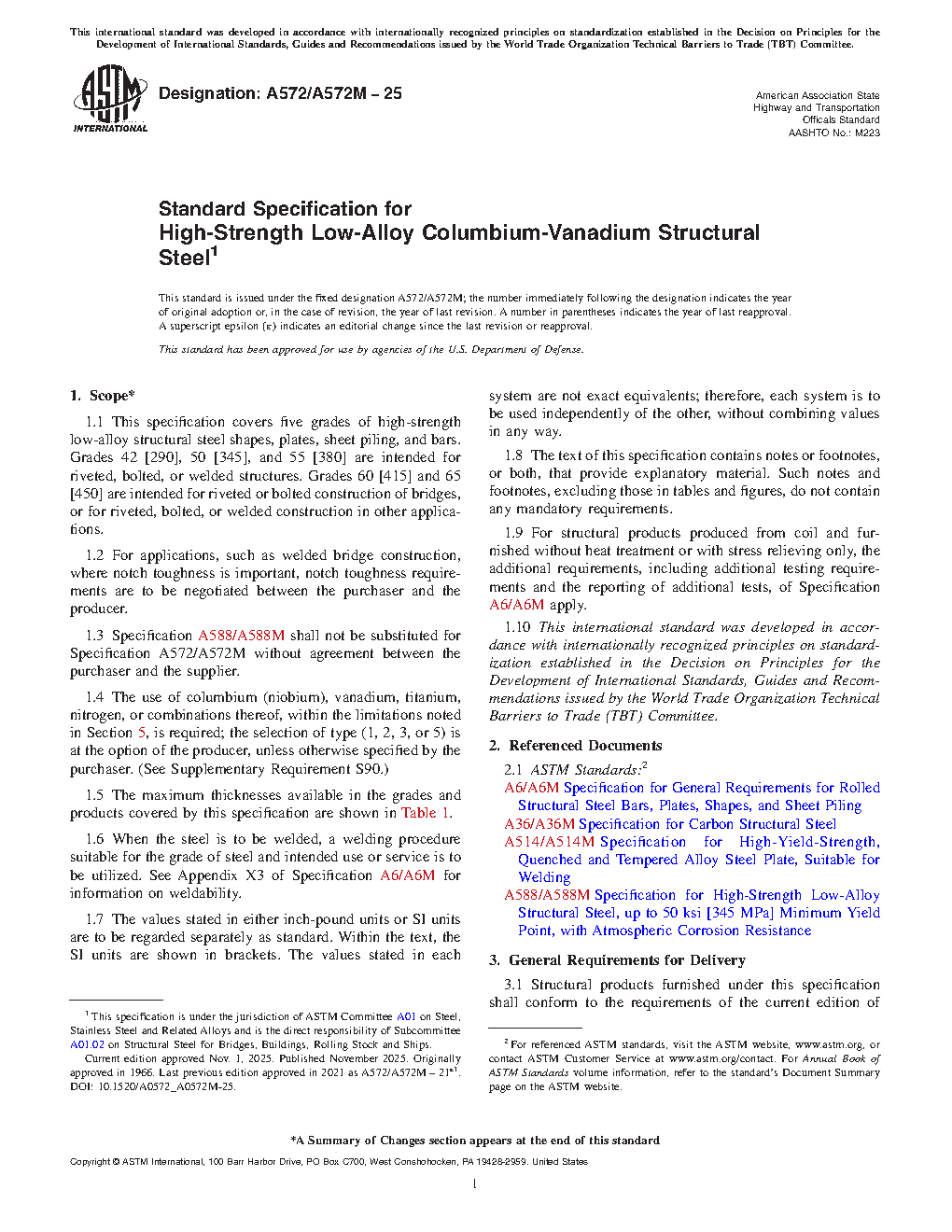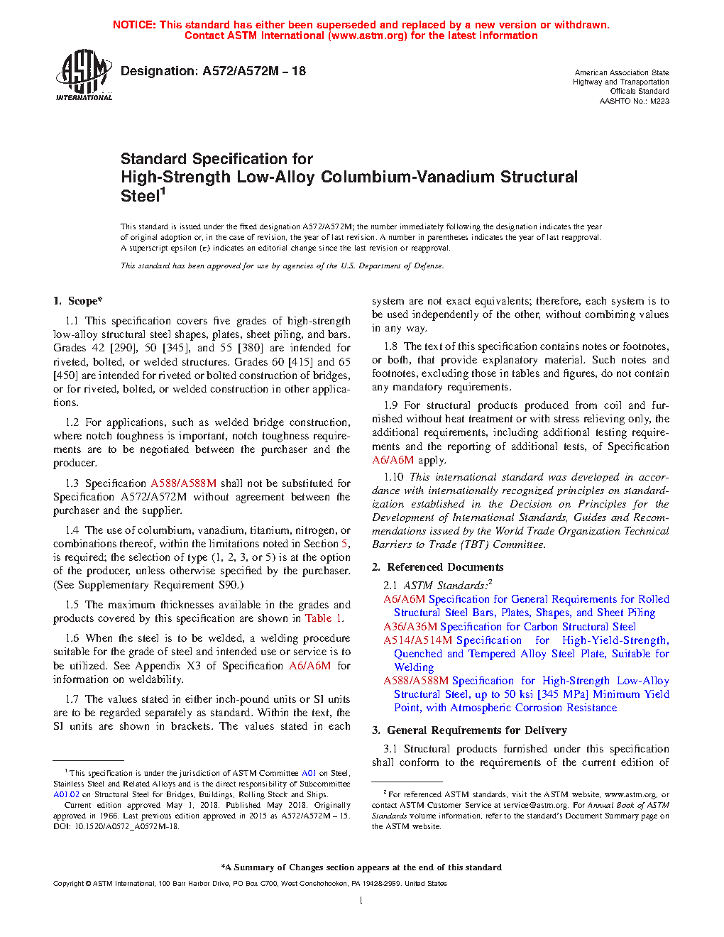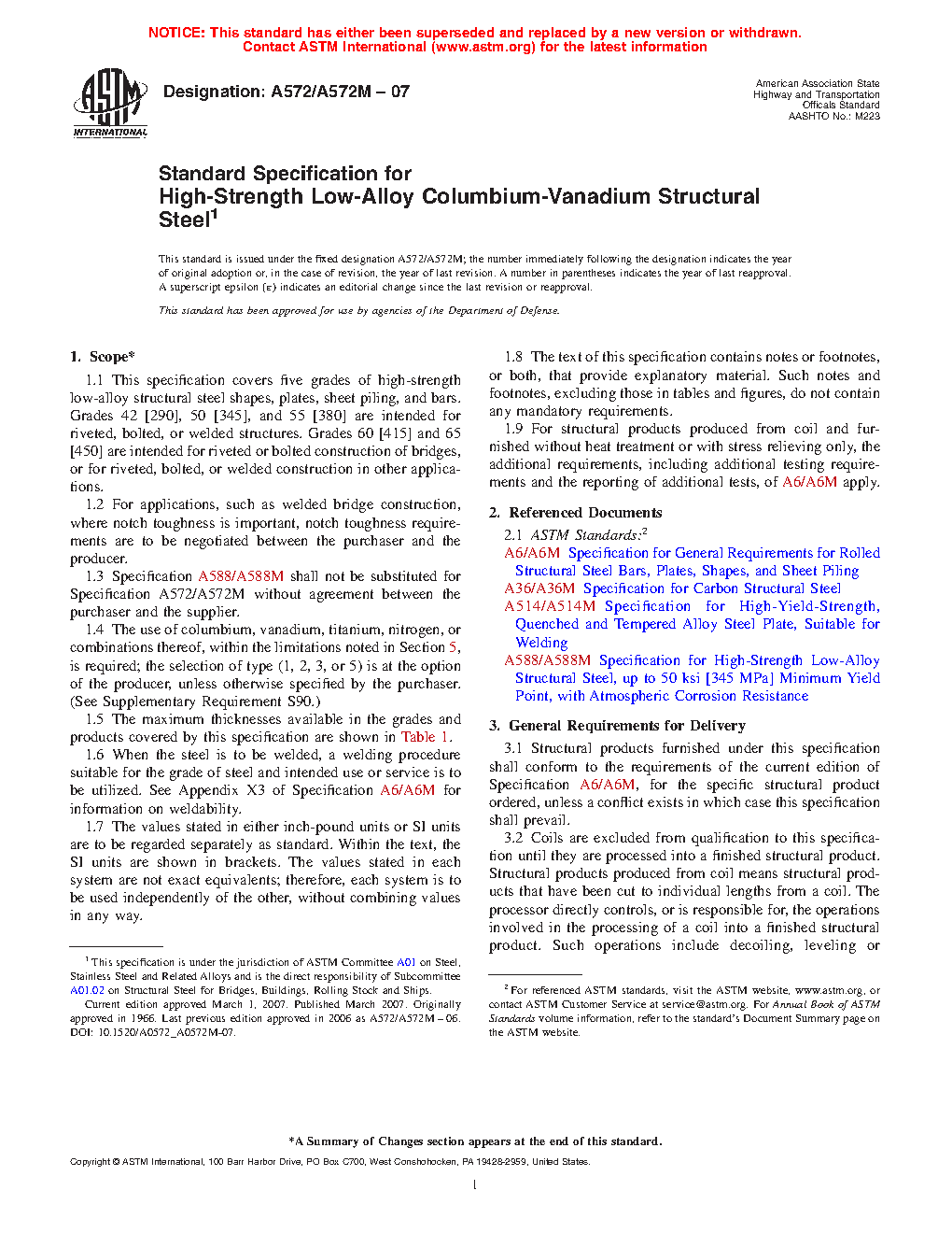 1.1 This specification covers five grades of high-strength low-alloy structural steel shapes, plates, sheet piling, and bars. Grades 42 [290], 50 [345], and 55 [380] are intended for riveted, bolted, or welded structures. Grades 60 [415] and 65 [450] are intended for riveted or bolted construction of bridges, or for riveted, bolted, or welded construction in other applications.