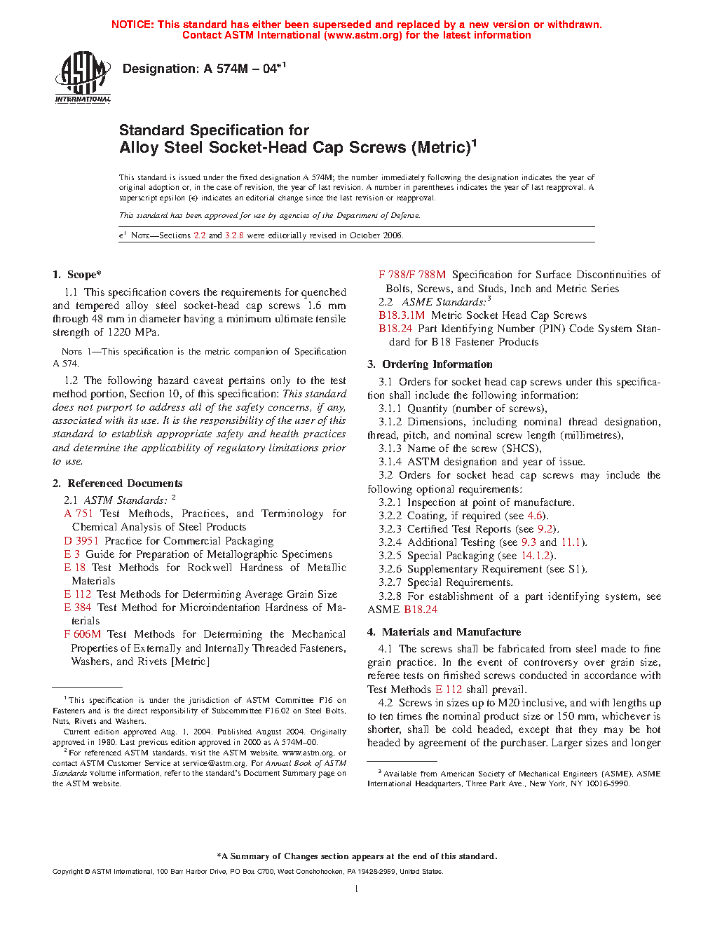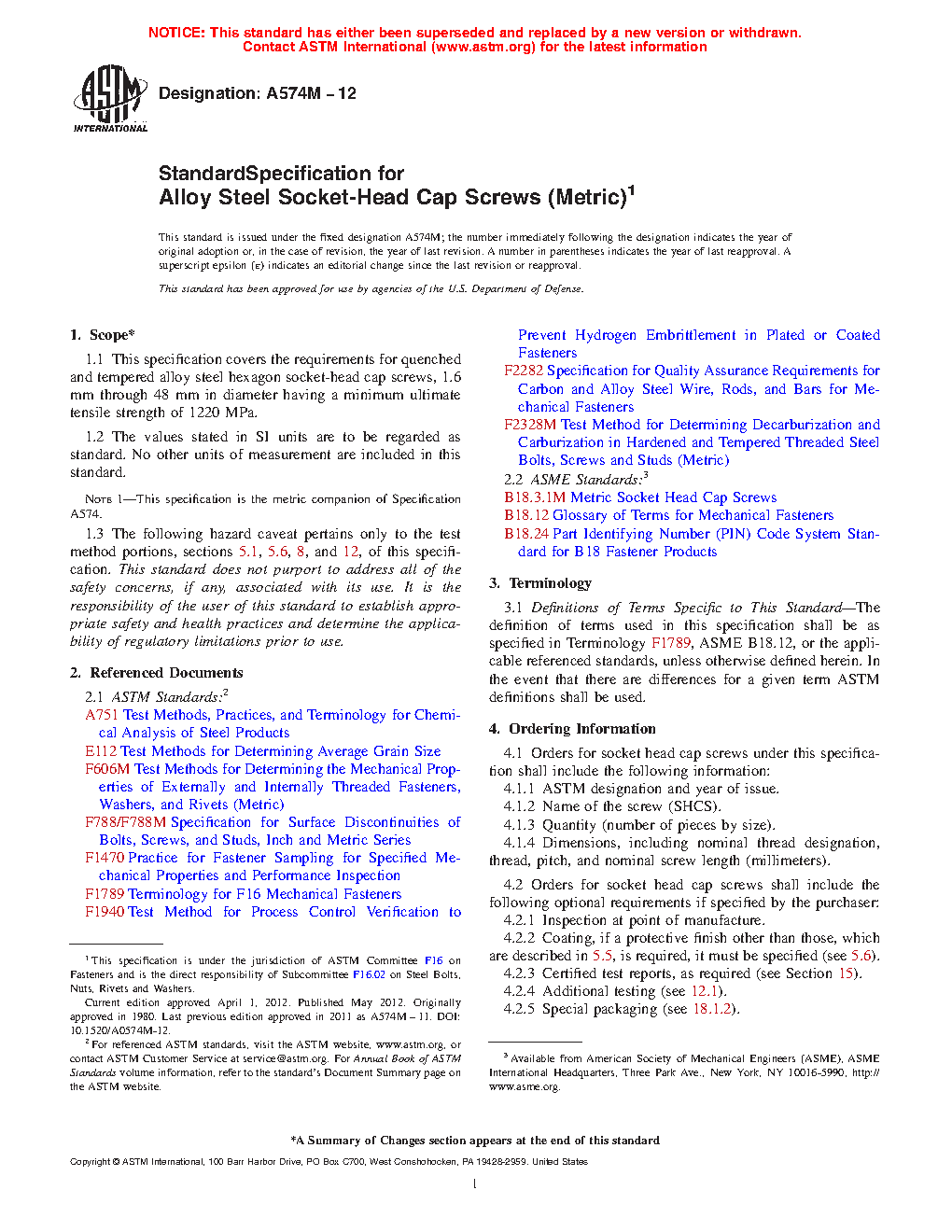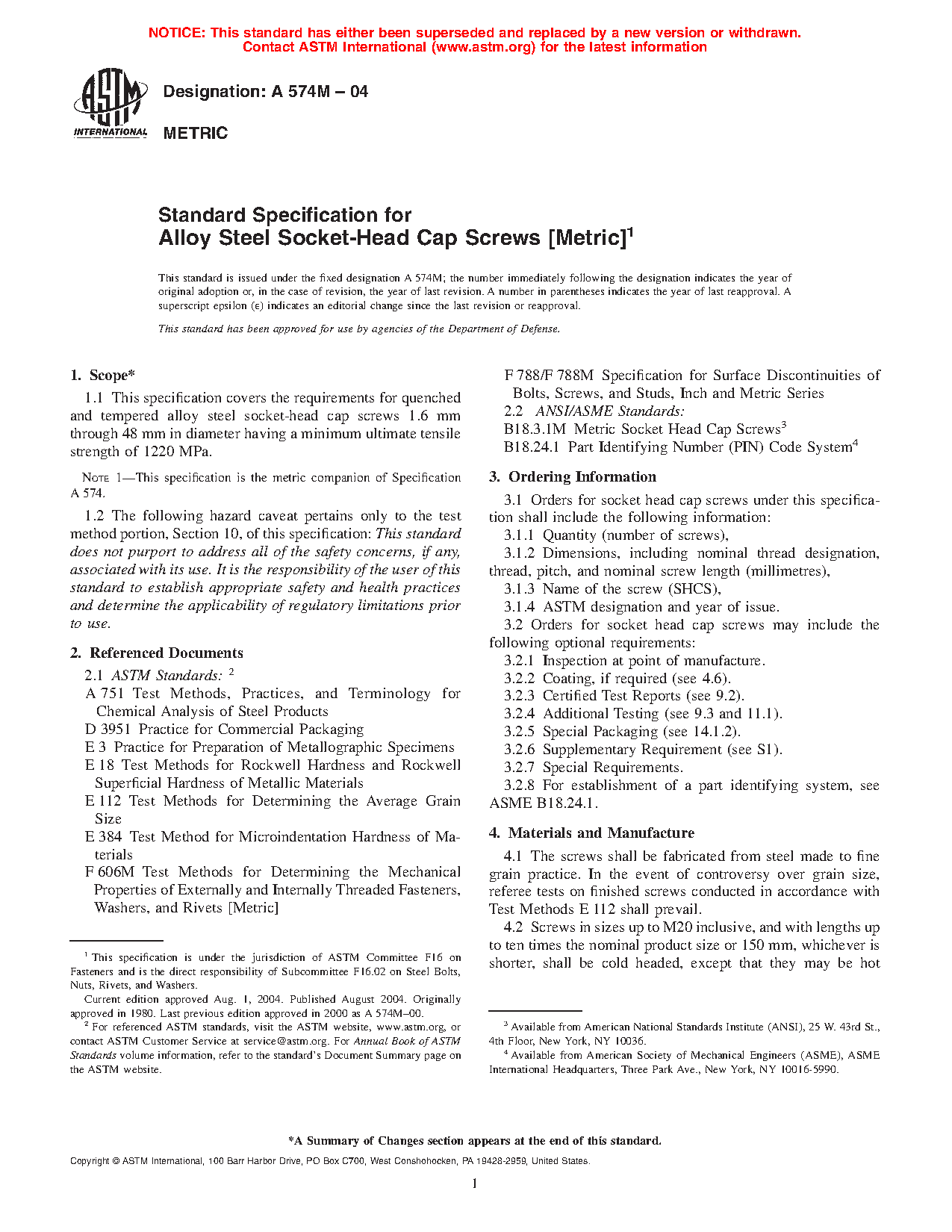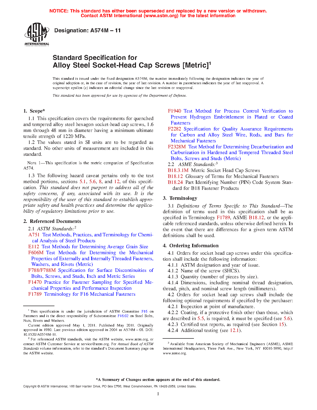 1.1 This specification covers the requirements for quenched and tempered alloy steel socket-head cap screws
