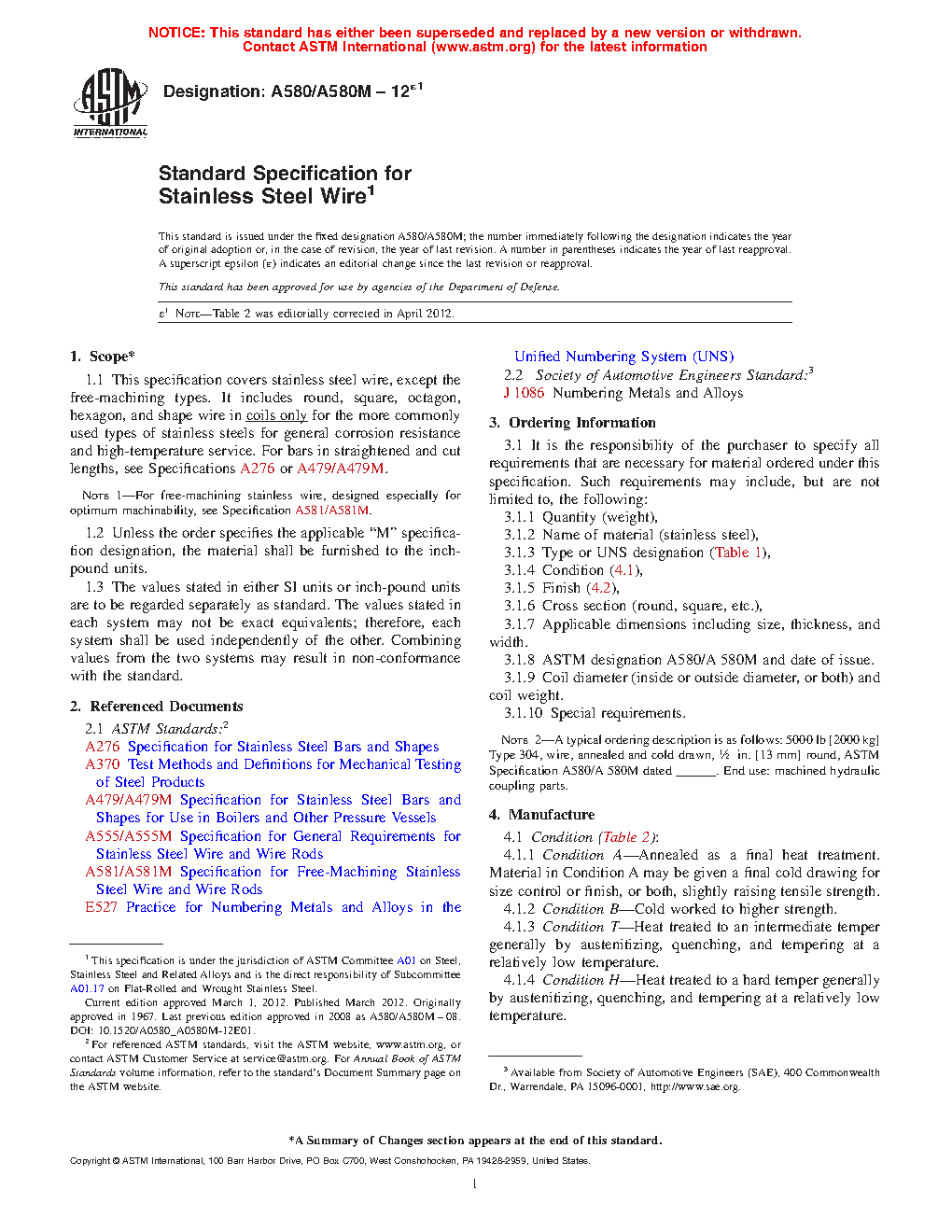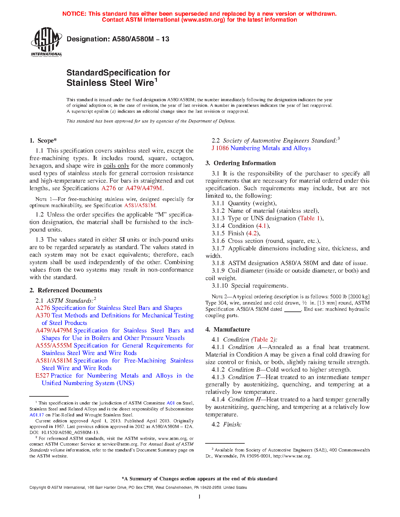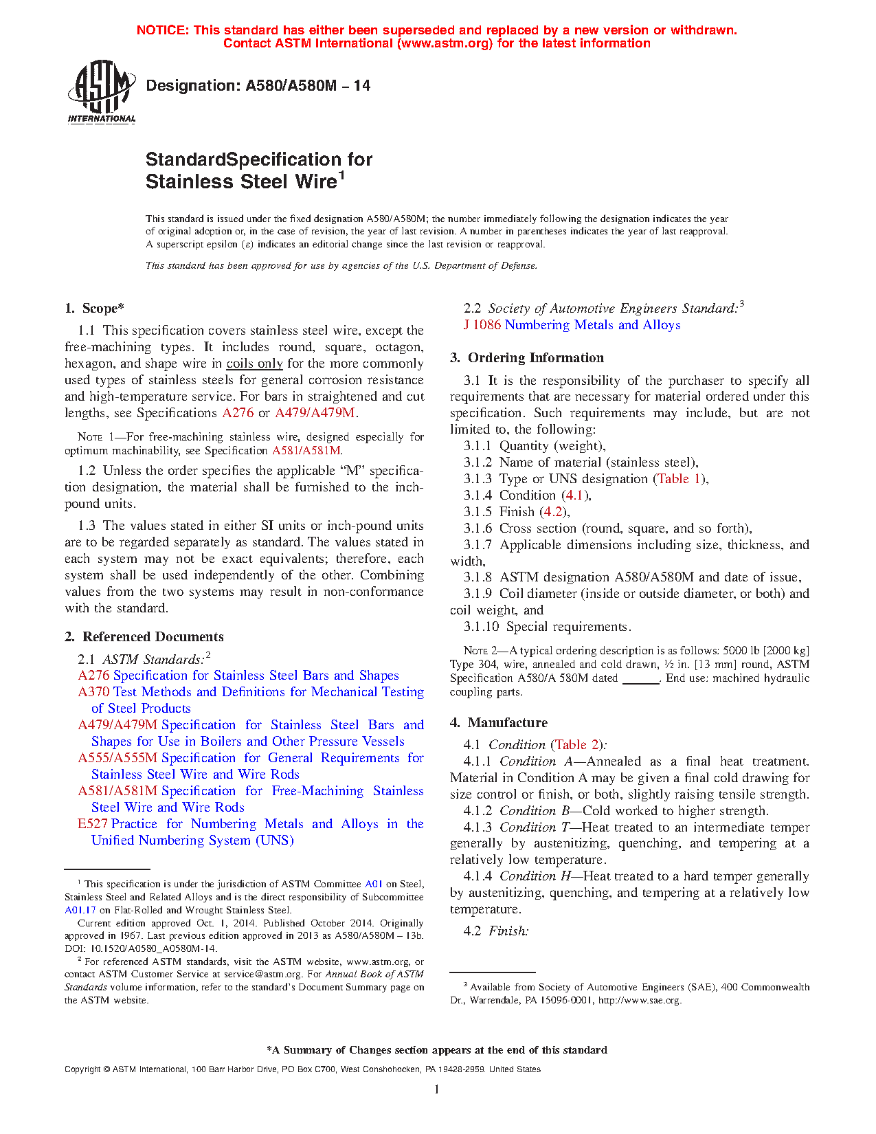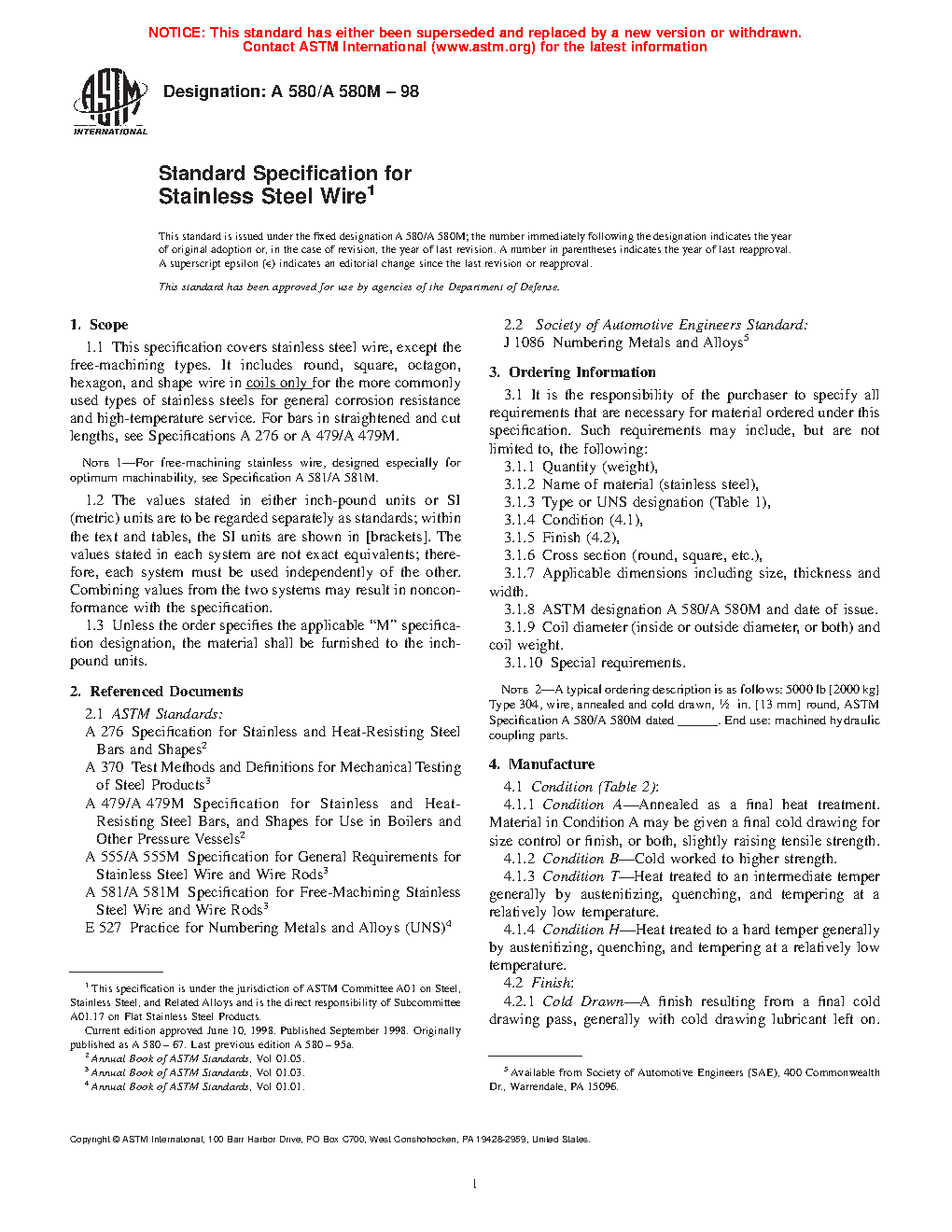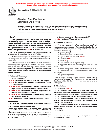 Note 1: For free-machining stainless wire, designed especially for optimum machinability, see Specification A581/A581M.