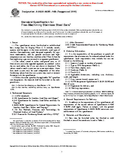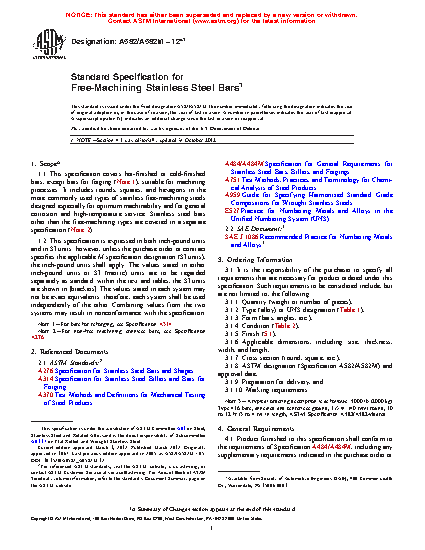 1.1 This specification covers hot-finished or cold-finished bars, except bars for forging (Note 1), suitable for machining processes. It includes rounds, squares, and hexagons in the more commonly used types of stainless free-machining steels designed especially for optimum machinability and for general corrosion and high-temperature service. Stainless steel bars other than the free-machining types are covered in a separate specification (Note 2).