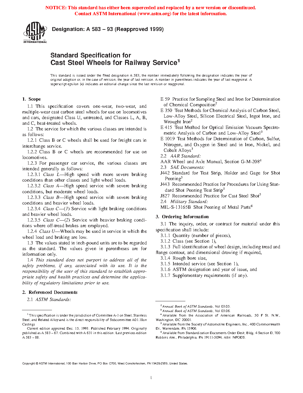 1.1 This specification covers one-wear, two-wear, and multiple-wear cast carbon steel wheels for use on locomotives and cars, designated Class U, untreated, and Classes L, A, B, and C, heat-treated wheels.