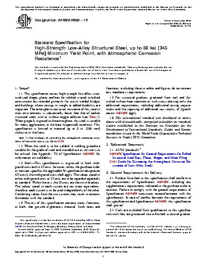1.1 This specification covers high-strength low-alloy structural steel shapes, plates, and bars for welded, riveted, or bolted construction but intended primarily for use in welded bridges and buildings where savings in weight or added durability are important. The atmospheric corrosion resistance of this steel in most environments is substantially better than that of carbon structural steels with or without copper addition (see Note 0). When properly exposed to the atmosphere, this steel is suitable for many applications in the bare (unpainted) condition. This specification is limited to material up to 8 in. [200 mm] inclusive in thickness. Note 0For methods of estimating the atmospheric corrosion resistance of low-alloy steels, see Guide G 101.