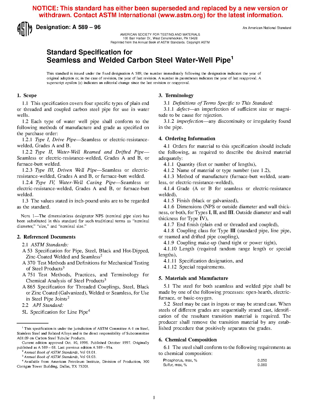 1.2.2 Type II, Water-Well Reamed and Drifted Pipe—Seamless or electric-resistance-welded, Grades A and B, or furnace-butt welded.