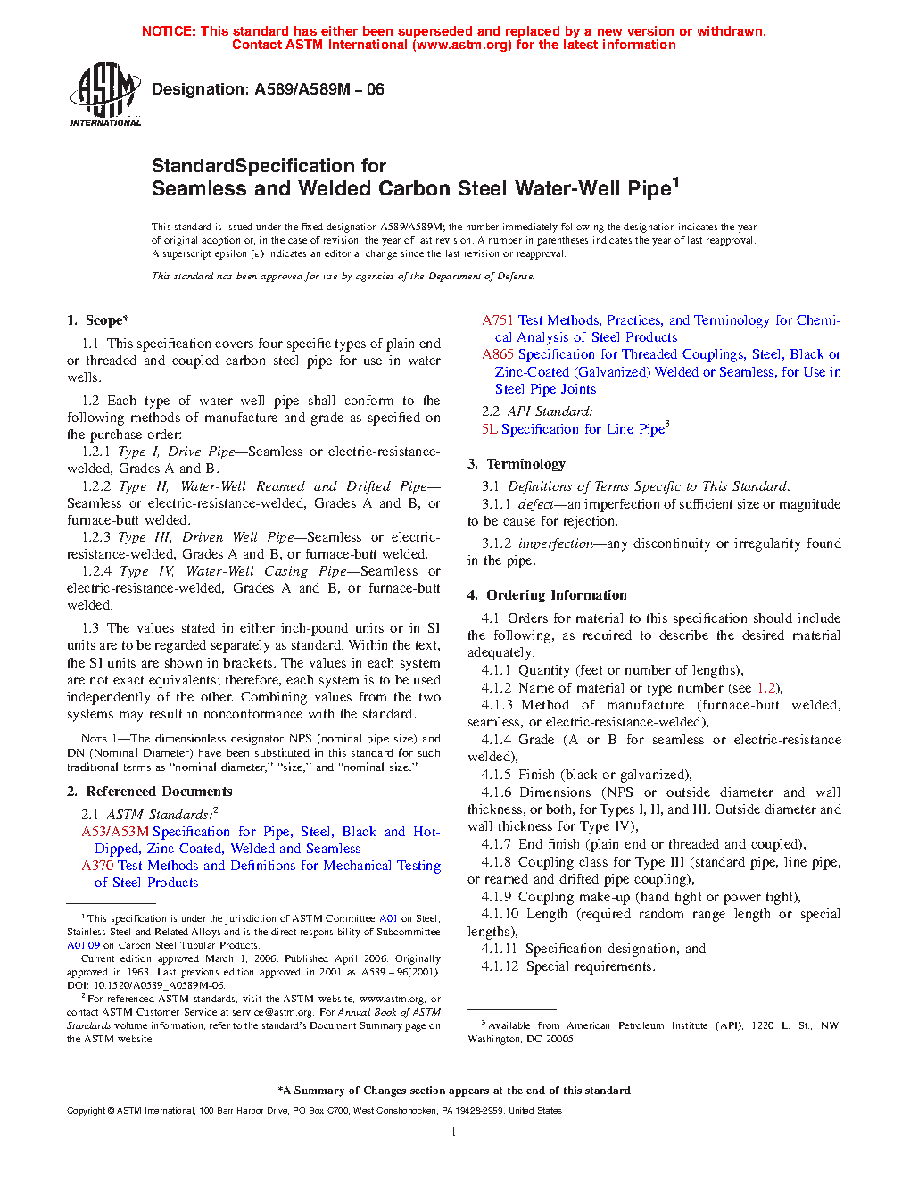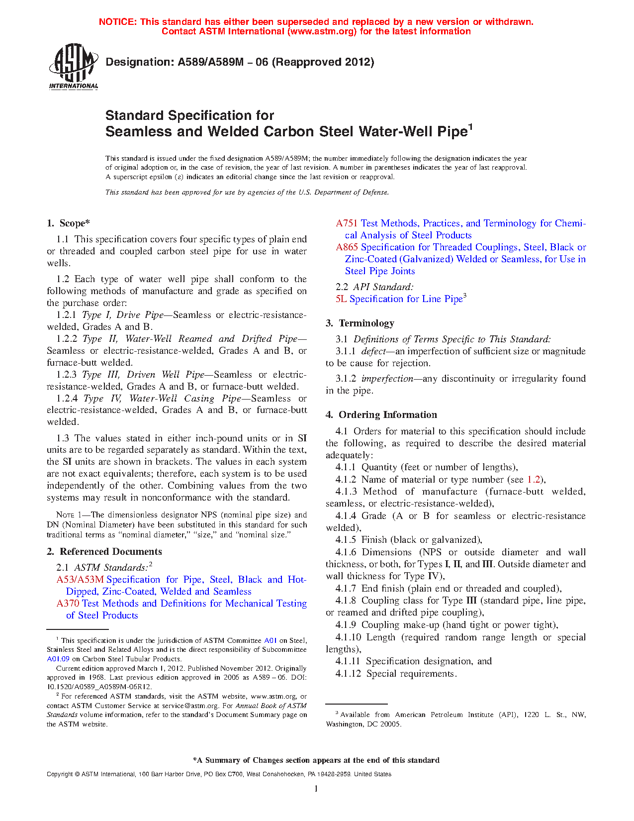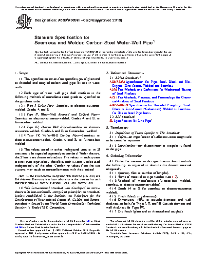 1.1 This specification covers four specific types of plain end or threaded and coupled carbon steel pipe for use in water wells.