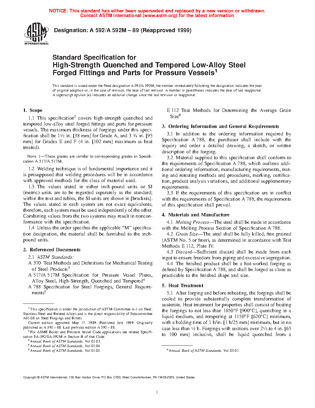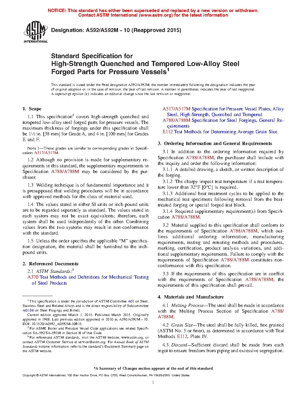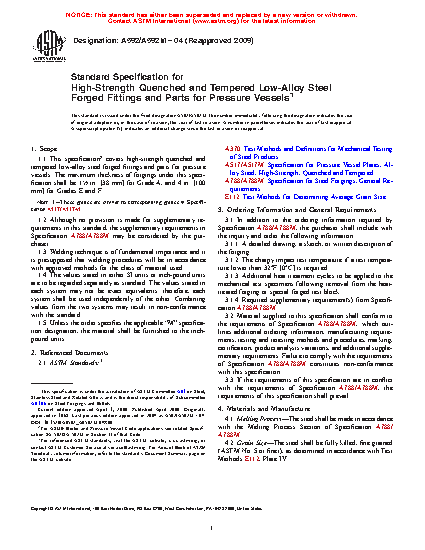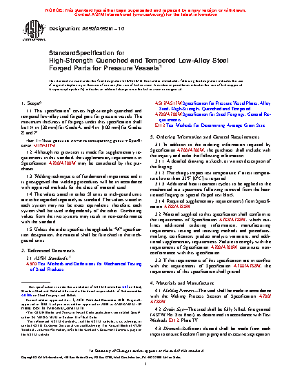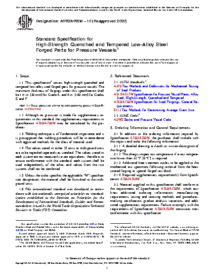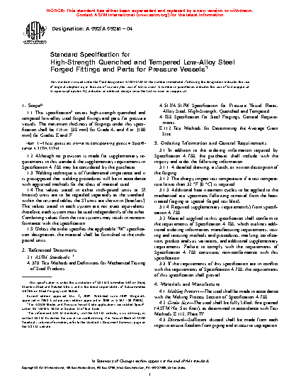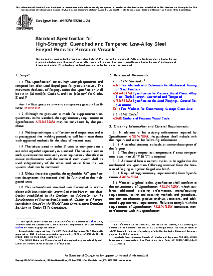 1.1 This specification2 covers high-strength quenched and tempered low-alloy steel forged parts for pressure vessels. The maximum thickness of forgings under this specification shall be 11/2 in. [38 mm] for Grade A, and 4 in. [100 mm] for Grades E and F.