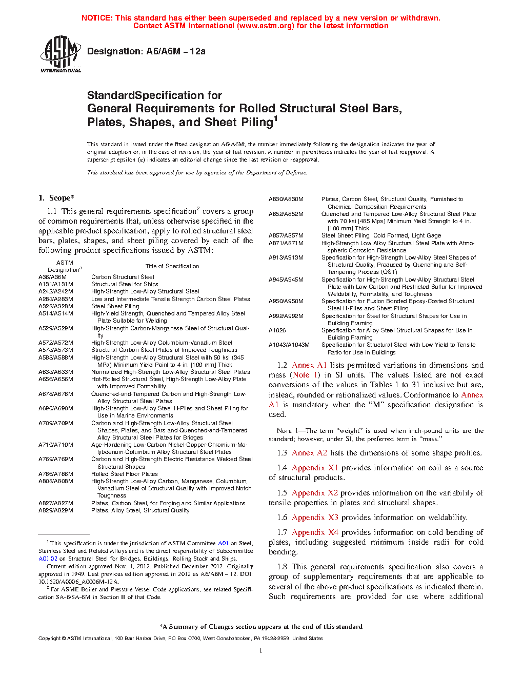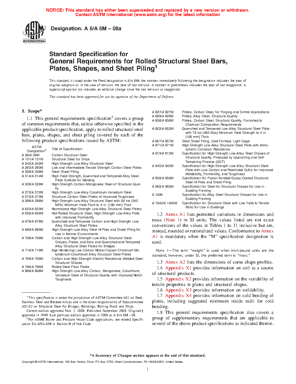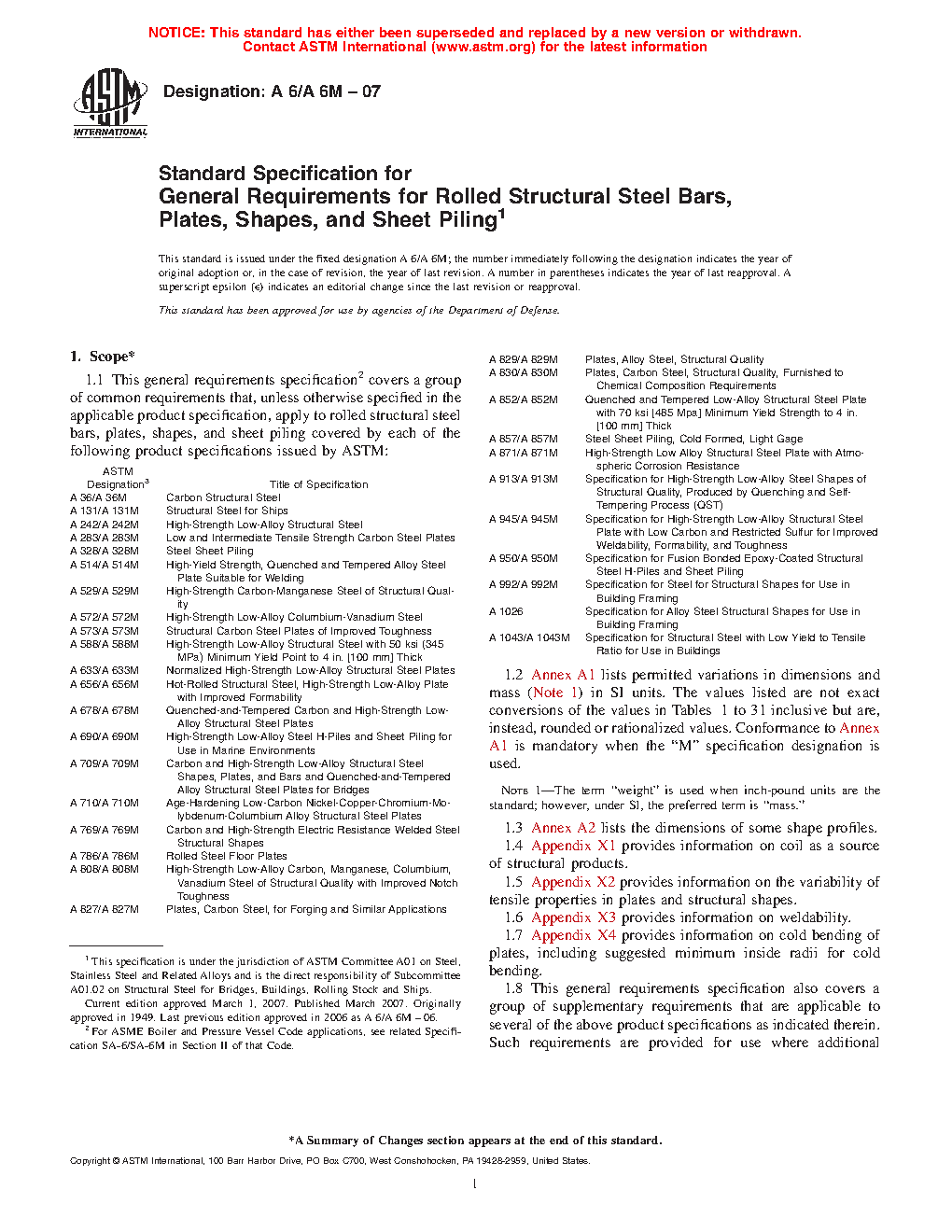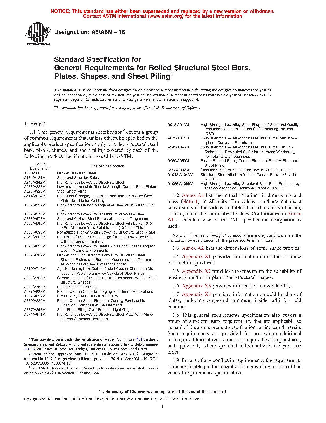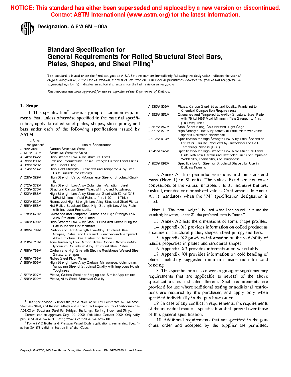 1.1 This general requirements specification2 covers a group of common requirements that, unless otherwise specified in the applicable product specification, apply to rolled structural steel bars, plates, shapes, and sheet piling covered by each of the following product specifications issued by ASTM: