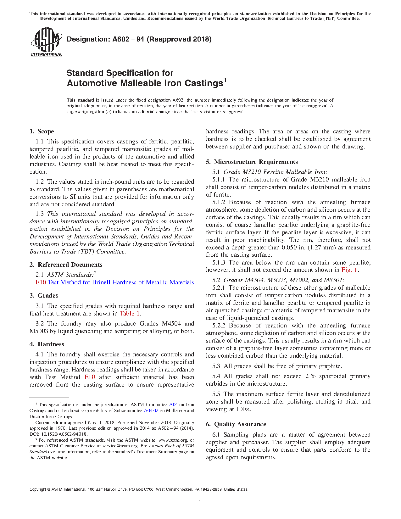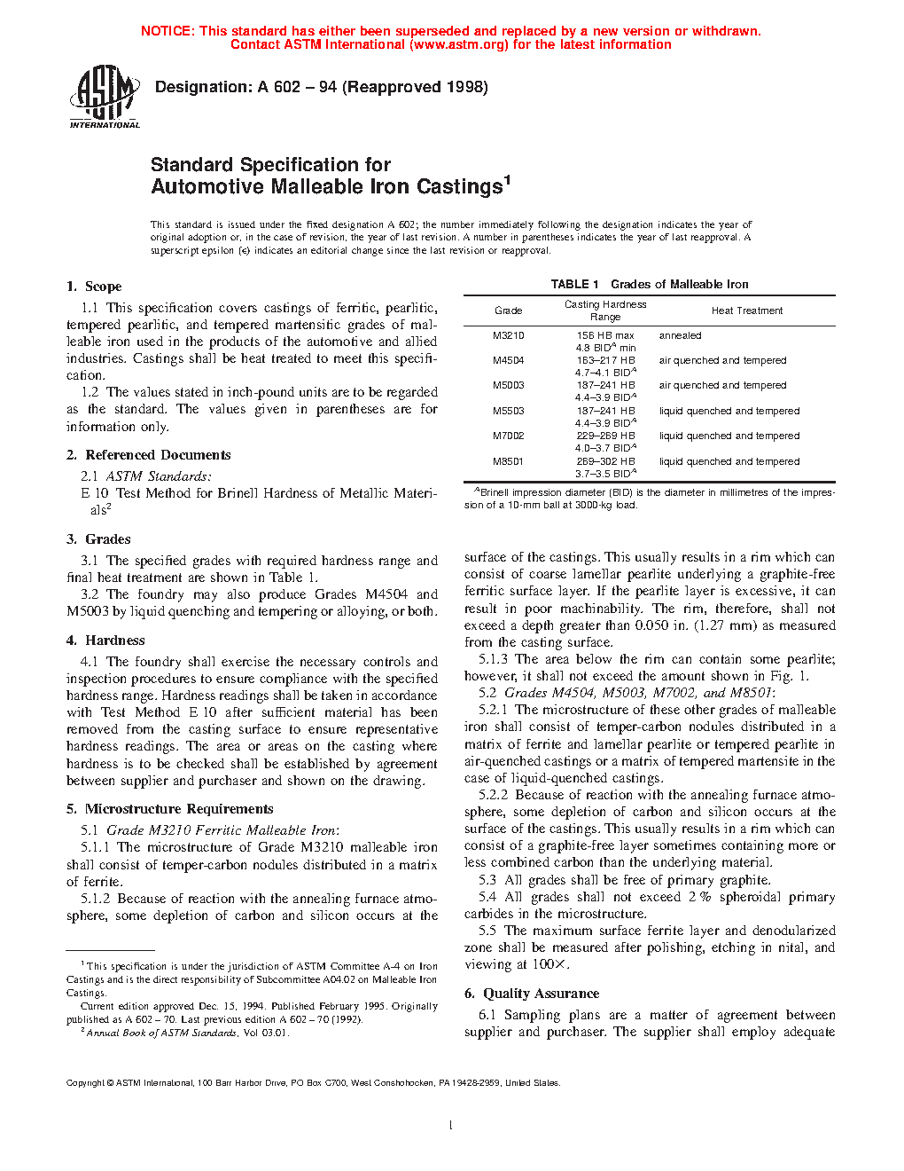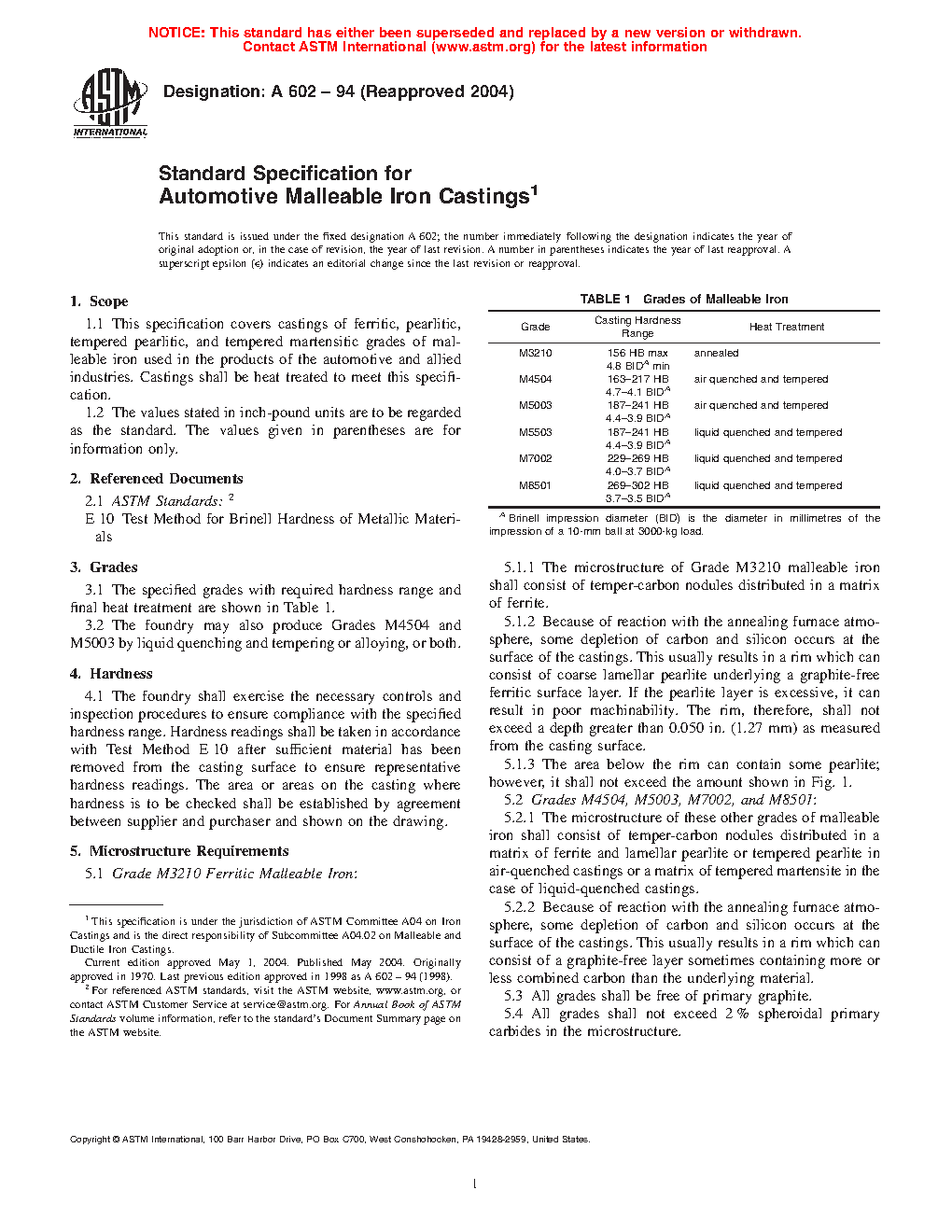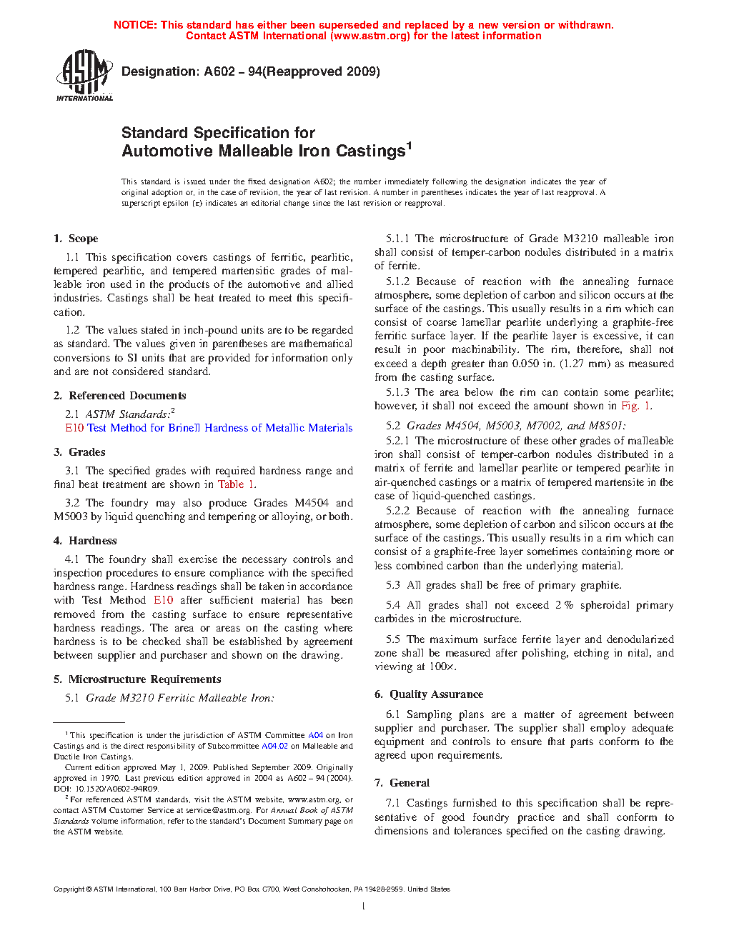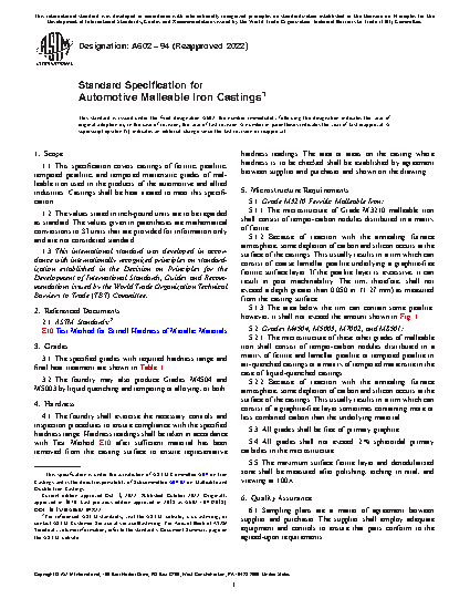 1.1 This specification covers castings of ferritic, pearlitic, tempered pearlitic, and tempered martensitic grades of malleable iron used in the products of the automotive and allied industries. Castings shall be heat treated to meet this specification.
