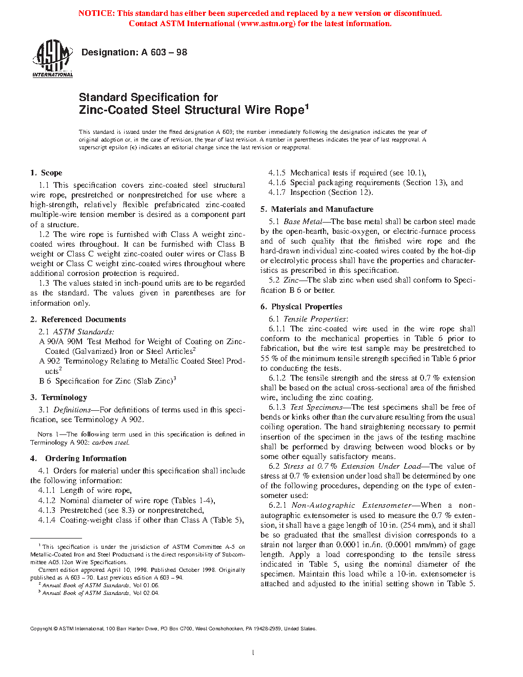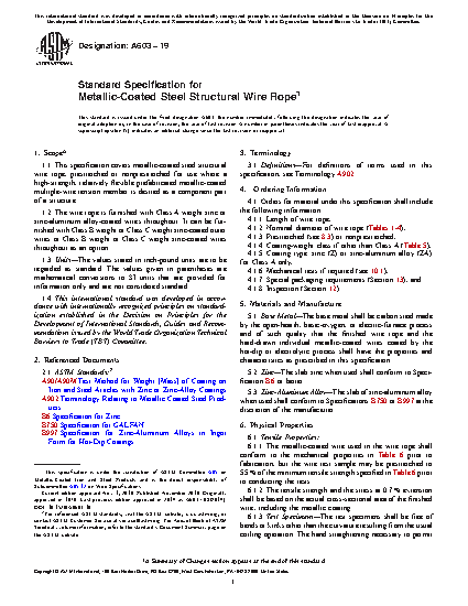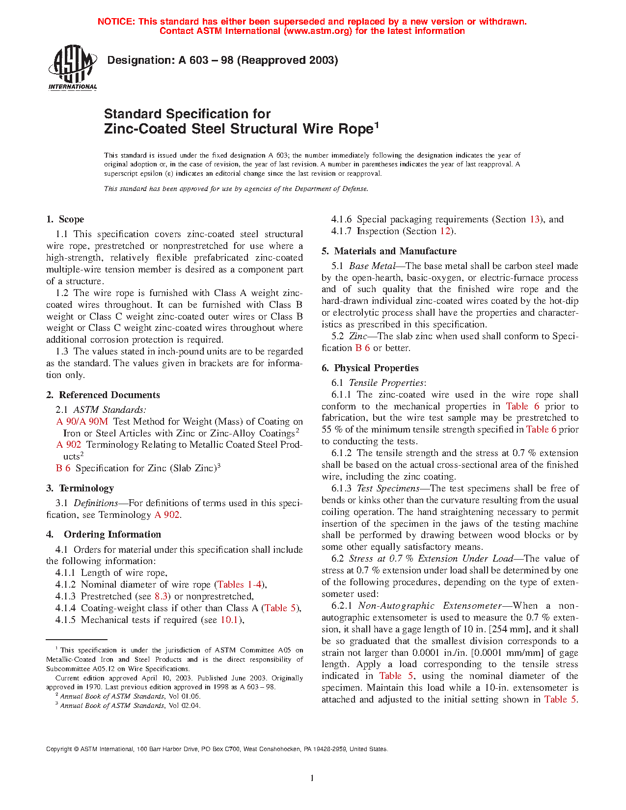 1.1 This specification covers zinc-coated steel structural wire rope, prestretched or nonprestretched for use where a high-strength, relatively flexible prefabricated zinc-coated multiple-wire tension member is desired as a component part of a structure.