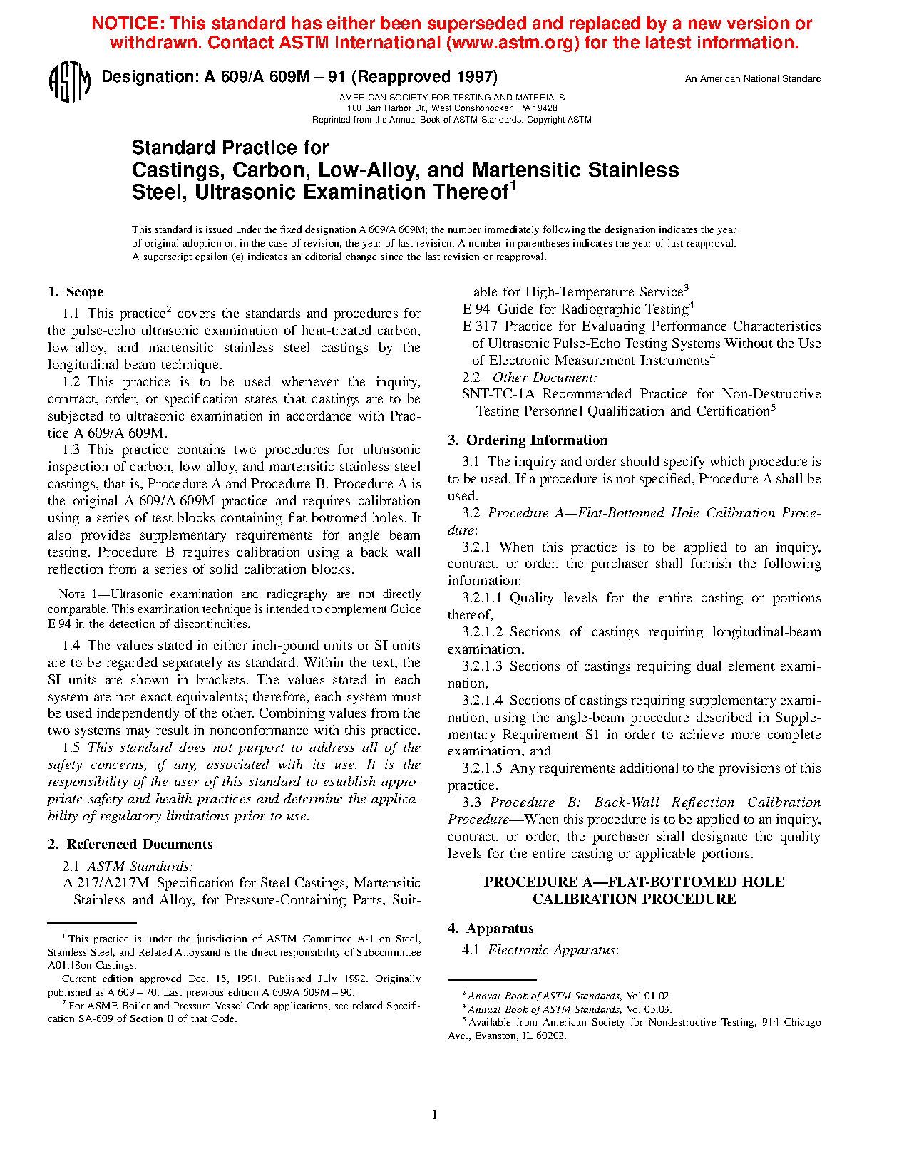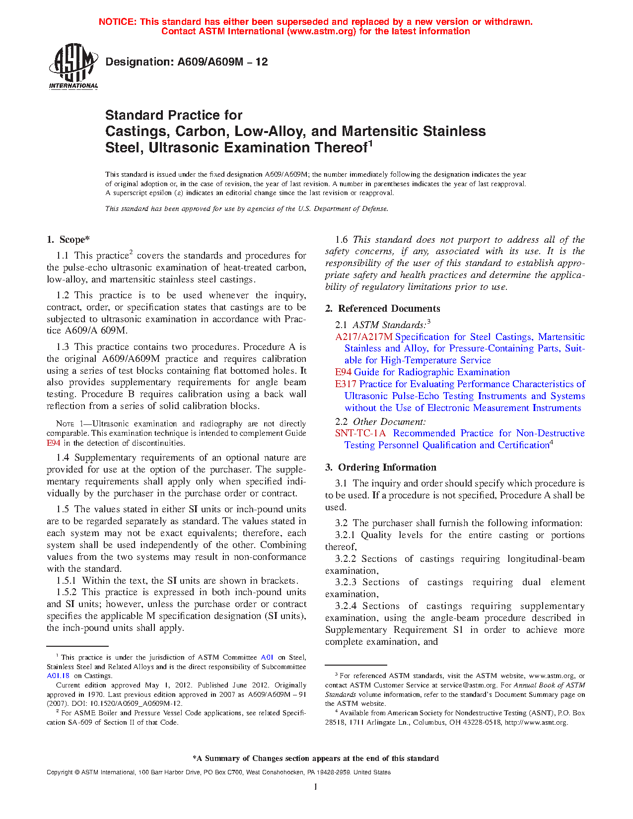1.2 This practice is to be used whenever the inquiry, contract, order, or specification states that castings are to be subjected to ultrasonic examination in accordance with Practice A609/A609M.